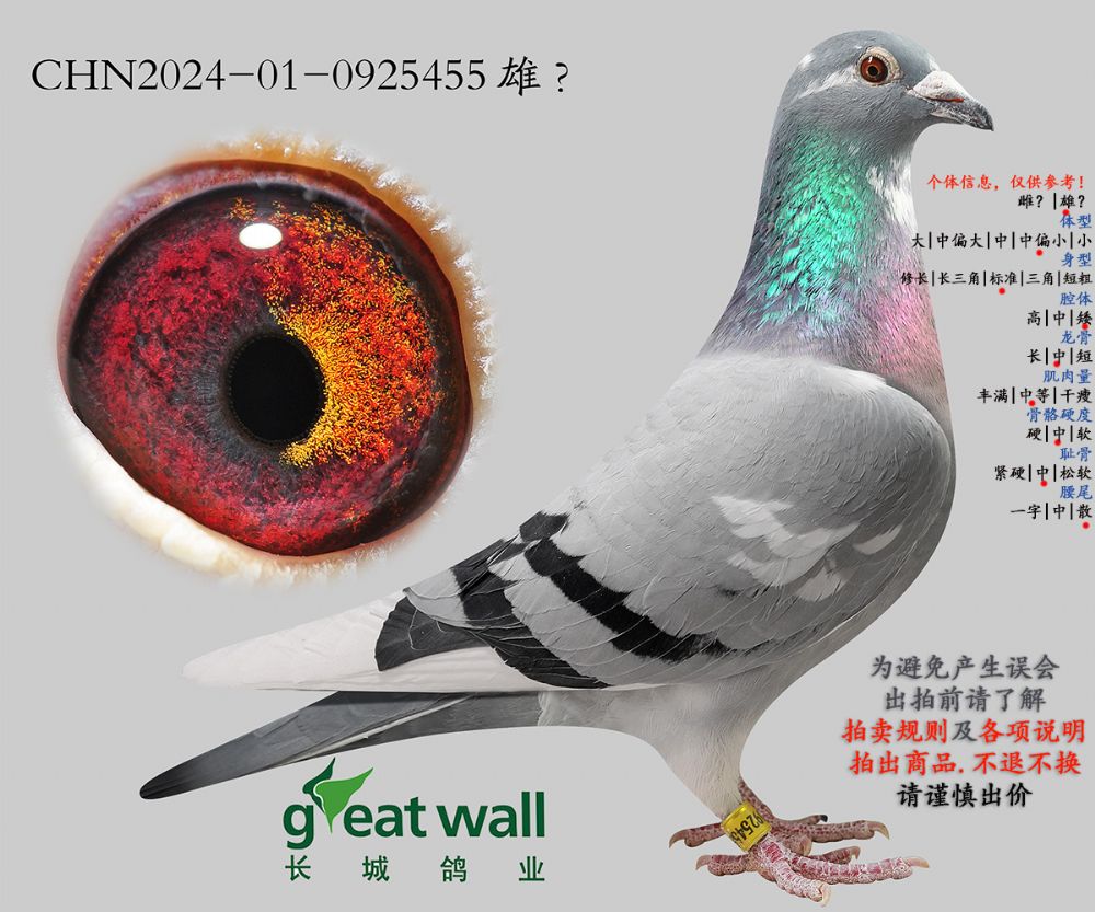 因拍卖鸽均是未做育过的种鸽或幼鸽,图内所标雌雄仅供参考,实际性别已实物为准。不做退换理由。