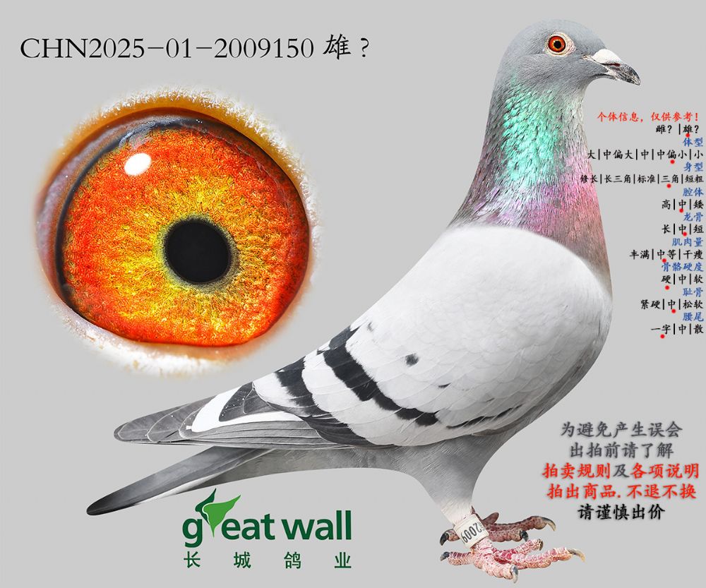 因拍卖鸽均是未做育过的种鸽或幼鸽,图内所标雌雄仅供参考,实际性别已实物为准。不做退换理由。