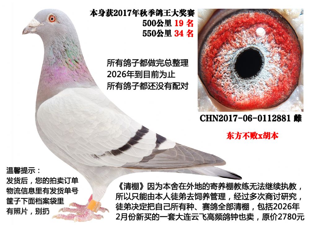 | 1654611 | 东方不败x胡本(2025年四关成绩鸽,500公里13名等) | ¥300元 | 1次 |