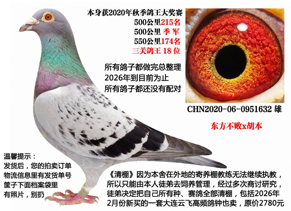 | 1654611 | 东方不败x胡本(2025年四关成绩鸽,500公里13名等) | ¥300元 | 1次 |