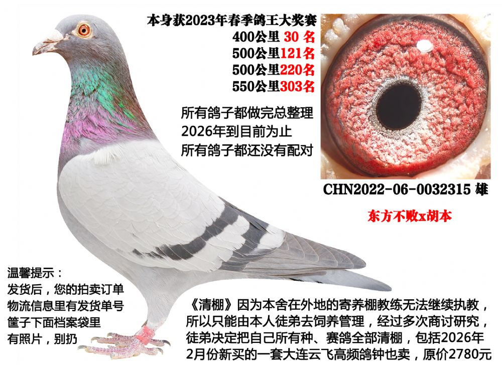 | 1654612 | 东方不败x胡本(2025年五关赛鸽王亚军,千元精英冠军) | ¥300元 | 1次 |