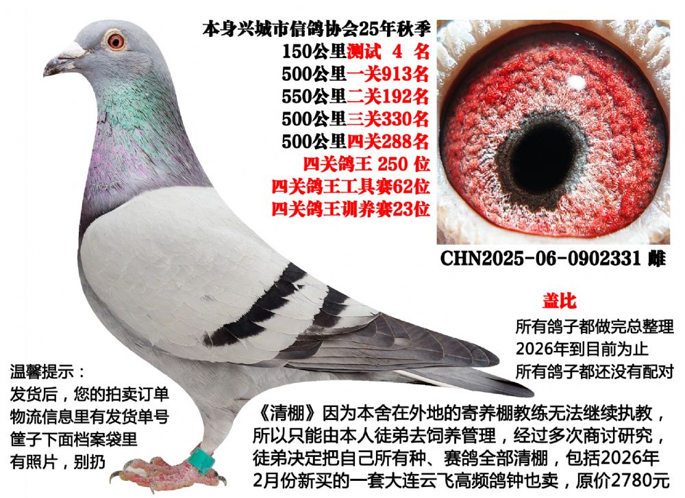 | 1654611 | 东方不败x胡本(2025年四关成绩鸽,500公里13名等) | ¥300元 | 1次 |