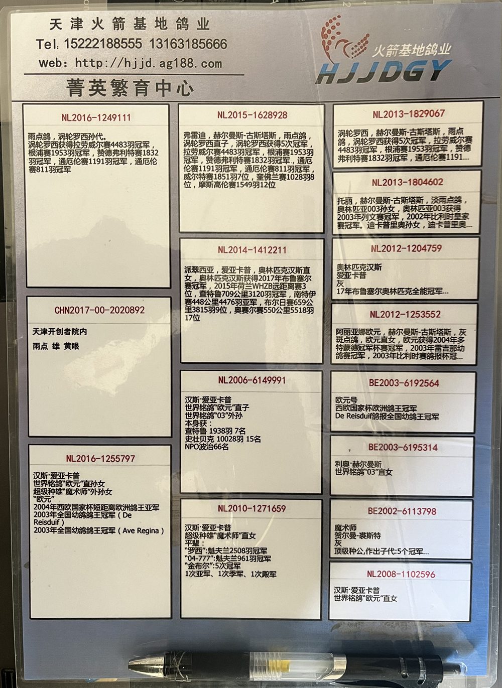 母:NL2016-1255797 汉斯·爱亚卡普 世界铭鸽^欧元直孙女 超级种雄“魔术师”外孙女 “欧元”2004年西欧国家杯短距离欧洲鸽王亚军 2003年全国幼鸽鸽王冠军(DeRelsduif) 2003年全国幼鸽鸽王冠军(Ave Regina)
