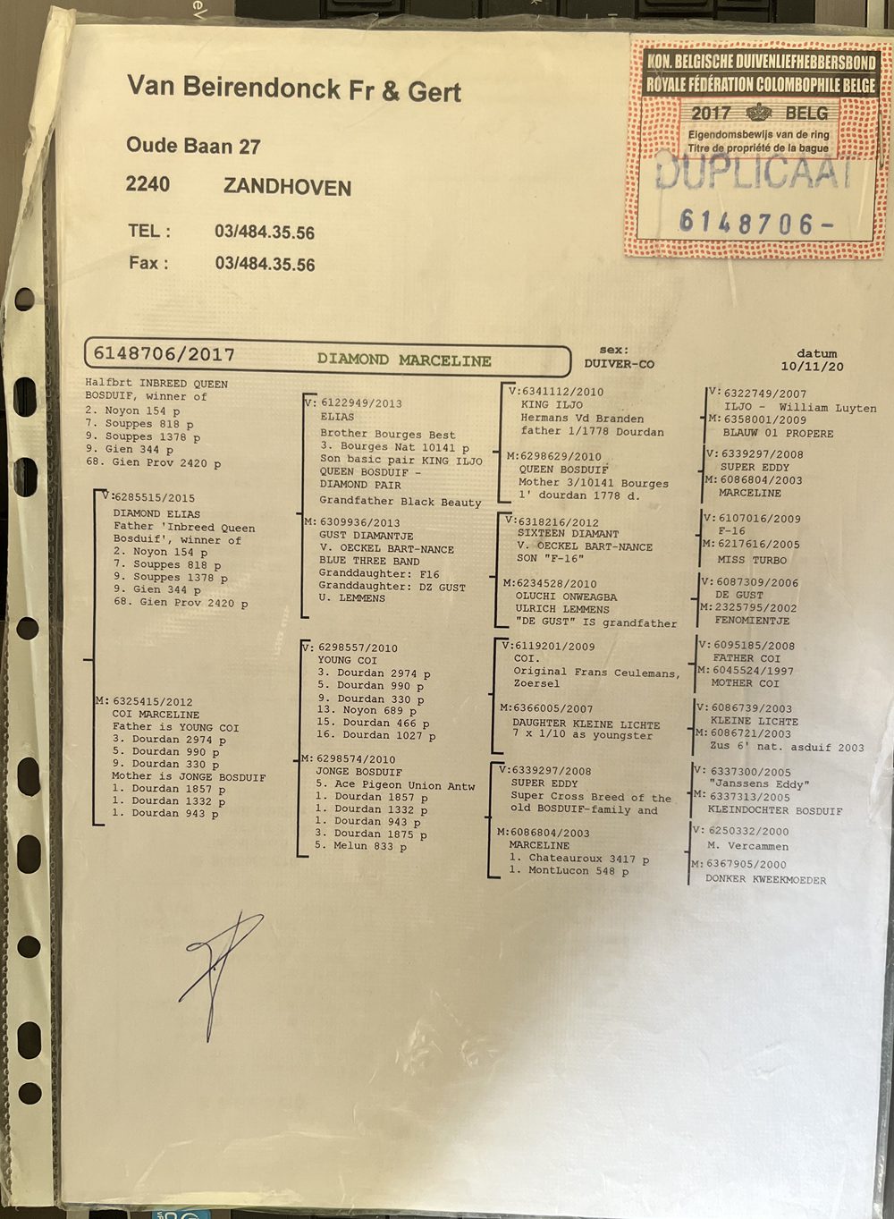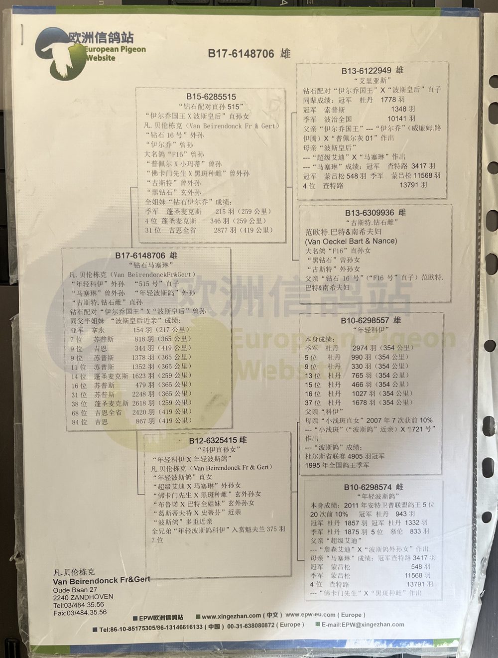 母:B12-6325415 “科伊直孙女” “年轻科伊X年轻波斯鸽” 凡.贝伦栋克;