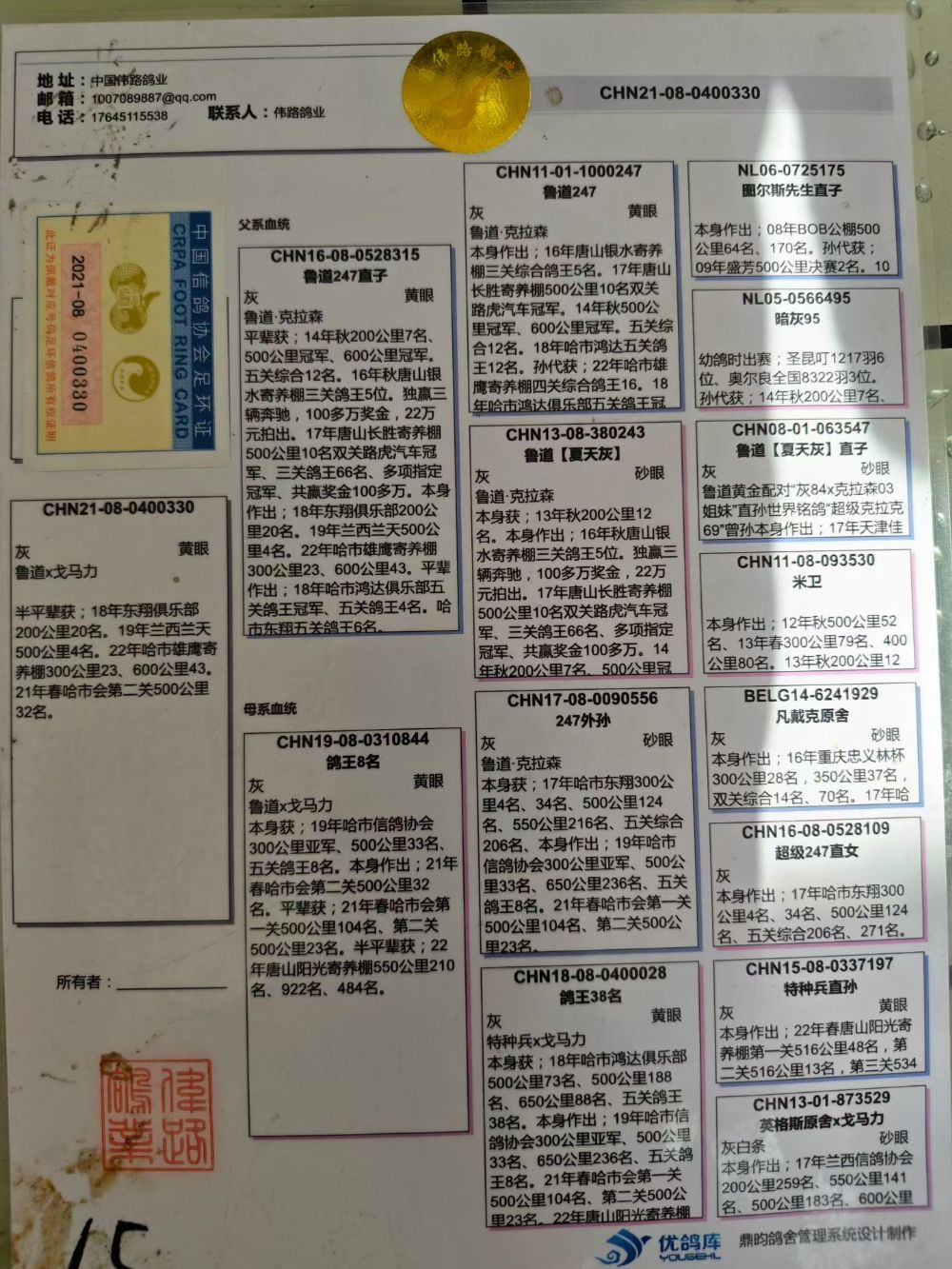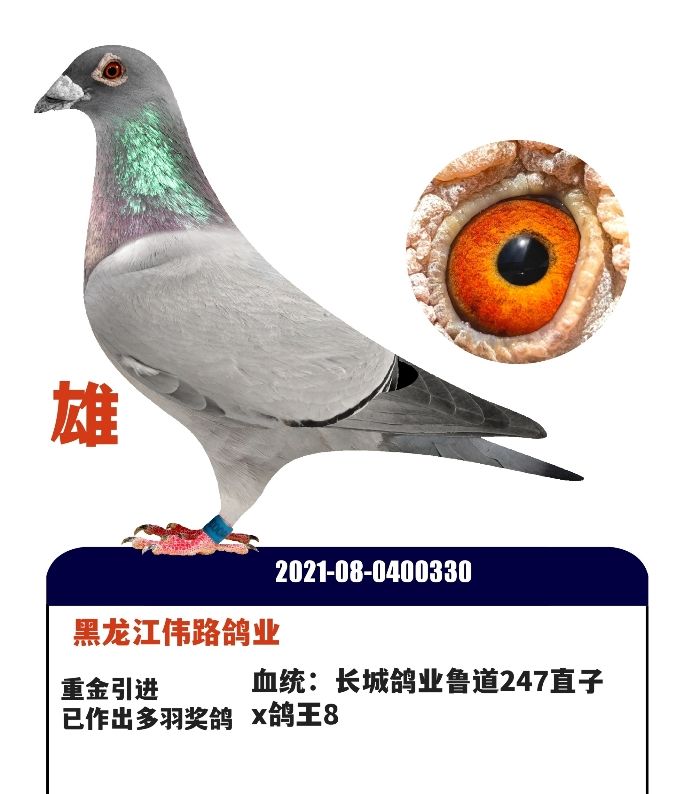 2021年国内实战赛鸽强豪,黑龙江伟路鸽业种鸽,雄,自身质量特别高级,血统,长城鸽业鲁道247直子x鸽王8,子代多羽获奖。
