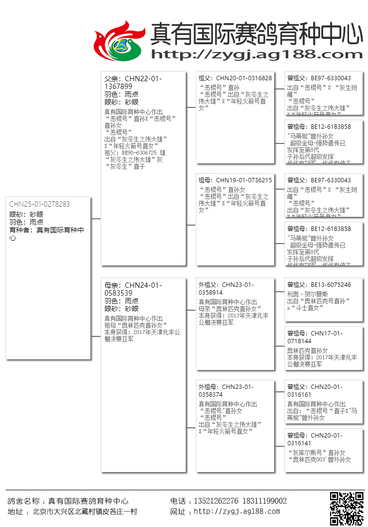 【在这三座金矿还未被世人发现之前,真有国际就第一时间把高品质的鸽子带到了国内,取得了空前的发挥。近几年大家才逐渐认识这几位大师鸽子的魅力。请记住!当任何商业鸽舍进入炒作后期的时候,他的鸽子质量与价值都会急剧下降,即便是詹森兄弟也难免于此。所以引进这家鸽舍最巅峰时期的鸽子,得以延续,才是真有国际成功的致胜法宝。】