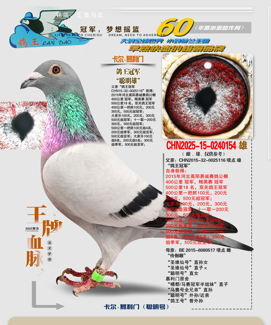 购得你家003血统鸽子今年在临河市1800特比环勇夺三关鸽王二十五名暗指二千五千共获奖金二十多万。地方大奖赛鸽王亚军四名十七名等谢谢刘总输出的好种鸽,鸽好人更好,祝刘总冠军多多,金钱多多。