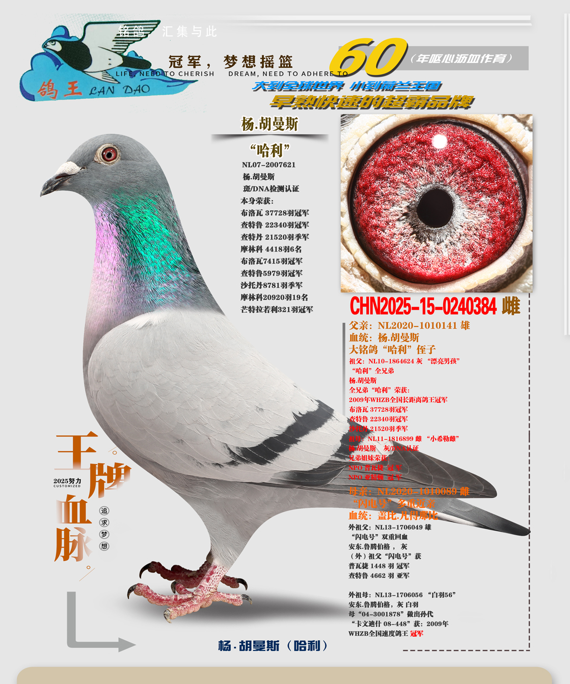 购得你家003血统鸽子今年在临河市1800特比环勇夺三关鸽王二十五名暗指二千五千共获奖金二十多万。地方大奖赛鸽王亚军四名十七名等谢谢刘总输出的好种鸽,鸽好人更好,祝刘总冠军多多,金钱多多。