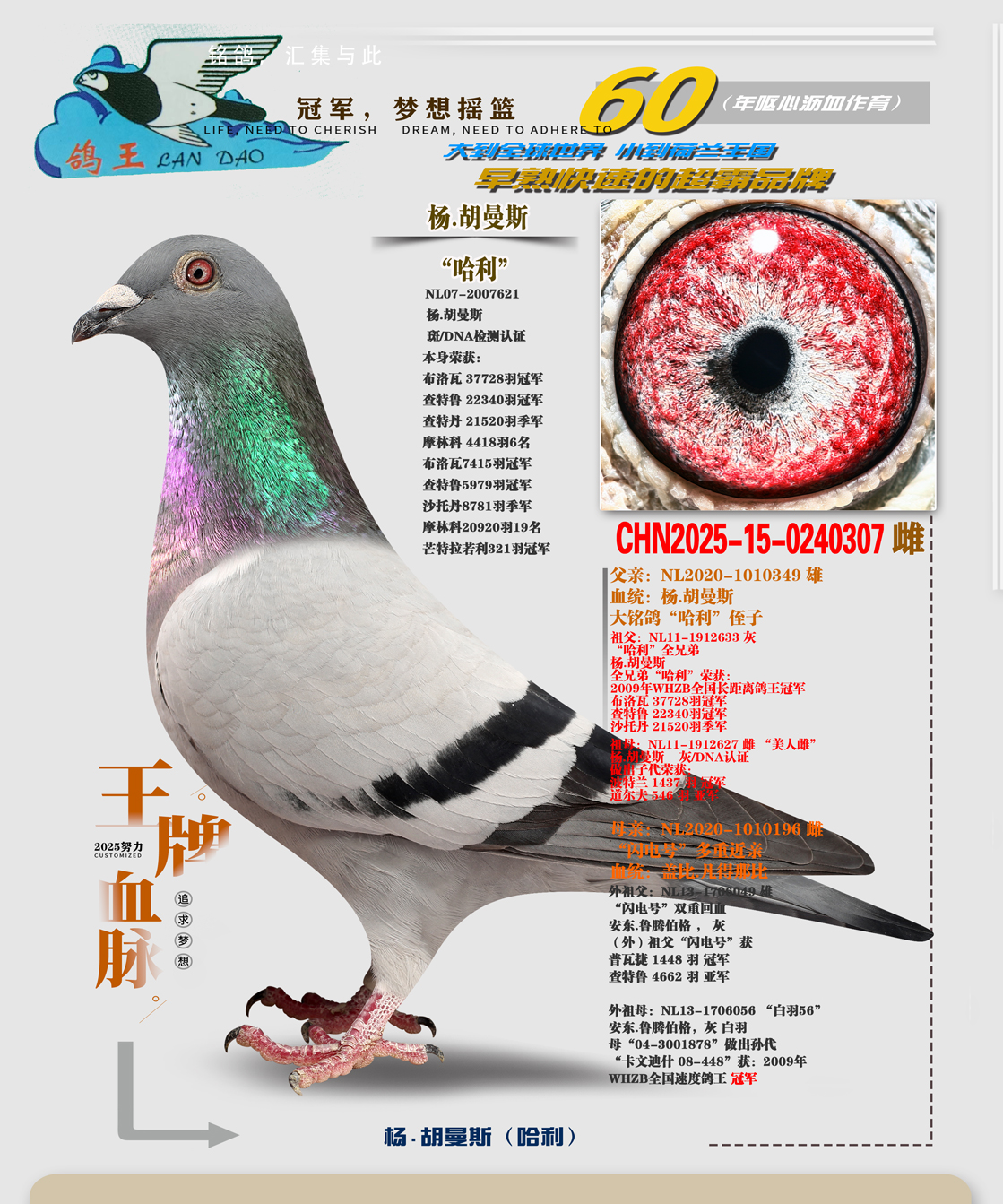 购得你家003血统鸽子今年在临河市1800特比环勇夺三关鸽王二十五名暗指二千五千共获奖金二十多万。地方大奖赛鸽王亚军四名十七名等谢谢刘总输出的好种鸽,鸽好人更好,祝刘总冠军多多,金钱多多。