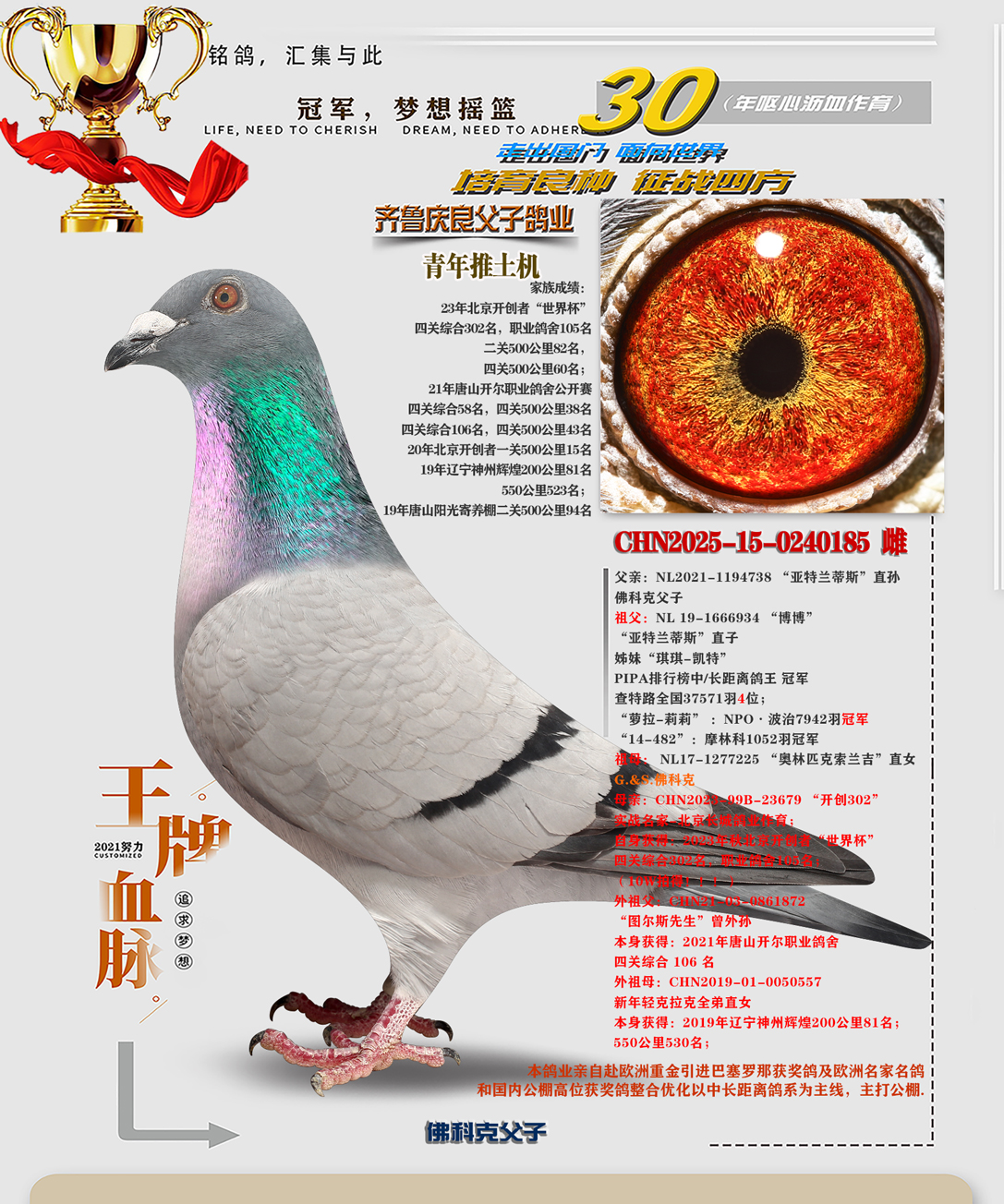 感谢齐鲁良父子鸽业刘总支援巴赛罗那血统配我家彼得曼德斯血统,在今年四关鸽王大赛斩获5名,此鸽也是去年800特比小号只取10名的情况下飞进10名,获奖金一万元!再次感谢刘总!!!