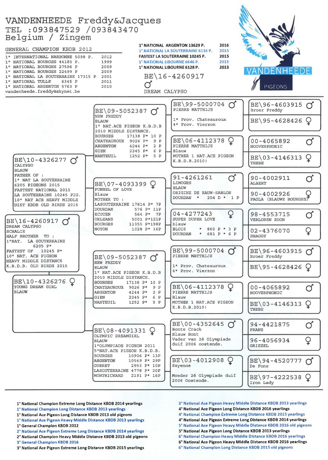本鸽父亲“277卡利普索”作出子代已获2次全国冠军。