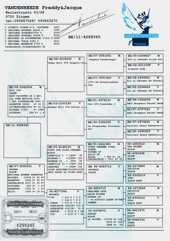 2011年拉索特年全国16576羽冠军 (福瑞克-阿伦使翔)“新福雷迪全兄弟”子代