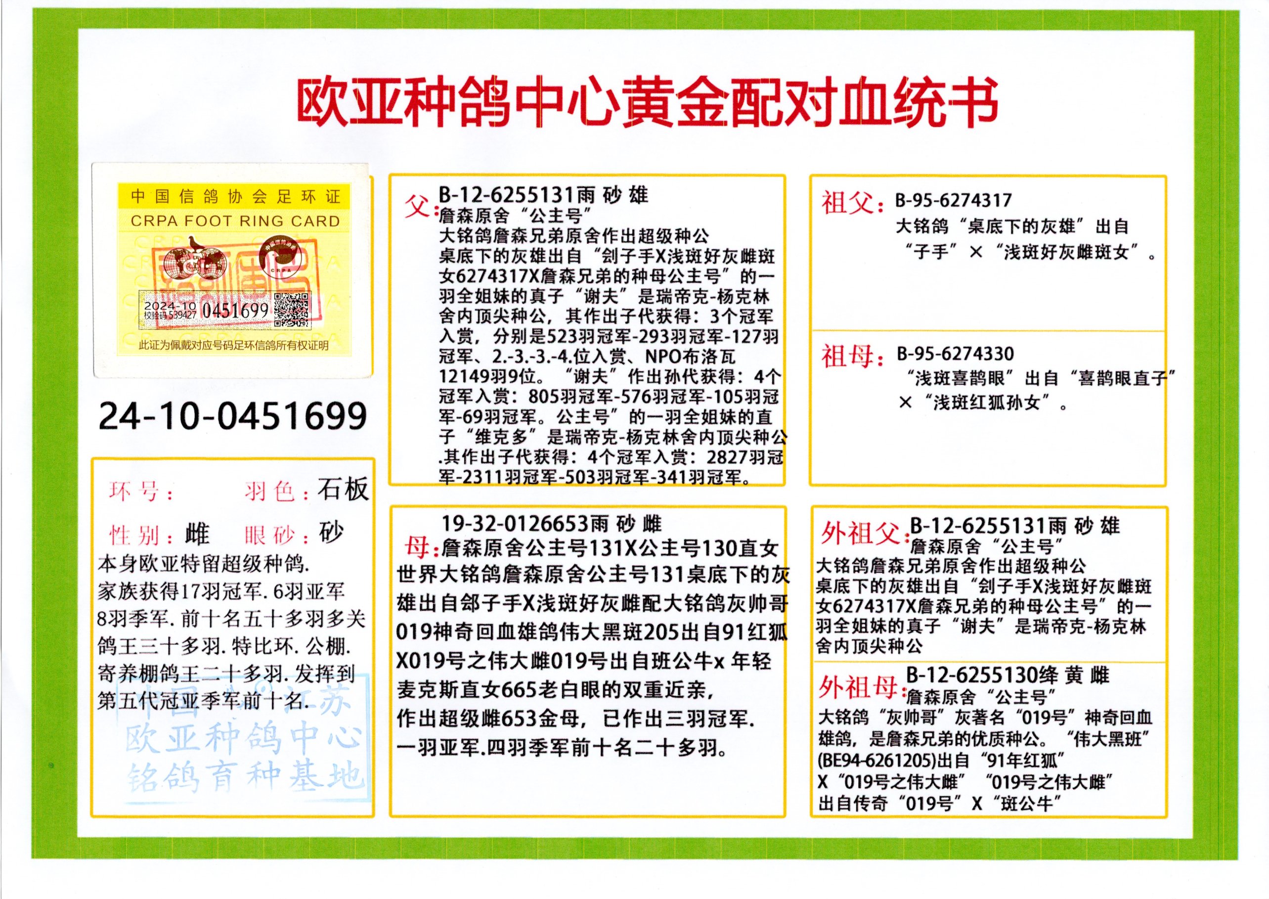 24年秋南京特比环欧亚荣获大团体冠军.小团体冠军551公里大特比13名.14名.16名.19名.20名.21名.24名.26名.27名.28名.42名.52名.54名.57名.65名.66名.68名.70名.71名.72名.74名.76名.80名.82名.83名.84名.85名.86名.90名.92名.110名.116名.121名.122名.128名.131名.158名.161名.164名.165名.166名.172名.174名.177名.182名.195名.196名.201名.205名.208名.210名.216名.253名.269名.275名.276名.294名.296名.299名,,24年秋云南天南铜都公棚决赛415名.天南铜都小棚决赛409名.云南玉活公棚决赛102名.490名.团体32名上笼二羽进二羽,天南铜都大棚506公里决赛445名。热烈祝贺河北省巨鹿县李兰生老师用欧亚泰山号血系连续十一年夺冠军,河北省国家赛冠军.全国季军等多次前十名高位,扬州王军王总用欧亚利奥24年春季获山东翔宇公棚决赛33名盖比53名。南京刘正龙刘总用欧亚盖比获得24年秋山东潍坊国际公棚决赛42名.精英赛30名.三关鸽王71名.决赛86名.加站赛16名.南京市特比环A组鸽王9名.B组鸽王5名.6名.C组鸽王5名.精英赛冠军4名.技能赛A组冠军4名.5名.秦淮区特比环荣获15名.46名.48名.87名。四川西昌徐亮徐总用欧亚利奥获得凉山州聚友决赛177名.第二关亚军双关鸽王19名.三关鸽王105名.云南豪庭公棚决赛603名。热烈祝贺24年四川重庆翔园鸽舍用欧亚泰山号荣获春季400公里冠军.秋季500公里冠军,河北王总用詹森X利奥获得千羽千翔公棚400公里冠军,广东蔡楷焕荣获24年秋爱好者 赛鸽俱乐部三关鸽王季军.一关420公里99名.二关450公里11名.三关520公里32名.单关季军.7名.12名,江西李卫兴荣获贵州红枫公棚8名.共翔俱乐部寄养棚四关综合鸽王30名.一关400公里78名.二关500公里55名.三关520公里37名.四关500公里57名.同父母获公棚18名.雷鸣获得武汉黄浦育翔中心冠军,四川陈文获得四川明鸿俱乐部300公里梦幻2名.3名.4名.9名.10名.13名.14名.15名.31名.34名.40名.41名.42名.43名.69名.71名.72名.73名.74名.94名.95名.97名.98名.99名.419公里决赛荣获总冠军7名.总共归巢9羽,四川徐亮获豪庭决赛603名,山西郑勇获得山西泰鑫公棚决赛255名詹森红狐,热烈祝贺马总获得开尔(飞跃队)决赛9名获奖金1310000万元.第一关52名,天津津福资赛180公里96名.获奖金429543万元,欧亚支持全国鸽友24年秋多人报喜 祝大家取得更好成绩,给欧亚报喜鸽友欧亚决定给每人赠送一羽超级种鸽。欧亚俱乐部特比环多关鸽王成绩:15年秋淮安特比环黑色星期一全会上笼9700多羽,当天无鸽归巢,第二天全会归巢357羽,本舍归巢158羽.前十名八羽.前一百名归巢57羽,16年春季获五关鸽王总冠军,总亚军四名.六名.七名.九名.十名.晶艺俱乐部520公里冠亚季军5名.6名.7名.9名.11名等,火车头冠军.季军6名.8名.9名.10名,16年秋晶艺俱乐部特比环520公里亚军.季军4名.6名.7名.9名,15年春南京白下特比环冠军.亚军.季军6名.7名.8名.9名.10名.指定鸽A B组获得冠军.亚军.季军4名.5名.,17年淮安特比环亚军.4名.5名.7名.8名.10名.六关鸽王总冠军.4名.6名.9名.10名,寄养棚宿迁刘总20羽特比环获冠军.季军.4名.7名.8名.9名等。18年荣获万羽特比环六关鸽王总冠军.总亚军.总季军.6名.8名.十名.单关四羽冠军.二羽亚军.四羽季军.前十名27羽。19年秋万羽特比环六关鸽王总亚军.总季军.5名.8名等,单关二羽冠军.三羽亚军.一羽季军前十名31羽。20年秋淮安市鸽会四关特比环大赛风雨无阻鸽王亚军.鸽王六名,金品俱乐部万羽特比环六关鸽王总冠军,总亚军.四名.五名.六名.七名.八名.十名.前二百名鸽王35羽,单关冠亚季军前十名四十多羽,火车头五关鸽王季军.六名.八名.前二百名鸽王十七羽。20年春荣获淮安五区一市四关鸽王总冠军.亚军.四名.八名.九名。21年秋荣获金品万羽特比环大赛六关鸽王总亚军.总季军.四名.七名.九名.十名.单关冠亚军季军前十名三十多羽。火车头协会鸽王六名.七名.十名.单关前十名十七羽。22年秋荣获鸽王总冠军.总亚军.5名.7名.8名.9名.11名.单关冠亚季军前十名三十多羽,第一关单关前二百名四十多羽,第二关前二百名三十多羽,第三关前二百名四十多羽,第四关前二百名四十多羽,第五关前一百名53羽。23年秋荣获鸽王季军.五名.八名.十名.13名.17名.20名.27名等多羽鸽王.单关前十名二十多羽。公棚.寄养棚部分成绩:16年秋宁夏黄河公棚总冠军电脑戈马力指定通炮冠军,17年送八羽参赛获得鸽王八名进奖四名,支持韩总荣获八名。支持鸽友荣获宁夏中卫公棚决赛总冠军.精英赛冠军,支持18年宁夏黄河公棚决赛冠军詹森X泰山。安徽鼎博寄养棚院内外四关鸽王总冠军.鸽王十七名.三十七名同窝,鸽王39名.42名.58名.67名。18年山东公棚预赛冠军.决赛65名.送八羽进奖五羽.指定获奔驰汽车一辆。支持鸽友获得云南蓝云公棚冠军.盖比X佛卡门。支持鸽友荣获云南银集公棚决赛冠军 詹森427X520血系 速度赛6700羽冠军。17年荣获金马俱乐部寄养棚四关鸽王总冠军.季军.六名.八名.第一关冠军.亚军.季军四名.七名.十一名.金牌教练奖。支持鸽友18年北京费翔公棚预赛九名电脑X桑杰士,支持鸽友荣获陕西威力公棚决赛11名.内蒙古临河寄养棚四关鸽王六名.詹森配泰山,支持河北王总用欧亚詹森427配胡本喜获20年秋开尔青年棚季军。云南东荣公棚16年预赛冠军.决赛77名.17年决赛12名.詹森红狐X泰山,17年平安公棚决赛4名 詹森427。欧亚获得21年金母寄养棚第一关四名.第二关5名.第三关5名.6名.7名.10名.三关鸽王总冠军,四关鸽王14名.十羽鸽王。支持河