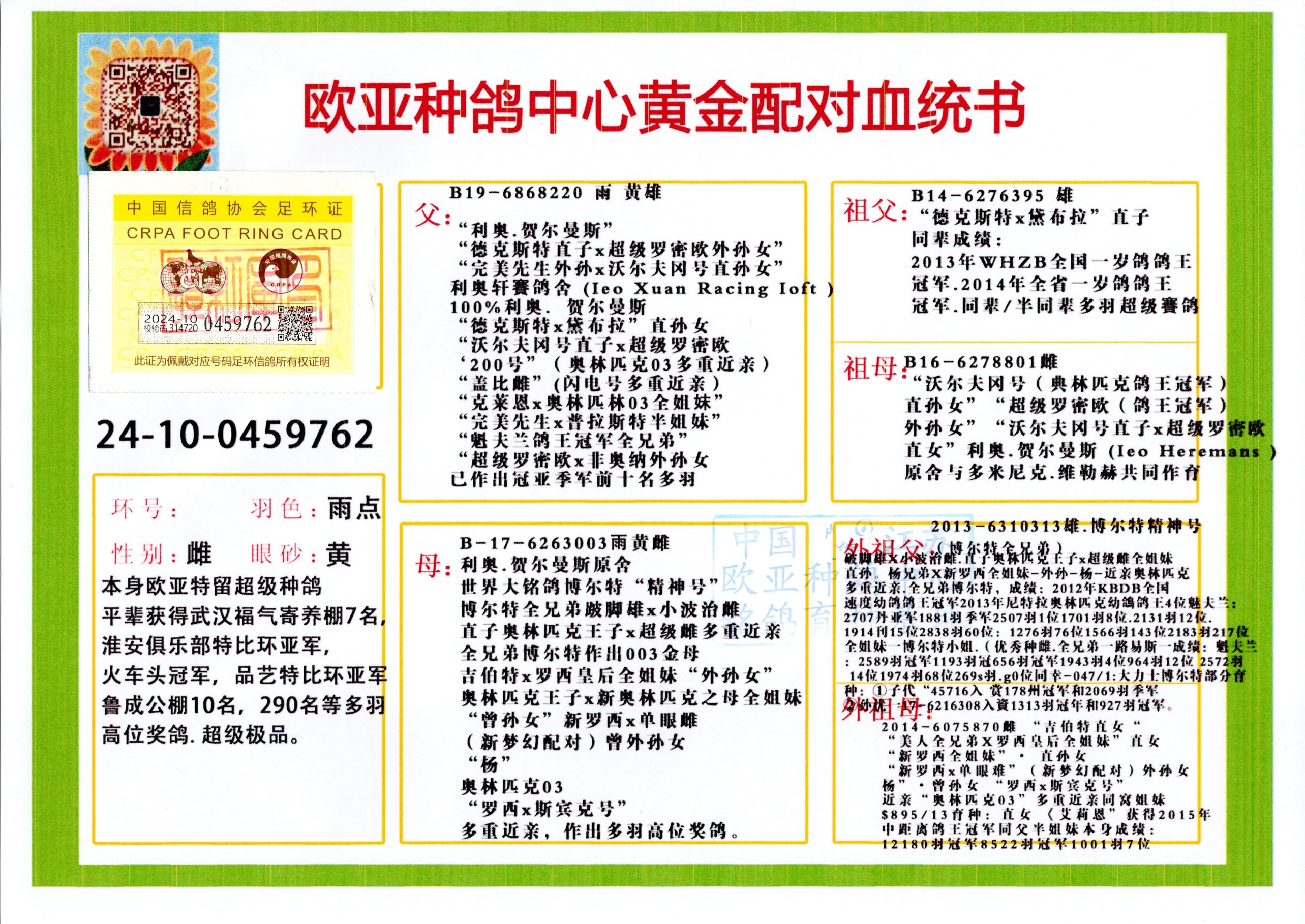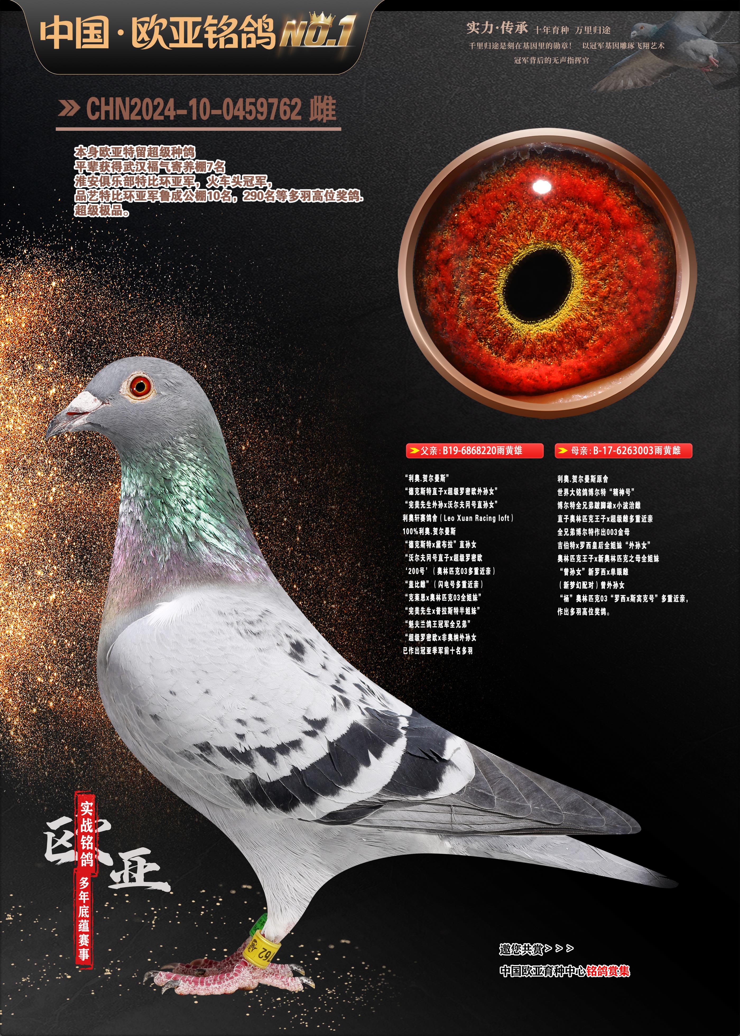 24年秋南京特比环欧亚荣获大团体冠军.小团体冠军551公里大特比13名.14名.16名.19名.20名.21名.24名.26名.27名.28名.42名.52名.54名.57名.65名.66名.68名.70名.71名.72名.74名.76名.80名.82名.83名.84名.85名.86名.90名.92名.110名.116名.121名.122名.128名.131名.158名.161名.164名.165名.166名.172名.174名.177名.182名.195名.196名.201名.205名.208名.210名.216名.253名.269名.275名.276名.294名.296名.299名,,24年秋云南天南铜都公棚决赛415名.天南铜都小棚决赛409名.云南玉活公棚决赛102名.490名.团体32名上笼二羽进二羽,天南铜都大棚506公里决赛445名。热烈祝贺河北省巨鹿县李兰生老师用欧亚泰山号血系连续十一年夺冠军,河北省国家赛冠军.全国季军等多次前十名高位,扬州王军王总用欧亚利奥24年春季获山东翔宇公棚决赛33名盖比53名。南京刘正龙刘总用欧亚盖比获得24年秋山东潍坊国际公棚决赛42名.精英赛30名.三关鸽王71名.决赛86名.加站赛16名.南京市特比环A组鸽王9名.B组鸽王5名.6名.C组鸽王5名.精英赛冠军4名.技能赛A组冠军4名.5名.秦淮区特比环荣获15名.46名.48名.87名。四川西昌徐亮徐总用欧亚利奥获得凉山州聚友决赛177名.第二关亚军双关鸽王19名.三关鸽王105名.云南豪庭公棚决赛603名。热烈祝贺24年四川重庆翔园鸽舍用欧亚泰山号荣获春季400公里冠军.秋季500公里冠军,河北王总用詹森X利奥获得千羽千翔公棚400公里冠军,广东蔡楷焕荣获24年秋爱好者 赛鸽俱乐部三关鸽王季军.一关420公里99名.二关450公里11名.三关520公里32名.单关季军.7名.12名,江西李卫兴荣获贵州红枫公棚8名.共翔俱乐部寄养棚四关综合鸽王30名.一关400公里78名.二关500公里55名.三关520公里37名.四关500公里57名.同父母获公棚18名.雷鸣获得武汉黄浦育翔中心冠军,四川陈文获得四川明鸿俱乐部300公里梦幻2名.3名.4名.9名.10名.13名.14名.15名.31名.34名.40名.41名.42名.43名.69名.71名.72名.73名.74名.94名.95名.97名.98名.99名.419公里决赛荣获总冠军7名.总共归巢9羽,四川徐亮获豪庭决赛603名,山西郑勇获得山西泰鑫公棚决赛255名詹森红狐,热烈祝贺马总获得开尔(飞跃队)决赛9名获奖金1310000万元.第一关52名,天津津福资赛180公里96名.获奖金429543万元,欧亚支持全国鸽友24年秋多人报喜 祝大家取得更好成绩,给欧亚报喜鸽友欧亚决定给每人赠送一羽超级种鸽。欧亚俱乐部特比环多关鸽王成绩:15年秋淮安特比环黑色星期一全会上笼9700多羽,当天无鸽归巢,第二天全会归巢357羽,本舍归巢158羽.前十名八羽.前一百名归巢57羽,16年春季获五关鸽王总冠军,总亚军四名.六名.七名.九名.十名.晶艺俱乐部520公里冠亚季军5名.6名.7名.9名.11名等,火车头冠军.季军6名.8名.9名.10名,16年秋晶艺俱乐部特比环520公里亚军.季军4名.6名.7名.9名,15年春南京白下特比环冠军.亚军.季军6名.7名.8名.9名.10名.指定鸽A B组获得冠军.亚军.季军4名.5名.,17年淮安特比环亚军.4名.5名.7名.8名.10名.六关鸽王总冠军.4名.6名.9名.10名,寄养棚宿迁刘总20羽特比环获冠军.季军.4名.7名.8名.9名等。18年荣获万羽特比环六关鸽王总冠军.总亚军.总季军.6名.8名.十名.单关四羽冠军.二羽亚军.四羽季军.前十名27羽。19年秋万羽特比环六关鸽王总亚军.总季军.5名.8名等,单关二羽冠军.三羽亚军.一羽季军前十名31羽。20年秋淮安市鸽会四关特比环大赛风雨无阻鸽王亚军.鸽王六名,金品俱乐部万羽特比环六关鸽王总冠军,总亚军.四名.五名.六名.七名.八名.十名.前二百名鸽王35羽,单关冠亚季军前十名四十多羽,火车头五关鸽王季军.六名.八名.前二百名鸽王十七羽。20年春荣获淮安五区一市四关鸽王总冠军.亚军.四名.八名.九名。21年秋荣获金品万羽特比环大赛六关鸽王总亚军.总季军.四名.七名.九名.十名.单关冠亚军季军前十名三十多羽。火车头协会鸽王六名.七名.十名.单关前十名十七羽。22年秋荣获鸽王总冠军.总亚军.5名.7名.8名.9名.11名.单关冠亚季军前十名三十多羽,第一关单关前二百名四十多羽,第二关前二百名三十多羽,第三关前二百名四十多羽,第四关前二百名四十多羽,第五关前一百名53羽。23年秋荣获鸽王季军.五名.八名.十名.13名.17名.20名.27名等多羽鸽王.单关前十名二十多羽。公棚.寄养棚部分成绩:16年秋宁夏黄河公棚总冠军电脑戈马力指定通炮冠军,17年送八羽参赛获得鸽王八名进奖四名,支持韩总荣获八名。支持鸽友荣获宁夏中卫公棚决赛总冠军.精英赛冠军,支持18年宁夏黄河公棚决赛冠军詹森X泰山。安徽鼎博寄养棚院内外四关鸽王总冠军.鸽王十七名.三十七名同窝,鸽王39名.42名.58名.67名。18年山东公棚预赛冠军.决赛65名.送八羽进奖五羽.指定获奔驰汽车一辆。支持鸽友获得云南蓝云公棚冠军.盖比X佛卡门。支持鸽友荣获云南银集公棚决赛冠军 詹森427X520血系 速度赛6700羽冠军。17年荣获金马俱乐部寄养棚四关鸽王总冠军.季军.六名.八名.第一关冠军.亚军.季军四名.七名.十一名.金牌教练奖。支持鸽友18年北京费翔公棚预赛九名电脑X桑杰士,支持鸽友荣获陕西威力公棚决赛11名.内蒙古临河寄养棚四关鸽王六名.詹森配泰山,支持河北王总用欧亚詹森427配胡本喜获20年秋开尔青年棚季军。云南东荣公棚16年预赛冠军.决赛77名.17年决赛12名.詹森红狐X泰山,17年平安公棚决赛4名 詹森427。欧亚获得21年金母寄养棚第一关四名.第二关5名.第三关5名.6名.7名.10名.三关鸽王总冠军,四关鸽王14名.十羽鸽王。支持河