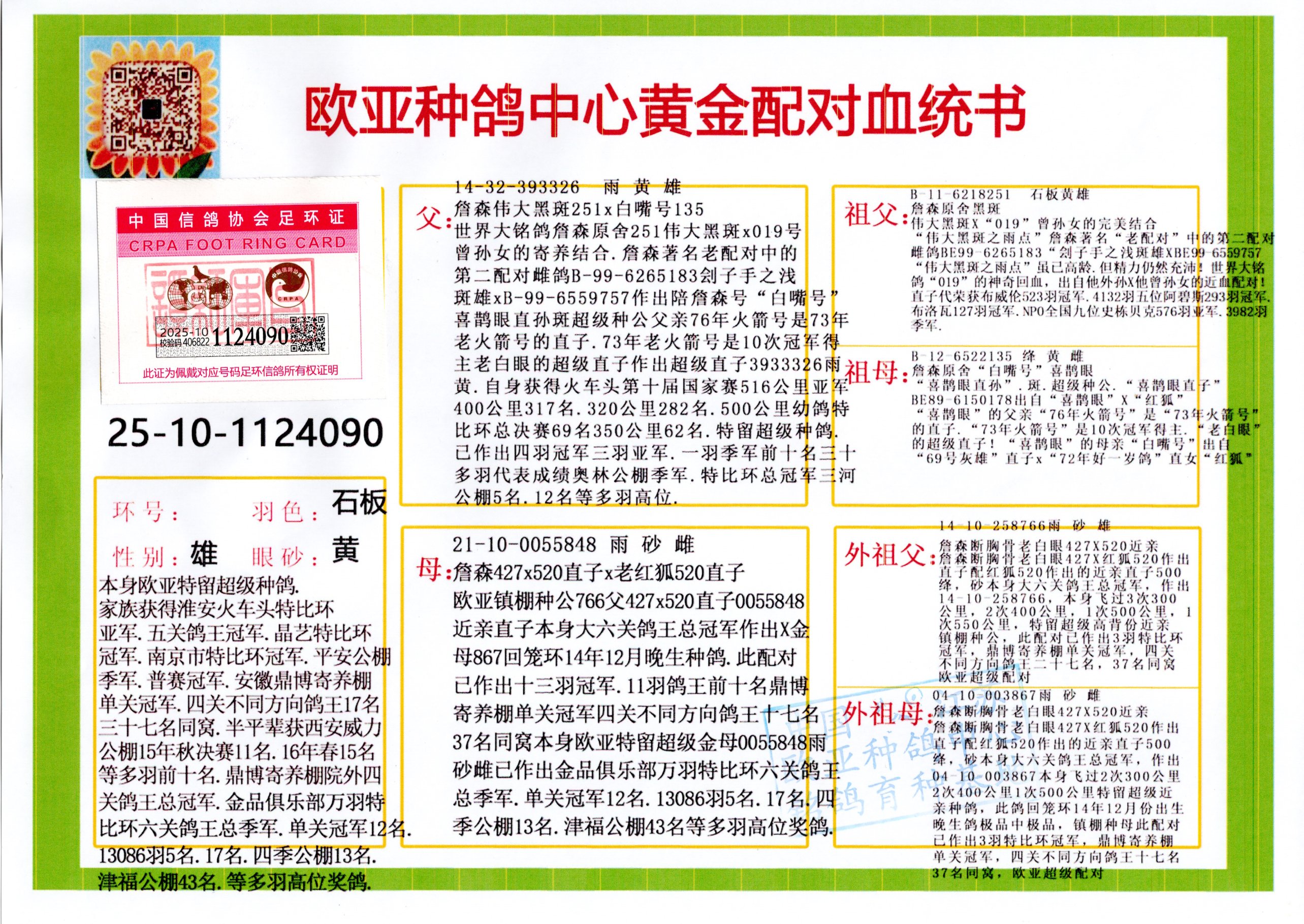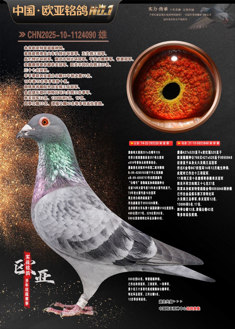 24年秋南京特比环欧亚荣获大团体冠军.小团体冠军551公里大特比13名.14名.16名.19名.20名.21名.24名.26名.27名.28名.42名.52名.54名.57名.65名.66名.68名.70名.71名.72名.74名.76名.80名.82名.83名.84名.85名.86名.90名.92名.110名.116名.121名.122名.128名.131名.158名.161名.164名.165名.166名.172名.174名.177名.182名.195名.196名.201名.205名.208名.210名.216名.253名.269名.275名.276名.294名.296名.299名,,24年秋云南天南铜都公棚决赛415名.天南铜都小棚决赛409名.云南玉活公棚决赛102名.490名.团体32名上笼二羽进二羽,天南铜都大棚506公里决赛445名。热烈祝贺河北省巨鹿县李兰生老师用欧亚泰山号血系连续十一年夺冠军,河北省国家赛冠军.全国季军等多次前十名高位,扬州王军王总用欧亚利奥24年春季获山东翔宇公棚决赛33名盖比53名。南京刘正龙刘总用欧亚盖比获得24年秋山东潍坊国际公棚决赛42名.精英赛30名.三关鸽王71名.决赛86名.加站赛16名.南京市特比环A组鸽王9名.B组鸽王5名.6名.C组鸽王5名.精英赛冠军4名.技能赛A组冠军4名.5名.秦淮区特比环荣获15名.46名.48名.87名。四川西昌徐亮徐总用欧亚利奥获得凉山州聚友决赛177名.第二关亚军双关鸽王19名.三关鸽王105名.云南豪庭公棚决赛603名。热烈祝贺24年四川重庆翔园鸽舍用欧亚泰山号荣获春季400公里冠军.秋季500公里冠军,河北王总用詹森X利奥获得千羽千翔公棚400公里冠军,广东蔡楷焕荣获24年秋爱好者 赛鸽俱乐部三关鸽王季军.一关420公里99名.二关450公里11名.三关520公里32名.单关季军.7名.12名,江西李卫兴荣获贵州红枫公棚8名.共翔俱乐部寄养棚四关综合鸽王30名.一关400公里78名.二关500公里55名.三关520公里37名.四关500公里57名.同父母获公棚18名.雷鸣获得武汉黄浦育翔中心冠军,四川陈文获得四川明鸿俱乐部300公里梦幻2名.3名.4名.9名.10名.13名.14名.15名.31名.34名.40名.41名.42名.43名.69名.71名.72名.73名.74名.94名.95名.97名.98名.99名.419公里决赛荣获总冠军7名.总共归巢9羽,四川徐亮获豪庭决赛603名,山西郑勇获得山西泰鑫公棚决赛255名詹森红狐,热烈祝贺马总获得开尔(飞跃队)决赛9名获奖金1310000万元.第一关52名,天津津福资赛180公里96名.获奖金429543万元,欧亚支持全国鸽友24年秋多人报喜 祝大家取得更好成绩,给欧亚报喜鸽友欧亚决定给每人赠送一羽超级种鸽。欧亚俱乐部特比环多关鸽王成绩:15年秋淮安特比环黑色星期一全会上笼9700多羽,当天无鸽归巢,第二天全会归巢357羽,本舍归巢158羽.前十名八羽.前一百名归巢57羽,16年春季获五关鸽王总冠军,总亚军四名.六名.七名.九名.十名.晶艺俱乐部520公里冠亚季军5名.6名.7名.9名.11名等,火车头冠军.季军6名.8名.9名.10名,16年秋晶艺俱乐部特比环520公里亚军.季军4名.6名.7名.9名,15年春南京白下特比环冠军.亚军.季军6名.7名.8名.9名.10名.指定鸽A B组获得冠军.亚军.季军4名.5名.,17年淮安特比环亚军.4名.5名.7名.8名.10名.六关鸽王总冠军.4名.6名.9名.10名,寄养棚宿迁刘总20羽特比环获冠军.季军.4名.7名.8名.9名等。18年荣获万羽特比环六关鸽王总冠军.总亚军.总季军.6名.8名.十名.单关四羽冠军.二羽亚军.四羽季军.前十名27羽。19年秋万羽特比环六关鸽王总亚军.总季军.5名.8名等,单关二羽冠军.三羽亚军.一羽季军前十名31羽。20年秋淮安市鸽会四关特比环大赛风雨无阻鸽王亚军.鸽王六名,金品俱乐部万羽特比环六关鸽王总冠军,总亚军.四名.五名.六名.七名.八名.十名.前二百名鸽王35羽,单关冠亚季军前十名四十多羽,火车头五关鸽王季军.六名.八名.前二百名鸽王十七羽。20年春荣获淮安五区一市四关鸽王总冠军.亚军.四名.八名.九名。21年秋荣获金品万羽特比环大赛六关鸽王总亚军.总季军.四名.七名.九名.十名.单关冠亚军季军前十名三十多羽。火车头协会鸽王六名.七名.十名.单关前十名十七羽。22年秋荣获鸽王总冠军.总亚军.5名.7名.8名.9名.11名.单关冠亚季军前十名三十多羽,第一关单关前二百名四十多羽,第二关前二百名三十多羽,第三关前二百名四十多羽,第四关前二百名四十多羽,第五关前一百名53羽。23年秋荣获鸽王季军.五名.八名.十名.13名.17名.20名.27名等多羽鸽王.单关前十名二十多羽。公棚.寄养棚部分成绩:16年秋宁夏黄河公棚总冠军电脑戈马力指定通炮冠军,17年送八羽参赛获得鸽王八名进奖四名,支持韩总荣获八名。支持鸽友荣获宁夏中卫公棚决赛总冠军.精英赛冠军,支持18年宁夏黄河公棚决赛冠军詹森X泰山。安徽鼎博寄养棚院内外四关鸽王总冠军.鸽王十七名.三十七名同窝,鸽王39名.42名.58名.67名。18年山东公棚预赛冠军.决赛65名.送八羽进奖五羽.指定获奔驰汽车一辆。支持鸽友获得云南蓝云公棚冠军.盖比X佛卡门。支持鸽友荣获云南银集公棚决赛冠军 詹森427X520血系 速度赛6700羽冠军。17年荣获金马俱乐部寄养棚四关鸽王总冠军.季军.六名.八名.第一关冠军.亚军.季军四名.七名.十一名.金牌教练奖。支持鸽友18年北京费翔公棚预赛九名电脑X桑杰士,支持鸽友荣获陕西威力公棚决赛11名.内蒙古临河寄养棚四关鸽王六名.詹森配泰山,支持河北王总用欧亚詹森427配胡本喜获20年秋开尔青年棚季军。云南东荣公棚16年预赛冠军.决赛77名.17年决赛12名.詹森红狐X泰山,17年平安公棚决赛4名 詹森427。欧亚获得21年金母寄养棚第一关四名.第二关5名.第三关5名.6名.7名.10名.三关鸽王总冠军,四关鸽王14名.十羽鸽王。支持河