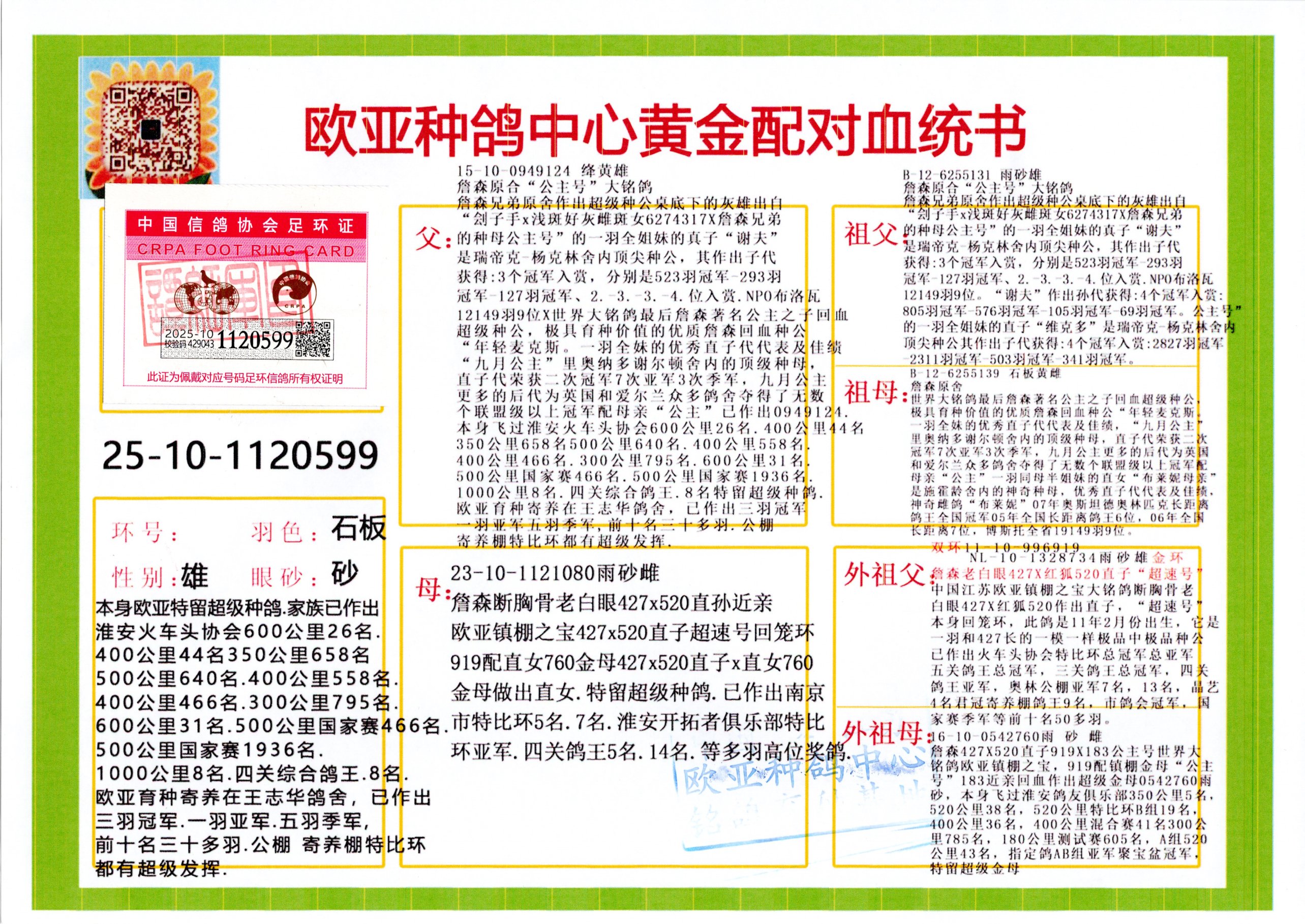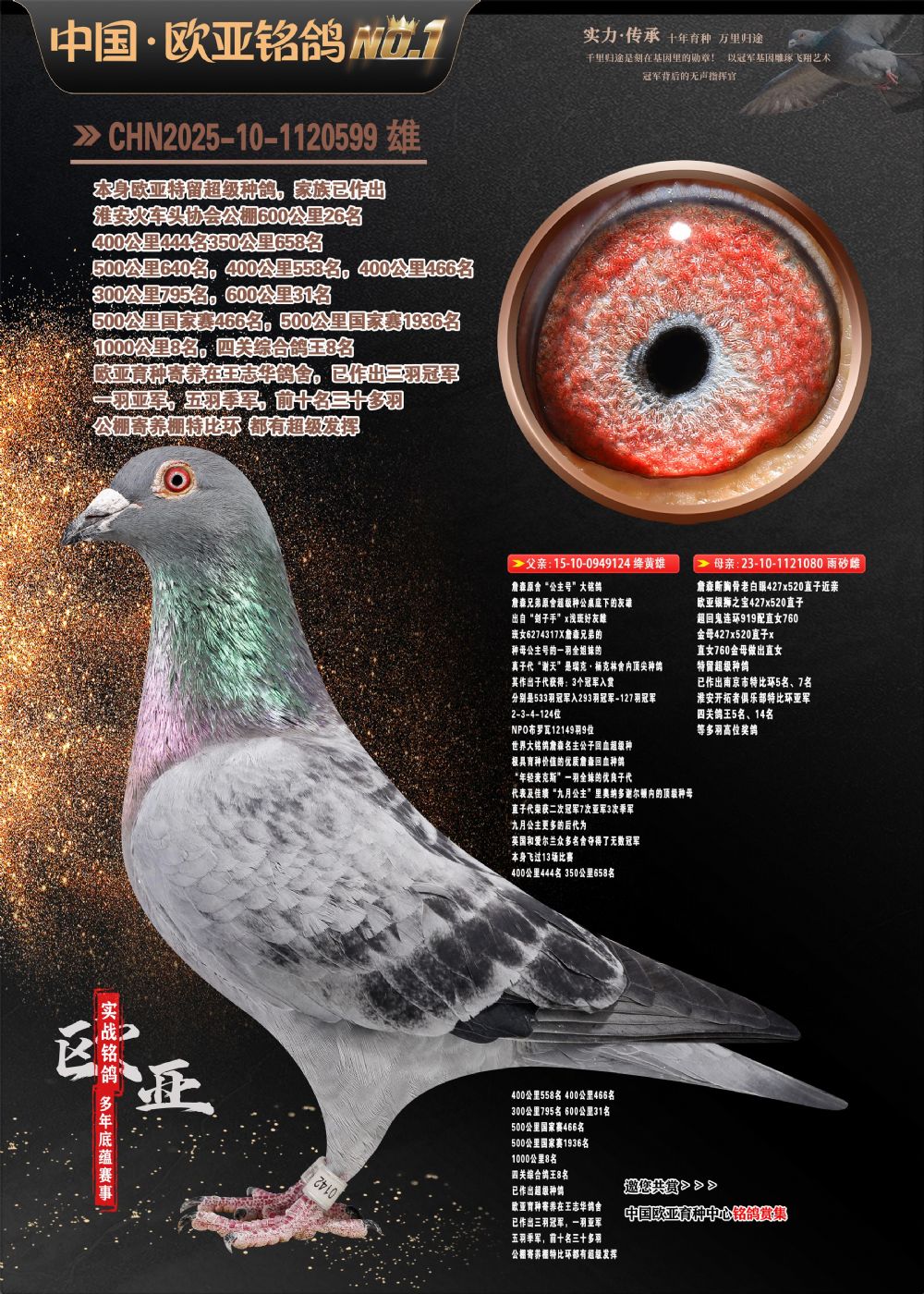 24年秋南京特比环欧亚荣获大团体冠军.小团体冠军551公里大特比13名.14名.16名.19名.20名.21名.24名.26名.27名.28名.42名.52名.54名.57名.65名.66名.68名.70名.71名.72名.74名.76名.80名.82名.83名.84名.85名.86名.90名.92名.110名.116名.121名.122名.128名.131名.158名.161名.164名.165名.166名.172名.174名.177名.182名.195名.196名.201名.205名.208名.210名.216名.253名.269名.275名.276名.294名.296名.299名,,24年秋云南天南铜都公棚决赛415名.天南铜都小棚决赛409名.云南玉活公棚决赛102名.490名.团体32名上笼二羽进二羽,天南铜都大棚506公里决赛445名。热烈祝贺河北省巨鹿县李兰生老师用欧亚泰山号血系连续十一年夺冠军,河北省国家赛冠军.全国季军等多次前十名高位,扬州王军王总用欧亚利奥24年春季获山东翔宇公棚决赛33名盖比53名。南京刘正龙刘总用欧亚盖比获得24年秋山东潍坊国际公棚决赛42名.精英赛30名.三关鸽王71名.决赛86名.加站赛16名.南京市特比环A组鸽王9名.B组鸽王5名.6名.C组鸽王5名.精英赛冠军4名.技能赛A组冠军4名.5名.秦淮区特比环荣获15名.46名.48名.87名。四川西昌徐亮徐总用欧亚利奥获得凉山州聚友决赛177名.第二关亚军双关鸽王19名.三关鸽王105名.云南豪庭公棚决赛603名。热烈祝贺24年四川重庆翔园鸽舍用欧亚泰山号荣获春季400公里冠军.秋季500公里冠军,河北王总用詹森X利奥获得千羽千翔公棚400公里冠军,广东蔡楷焕荣获24年秋爱好者 赛鸽俱乐部三关鸽王季军.一关420公里99名.二关450公里11名.三关520公里32名.单关季军.7名.12名,江西李卫兴荣获贵州红枫公棚8名.共翔俱乐部寄养棚四关综合鸽王30名.一关400公里78名.二关500公里55名.三关520公里37名.四关500公里57名.同父母获公棚18名.雷鸣获得武汉黄浦育翔中心冠军,四川陈文获得四川明鸿俱乐部300公里梦幻2名.3名.4名.9名.10名.13名.14名.15名.31名.34名.40名.41名.42名.43名.69名.71名.72名.73名.74名.94名.95名.97名.98名.99名.419公里决赛荣获总冠军7名.总共归巢9羽,四川徐亮获豪庭决赛603名,山西郑勇获得山西泰鑫公棚决赛255名詹森红狐,热烈祝贺马总获得开尔(飞跃队)决赛9名获奖金1310000万元.第一关52名,天津津福资赛180公里96名.获奖金429543万元,欧亚支持全国鸽友24年秋多人报喜 祝大家取得更好成绩,给欧亚报喜鸽友欧亚决定给每人赠送一羽超级种鸽。欧亚俱乐部特比环多关鸽王成绩:15年秋淮安特比环黑色星期一全会上笼9700多羽,当天无鸽归巢,第二天全会归巢357羽,本舍归巢158羽.前十名八羽.前一百名归巢57羽,16年春季获五关鸽王总冠军,总亚军四名.六名.七名.九名.十名.晶艺俱乐部520公里冠亚季军5名.6名.7名.9名.11名等,火车头冠军.季军6名.8名.9名.10名,16年秋晶艺俱乐部特比环520公里亚军.季军4名.6名.7名.9名,15年春南京白下特比环冠军.亚军.季军6名.7名.8名.9名.10名.指定鸽A B组获得冠军.亚军.季军4名.5名.,17年淮安特比环亚军.4名.5名.7名.8名.10名.六关鸽王总冠军.4名.6名.9名.10名,寄养棚宿迁刘总20羽特比环获冠军.季军.4名.7名.8名.9名等。18年荣获万羽特比环六关鸽王总冠军.总亚军.总季军.6名.8名.十名.单关四羽冠军.二羽亚军.四羽季军.前十名27羽。19年秋万羽特比环六关鸽王总亚军.总季军.5名.8名等,单关二羽冠军.三羽亚军.一羽季军前十名31羽。20年秋淮安市鸽会四关特比环大赛风雨无阻鸽王亚军.鸽王六名,金品俱乐部万羽特比环六关鸽王总冠军,总亚军.四名.五名.六名.七名.八名.十名.前二百名鸽王35羽,单关冠亚季军前十名四十多羽,火车头五关鸽王季军.六名.八名.前二百名鸽王十七羽。20年春荣获淮安五区一市四关鸽王总冠军.亚军.四名.八名.九名。21年秋荣获金品万羽特比环大赛六关鸽王总亚军.总季军.四名.七名.九名.十名.单关冠亚军季军前十名三十多羽。火车头协会鸽王六名.七名.十名.单关前十名十七羽。22年秋荣获鸽王总冠军.总亚军.5名.7名.8名.9名.11名.单关冠亚季军前十名三十多羽,第一关单关前二百名四十多羽,第二关前二百名三十多羽,第三关前二百名四十多羽,第四关前二百名四十多羽,第五关前一百名53羽。23年秋荣获鸽王季军.五名.八名.十名.13名.17名.20名.27名等多羽鸽王.单关前十名二十多羽。公棚.寄养棚部分成绩:16年秋宁夏黄河公棚总冠军电脑戈马力指定通炮冠军,17年送八羽参赛获得鸽王八名进奖四名,支持韩总荣获八名。支持鸽友荣获宁夏中卫公棚决赛总冠军.精英赛冠军,支持18年宁夏黄河公棚决赛冠军詹森X泰山。安徽鼎博寄养棚院内外四关鸽王总冠军.鸽王十七名.三十七名同窝,鸽王39名.42名.58名.67名。18年山东公棚预赛冠军.决赛65名.送八羽进奖五羽.指定获奔驰汽车一辆。支持鸽友获得云南蓝云公棚冠军.盖比X佛卡门。支持鸽友荣获云南银集公棚决赛冠军 詹森427X520血系 速度赛6700羽冠军。17年荣获金马俱乐部寄养棚四关鸽王总冠军.季军.六名.八名.第一关冠军.亚军.季军四名.七名.十一名.金牌教练奖。支持鸽友18年北京费翔公棚预赛九名电脑X桑杰士,支持鸽友荣获陕西威力公棚决赛11名.内蒙古临河寄养棚四关鸽王六名.詹森配泰山,支持河北王总用欧亚詹森427配胡本喜获20年秋开尔青年棚季军。云南东荣公棚16年预赛冠军.决赛77名.17年决赛12名.詹森红狐X泰山,17年平安公棚决赛4名 詹森427。欧亚获得21年金母寄养棚第一关四名.第二关5名.第三关5名.6名.7名.10名.三关鸽王总冠军,四关鸽王14名.十羽鸽王。支持河