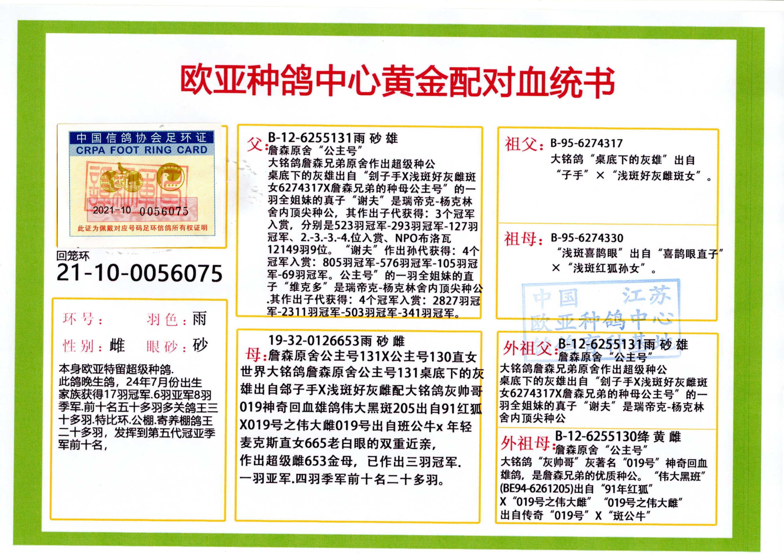 24年秋南京特比环欧亚荣获大团体冠军.小团体冠军551公里大特比13名.14名.16名.19名.20名.21名.24名.26名.27名.28名.42名.52名.54名.57名.65名.66名.68名.70名.71名.72名.74名.76名.80名.82名.83名.84名.85名.86名.90名.92名.110名.116名.121名.122名.128名.131名.158名.161名.164名.165名.166名.172名.174名.177名.182名.195名.196名.201名.205名.208名.210名.216名.253名.269名.275名.276名.294名.296名.299名,,24年秋云南天南铜都公棚决赛415名.天南铜都小棚决赛409名.云南玉活公棚决赛102名.490名.团体32名上笼二羽进二羽,天南铜都大棚506公里决赛445名。热烈祝贺河北省巨鹿县李兰生老师用欧亚泰山号血系连续十一年夺冠军,河北省国家赛冠军.全国季军等多次前十名高位,扬州王军王总用欧亚利奥24年春季获山东翔宇公棚决赛33名盖比53名。南京刘正龙刘总用欧亚盖比获得24年秋山东潍坊国际公棚决赛42名.精英赛30名.三关鸽王71名.决赛86名.加站赛16名.南京市特比环A组鸽王9名.B组鸽王5名.6名.C组鸽王5名.精英赛冠军4名.技能赛A组冠军4名.5名.秦淮区特比环荣获15名.46名.48名.87名。四川西昌徐亮徐总用欧亚利奥获得凉山州聚友决赛177名.第二关亚军双关鸽王19名.三关鸽王105名.云南豪庭公棚决赛603名。热烈祝贺24年四川重庆翔园鸽舍用欧亚泰山号荣获春季400公里冠军.秋季500公里冠军,河北王总用詹森X利奥获得千羽千翔公棚400公里冠军,广东蔡楷焕荣获24年秋爱好者 赛鸽俱乐部三关鸽王季军.一关420公里99名.二关450公里11名.三关520公里32名.单关季军.7名.12名,江西李卫兴荣获贵州红枫公棚8名.共翔俱乐部寄养棚四关综合鸽王30名.一关400公里78名.二关500公里55名.三关520公里37名.四关500公里57名.同父母获公棚18名.雷鸣获得武汉黄浦育翔中心冠军,四川陈文获得四川明鸿俱乐部300公里梦幻2名.3名.4名.9名.10名.13名.14名.15名.31名.34名.40名.41名.42名.43名.69名.71名.72名.73名.74名.94名.95名.97名.98名.99名.419公里决赛荣获总冠军7名.总共归巢9羽,四川徐亮获豪庭决赛603名,山西郑勇获得山西泰鑫公棚决赛255名詹森红狐,热烈祝贺马总获得开尔(飞跃队)决赛9名获奖金1310000万元.第一关52名,天津津福资赛180公里96名.获奖金429543万元,欧亚支持全国鸽友24年秋多人报喜 祝大家取得更好成绩,给欧亚报喜鸽友欧亚决定给每人赠送一羽超级种鸽。欧亚俱乐部特比环多关鸽王成绩:15年秋淮安特比环黑色星期一全会上笼9700多羽,当天无鸽归巢,第二天全会归巢357羽,本舍归巢158羽.前十名八羽.前一百名归巢57羽,16年春季获五关鸽王总冠军,总亚军四名.六名.七名.九名.十名.晶艺俱乐部520公里冠亚季军5名.6名.7名.9名.11名等,火车头冠军.季军6名.8名.9名.10名,16年秋晶艺俱乐部特比环520公里亚军.季军4名.6名.7名.9名,15年春南京白下特比环冠军.亚军.季军6名.7名.8名.9名.10名.指定鸽A B组获得冠军.亚军.季军4名.5名.,17年淮安特比环亚军.4名.5名.7名.8名.10名.六关鸽王总冠军.4名.6名.9名.10名,寄养棚宿迁刘总20羽特比环获冠军.季军.4名.7名.8名.9名等。18年荣获万羽特比环六关鸽王总冠军.总亚军.总季军.6名.8名.十名.单关四羽冠军.二羽亚军.四羽季军.前十名27羽。19年秋万羽特比环六关鸽王总亚军.总季军.5名.8名等,单关二羽冠军.三羽亚军.一羽季军前十名31羽。20年秋淮安市鸽会四关特比环大赛风雨无阻鸽王亚军.鸽王六名,金品俱乐部万羽特比环六关鸽王总冠军,总亚军.四名.五名.六名.七名.八名.十名.前二百名鸽王35羽,单关冠亚季军前十名四十多羽,火车头五关鸽王季军.六名.八名.前二百名鸽王十七羽。20年春荣获淮安五区一市四关鸽王总冠军.亚军.四名.八名.九名。21年秋荣获金品万羽特比环大赛六关鸽王总亚军.总季军.四名.七名.九名.十名.单关冠亚军季军前十名三十多羽。火车头协会鸽王六名.七名.十名.单关前十名十七羽。22年秋荣获鸽王总冠军.总亚军.5名.7名.8名.9名.11名.单关冠亚季军前十名三十多羽,第一关单关前二百名四十多羽,第二关前二百名三十多羽,第三关前二百名四十多羽,第四关前二百名四十多羽,第五关前一百名53羽。23年秋荣获鸽王季军.五名.八名.十名.13名.17名.20名.27名等多羽鸽王.单关前十名二十多羽。公棚.寄养棚部分成绩:16年秋宁夏黄河公棚总冠军电脑戈马力指定通炮冠军,17年送八羽参赛获得鸽王八名进奖四名,支持韩总荣获八名。支持鸽友荣获宁夏中卫公棚决赛总冠军.精英赛冠军,支持18年宁夏黄河公棚决赛冠军詹森X泰山。安徽鼎博寄养棚院内外四关鸽王总冠军.鸽王十七名.三十七名同窝,鸽王39名.42名.58名.67名。18年山东公棚预赛冠军.决赛65名.送八羽进奖五羽.指定获奔驰汽车一辆。支持鸽友获得云南蓝云公棚冠军.盖比X佛卡门。支持鸽友荣获云南银集公棚决赛冠军 詹森427X520血系 速度赛6700羽冠军。17年荣获金马俱乐部寄养棚四关鸽王总冠军.季军.六名.八名.第一关冠军.亚军.季军四名.七名.十一名.金牌教练奖。支持鸽友18年北京费翔公棚预赛九名电脑X桑杰士,支持鸽友荣获陕西威力公棚决赛11名.内蒙古临河寄养棚四关鸽王六名.詹森配泰山,支持河北王总用欧亚詹森427配胡本喜获20年秋开尔青年棚季军。云南东荣公棚16年预赛冠军.决赛77名.17年决赛12名.詹森红狐X泰山,17年平安公棚决赛4名 詹森427。欧亚获得21年金母寄养棚第一关四名.第二关5名.第三关5名.6名.7名.10名.三关鸽王总冠军,四关鸽王14名.十羽鸽王。支持河