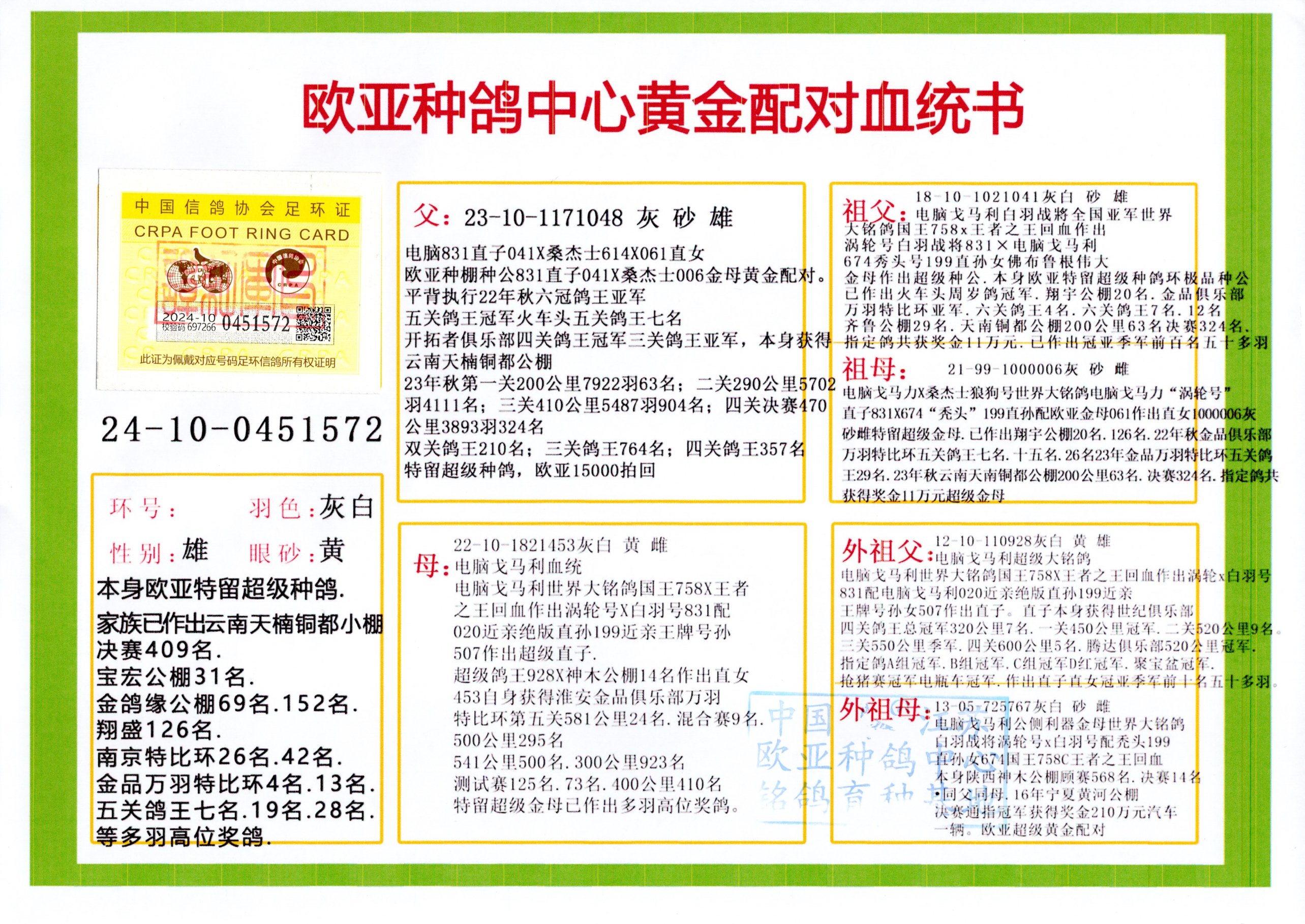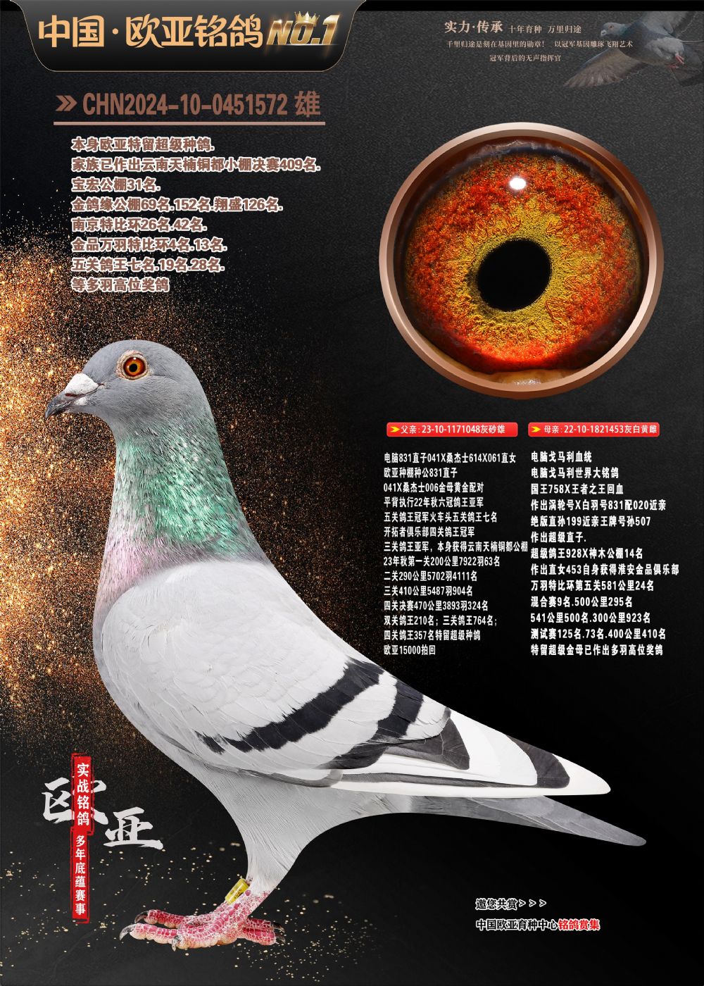 24年秋南京特比环欧亚荣获大团体冠军.小团体冠军551公里大特比13名.14名.16名.19名.20名.21名.24名.26名.27名.28名.42名.52名.54名.57名.65名.66名.68名.70名.71名.72名.74名.76名.80名.82名.83名.84名.85名.86名.90名.92名.110名.116名.121名.122名.128名.131名.158名.161名.164名.165名.166名.172名.174名.177名.182名.195名.196名.201名.205名.208名.210名.216名.253名.269名.275名.276名.294名.296名.299名,,24年秋云南天南铜都公棚决赛415名.天南铜都小棚决赛409名.云南玉活公棚决赛102名.490名.团体32名上笼二羽进二羽,天南铜都大棚506公里决赛445名。热烈祝贺河北省巨鹿县李兰生老师用欧亚泰山号血系连续十一年夺冠军,河北省国家赛冠军.全国季军等多次前十名高位,扬州王军王总用欧亚利奥24年春季获山东翔宇公棚决赛33名盖比53名。南京刘正龙刘总用欧亚盖比获得24年秋山东潍坊国际公棚决赛42名.精英赛30名.三关鸽王71名.决赛86名.加站赛16名.南京市特比环A组鸽王9名.B组鸽王5名.6名.C组鸽王5名.精英赛冠军4名.技能赛A组冠军4名.5名.秦淮区特比环荣获15名.46名.48名.87名。四川西昌徐亮徐总用欧亚利奥获得凉山州聚友决赛177名.第二关亚军双关鸽王19名.三关鸽王105名.云南豪庭公棚决赛603名。热烈祝贺24年四川重庆翔园鸽舍用欧亚泰山号荣获春季400公里冠军.秋季500公里冠军,河北王总用詹森X利奥获得千羽千翔公棚400公里冠军,广东蔡楷焕荣获24年秋爱好者 赛鸽俱乐部三关鸽王季军.一关420公里99名.二关450公里11名.三关520公里32名.单关季军.7名.12名,江西李卫兴荣获贵州红枫公棚8名.共翔俱乐部寄养棚四关综合鸽王30名.一关400公里78名.二关500公里55名.三关520公里37名.四关500公里57名.同父母获公棚18名.雷鸣获得武汉黄浦育翔中心冠军,四川陈文获得四川明鸿俱乐部300公里梦幻2名.3名.4名.9名.10名.13名.14名.15名.31名.34名.40名.41名.42名.43名.69名.71名.72名.73名.74名.94名.95名.97名.98名.99名.419公里决赛荣获总冠军7名.总共归巢9羽,四川徐亮获豪庭决赛603名,山西郑勇获得山西泰鑫公棚决赛255名詹森红狐,热烈祝贺马总获得开尔(飞跃队)决赛9名获奖金1310000万元.第一关52名,天津津福资赛180公里96名.获奖金429543万元,欧亚支持全国鸽友24年秋多人报喜 祝大家取得更好成绩,给欧亚报喜鸽友欧亚决定给每人赠送一羽超级种鸽。欧亚俱乐部特比环多关鸽王成绩:15年秋淮安特比环黑色星期一全会上笼9700多羽,当天无鸽归巢,第二天全会归巢357羽,本舍归巢158羽.前十名八羽.前一百名归巢57羽,16年春季获五关鸽王总冠军,总亚军四名.六名.七名.九名.十名.晶艺俱乐部520公里冠亚季军5名.6名.7名.9名.11名等,火车头冠军.季军6名.8名.9名.10名,16年秋晶艺俱乐部特比环520公里亚军.季军4名.6名.7名.9名,15年春南京白下特比环冠军.亚军.季军6名.7名.8名.9名.10名.指定鸽A B组获得冠军.亚军.季军4名.5名.,17年淮安特比环亚军.4名.5名.7名.8名.10名.六关鸽王总冠军.4名.6名.9名.10名,寄养棚宿迁刘总20羽特比环获冠军.季军.4名.7名.8名.9名等。18年荣获万羽特比环六关鸽王总冠军.总亚军.总季军.6名.8名.十名.单关四羽冠军.二羽亚军.四羽季军.前十名27羽。19年秋万羽特比环六关鸽王总亚军.总季军.5名.8名等,单关二羽冠军.三羽亚军.一羽季军前十名31羽。20年秋淮安市鸽会四关特比环大赛风雨无阻鸽王亚军.鸽王六名,金品俱乐部万羽特比环六关鸽王总冠军,总亚军.四名.五名.六名.七名.八名.十名.前二百名鸽王35羽,单关冠亚季军前十名四十多羽,火车头五关鸽王季军.六名.八名.前二百名鸽王十七羽。20年春荣获淮安五区一市四关鸽王总冠军.亚军.四名.八名.九名。21年秋荣获金品万羽特比环大赛六关鸽王总亚军.总季军.四名.七名.九名.十名.单关冠亚军季军前十名三十多羽。火车头协会鸽王六名.七名.十名.单关前十名十七羽。22年秋荣获鸽王总冠军.总亚军.5名.7名.8名.9名.11名.单关冠亚季军前十名三十多羽,第一关单关前二百名四十多羽,第二关前二百名三十多羽,第三关前二百名四十多羽,第四关前二百名四十多羽,第五关前一百名53羽。23年秋荣获鸽王季军.五名.八名.十名.13名.17名.20名.27名等多羽鸽王.单关前十名二十多羽。公棚.寄养棚部分成绩:16年秋宁夏黄河公棚总冠军电脑戈马力指定通炮冠军,17年送八羽参赛获得鸽王八名进奖四名,支持韩总荣获八名。支持鸽友荣获宁夏中卫公棚决赛总冠军.精英赛冠军,支持18年宁夏黄河公棚决赛冠军詹森X泰山。安徽鼎博寄养棚院内外四关鸽王总冠军.鸽王十七名.三十七名同窝,鸽王39名.42名.58名.67名。18年山东公棚预赛冠军.决赛65名.送八羽进奖五羽.指定获奔驰汽车一辆。支持鸽友获得云南蓝云公棚冠军.盖比X佛卡门。支持鸽友荣获云南银集公棚决赛冠军 詹森427X520血系 速度赛6700羽冠军。17年荣获金马俱乐部寄养棚四关鸽王总冠军.季军.六名.八名.第一关冠军.亚军.季军四名.七名.十一名.金牌教练奖。支持鸽友18年北京费翔公棚预赛九名电脑X桑杰士,支持鸽友荣获陕西威力公棚决赛11名.内蒙古临河寄养棚四关鸽王六名.詹森配泰山,支持河北王总用欧亚詹森427配胡本喜获20年秋开尔青年棚季军。云南东荣公棚16年预赛冠军.决赛77名.17年决赛12名.詹森红狐X泰山,17年平安公棚决赛4名 詹森427。欧亚获得21年金母寄养棚第一关四名.第二关5名.第三关5名.6名.7名.10名.三关鸽王总冠军,四关鸽王14名.十羽鸽王。支持河