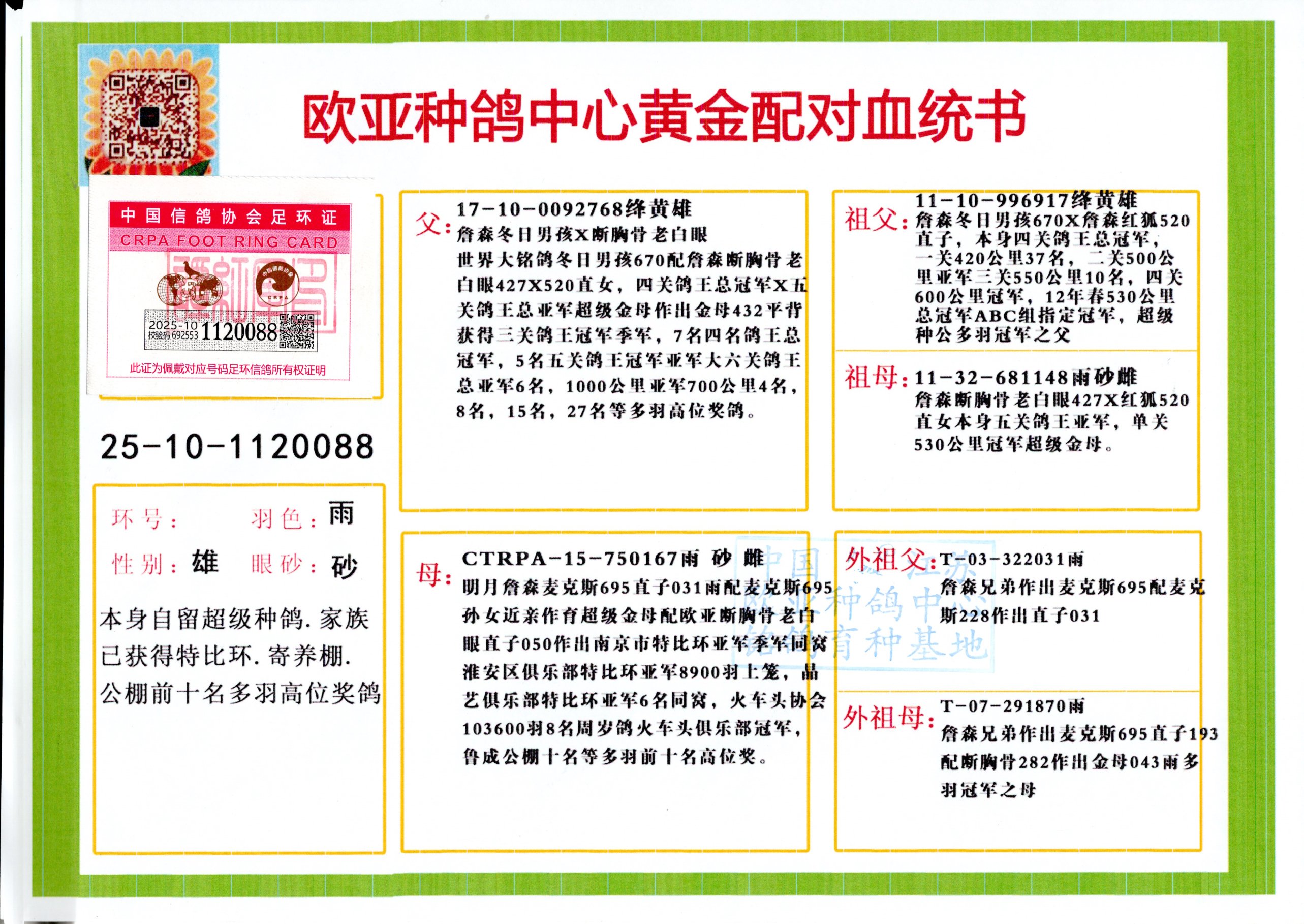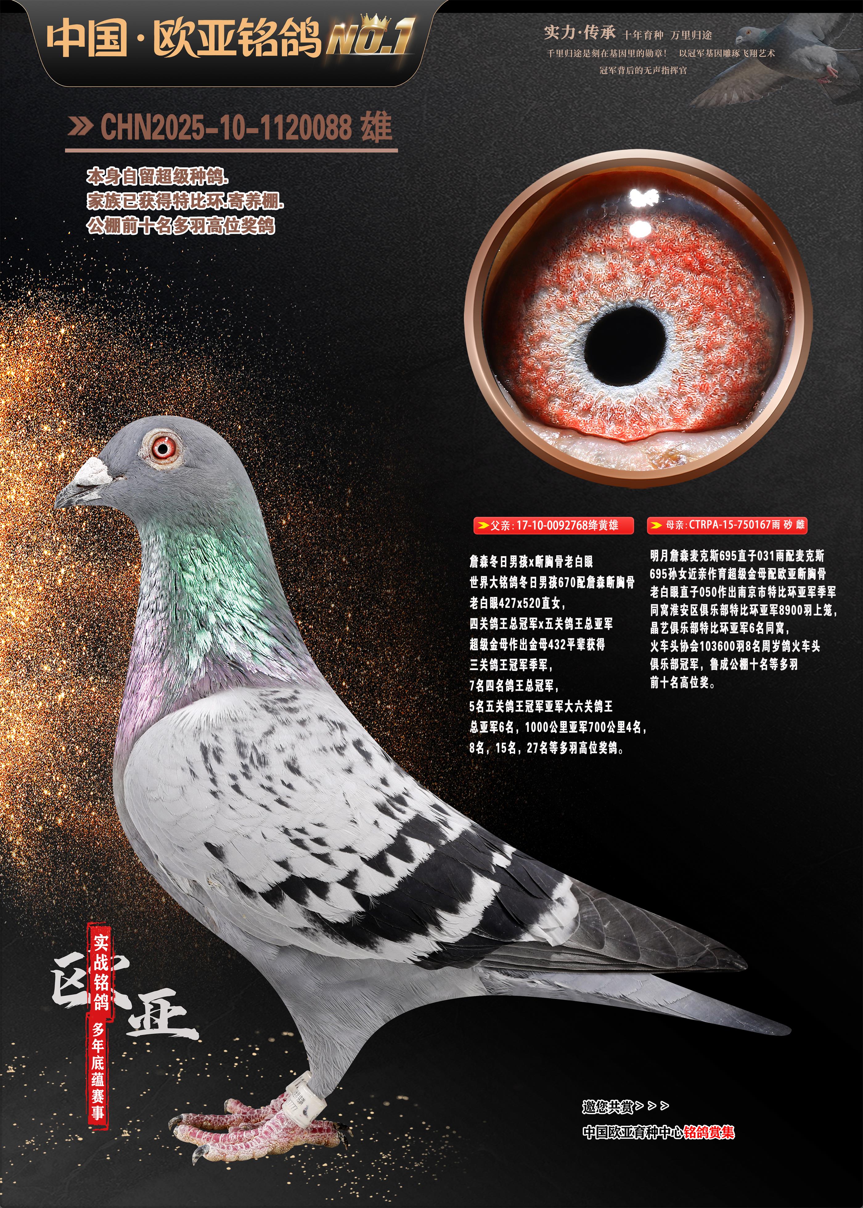 24年秋南京特比环欧亚荣获大团体冠军.小团体冠军551公里大特比13名.14名.16名.19名.20名.21名.24名.26名.27名.28名.42名.52名.54名.57名.65名.66名.68名.70名.71名.72名.74名.76名.80名.82名.83名.84名.85名.86名.90名.92名.110名.116名.121名.122名.128名.131名.158名.161名.164名.165名.166名.172名.174名.177名.182名.195名.196名.201名.205名.208名.210名.216名.253名.269名.275名.276名.294名.296名.299名,,24年秋云南天南铜都公棚决赛415名.天南铜都小棚决赛409名.云南玉活公棚决赛102名.490名.团体32名上笼二羽进二羽,天南铜都大棚506公里决赛445名。热烈祝贺河北省巨鹿县李兰生老师用欧亚泰山号血系连续十一年夺冠军,河北省国家赛冠军.全国季军等多次前十名高位,扬州王军王总用欧亚利奥24年春季获山东翔宇公棚决赛33名盖比53名。南京刘正龙刘总用欧亚盖比获得24年秋山东潍坊国际公棚决赛42名.精英赛30名.三关鸽王71名.决赛86名.加站赛16名.南京市特比环A组鸽王9名.B组鸽王5名.6名.C组鸽王5名.精英赛冠军4名.技能赛A组冠军4名.5名.秦淮区特比环荣获15名.46名.48名.87名。四川西昌徐亮徐总用欧亚利奥获得凉山州聚友决赛177名.第二关亚军双关鸽王19名.三关鸽王105名.云南豪庭公棚决赛603名。热烈祝贺24年四川重庆翔园鸽舍用欧亚泰山号荣获春季400公里冠军.秋季500公里冠军,河北王总用詹森X利奥获得千羽千翔公棚400公里冠军,广东蔡楷焕荣获24年秋爱好者 赛鸽俱乐部三关鸽王季军.一关420公里99名.二关450公里11名.三关520公里32名.单关季军.7名.12名,江西李卫兴荣获贵州红枫公棚8名.共翔俱乐部寄养棚四关综合鸽王30名.一关400公里78名.二关500公里55名.三关520公里37名.四关500公里57名.同父母获公棚18名.雷鸣获得武汉黄浦育翔中心冠军,四川陈文获得四川明鸿俱乐部300公里梦幻2名.3名.4名.9名.10名.13名.14名.15名.31名.34名.40名.41名.42名.43名.69名.71名.72名.73名.74名.94名.95名.97名.98名.99名.419公里决赛荣获总冠军7名.总共归巢9羽,四川徐亮获豪庭决赛603名,山西郑勇获得山西泰鑫公棚决赛255名詹森红狐,热烈祝贺马总获得开尔(飞跃队)决赛9名获奖金1310000万元.第一关52名,天津津福资赛180公里96名.获奖金429543万元,欧亚支持全国鸽友24年秋多人报喜 祝大家取得更好成绩,给欧亚报喜鸽友欧亚决定给每人赠送一羽超级种鸽。欧亚俱乐部特比环多关鸽王成绩:15年秋淮安特比环黑色星期一全会上笼9700多羽,当天无鸽归巢,第二天全会归巢357羽,本舍归巢158羽.前十名八羽.前一百名归巢57羽,16年春季获五关鸽王总冠军,总亚军四名.六名.七名.九名.十名.晶艺俱乐部520公里冠亚季军5名.6名.7名.9名.11名等,火车头冠军.季军6名.8名.9名.10名,16年秋晶艺俱乐部特比环520公里亚军.季军4名.6名.7名.9名,15年春南京白下特比环冠军.亚军.季军6名.7名.8名.9名.10名.指定鸽A B组获得冠军.亚军.季军4名.5名.,17年淮安特比环亚军.4名.5名.7名.8名.10名.六关鸽王总冠军.4名.6名.9名.10名,寄养棚宿迁刘总20羽特比环获冠军.季军.4名.7名.8名.9名等。18年荣获万羽特比环六关鸽王总冠军.总亚军.总季军.6名.8名.十名.单关四羽冠军.二羽亚军.四羽季军.前十名27羽。19年秋万羽特比环六关鸽王总亚军.总季军.5名.8名等,单关二羽冠军.三羽亚军.一羽季军前十名31羽。20年秋淮安市鸽会四关特比环大赛风雨无阻鸽王亚军.鸽王六名,金品俱乐部万羽特比环六关鸽王总冠军,总亚军.四名.五名.六名.七名.八名.十名.前二百名鸽王35羽,单关冠亚季军前十名四十多羽,火车头五关鸽王季军.六名.八名.前二百名鸽王十七羽。20年春荣获淮安五区一市四关鸽王总冠军.亚军.四名.八名.九名。21年秋荣获金品万羽特比环大赛六关鸽王总亚军.总季军.四名.七名.九名.十名.单关冠亚军季军前十名三十多羽。火车头协会鸽王六名.七名.十名.单关前十名十七羽。22年秋荣获鸽王总冠军.总亚军.5名.7名.8名.9名.11名.单关冠亚季军前十名三十多羽,第一关单关前二百名四十多羽,第二关前二百名三十多羽,第三关前二百名四十多羽,第四关前二百名四十多羽,第五关前一百名53羽。23年秋荣获鸽王季军.五名.八名.十名.13名.17名.20名.27名等多羽鸽王.单关前十名二十多羽。公棚.寄养棚部分成绩:16年秋宁夏黄河公棚总冠军电脑戈马力指定通炮冠军,17年送八羽参赛获得鸽王八名进奖四名,支持韩总荣获八名。支持鸽友荣获宁夏中卫公棚决赛总冠军.精英赛冠军,支持18年宁夏黄河公棚决赛冠军詹森X泰山。安徽鼎博寄养棚院内外四关鸽王总冠军.鸽王十七名.三十七名同窝,鸽王39名.42名.58名.67名。18年山东公棚预赛冠军.决赛65名.送八羽进奖五羽.指定获奔驰汽车一辆。支持鸽友获得云南蓝云公棚冠军.盖比X佛卡门。支持鸽友荣获云南银集公棚决赛冠军 詹森427X520血系 速度赛6700羽冠军。17年荣获金马俱乐部寄养棚四关鸽王总冠军.季军.六名.八名.第一关冠军.亚军.季军四名.七名.十一名.金牌教练奖。支持鸽友18年北京费翔公棚预赛九名电脑X桑杰士,支持鸽友荣获陕西威力公棚决赛11名.内蒙古临河寄养棚四关鸽王六名.詹森配泰山,支持河北王总用欧亚詹森427配胡本喜获20年秋开尔青年棚季军。云南东荣公棚16年预赛冠军.决赛77名.17年决赛12名.詹森红狐X泰山,17年平安公棚决赛4名 詹森427。欧亚获得21年金母寄养棚第一关四名.第二关5名.第三关5名.6名.7名.10名.三关鸽王总冠军,四关鸽王14名.十羽鸽王。支持河