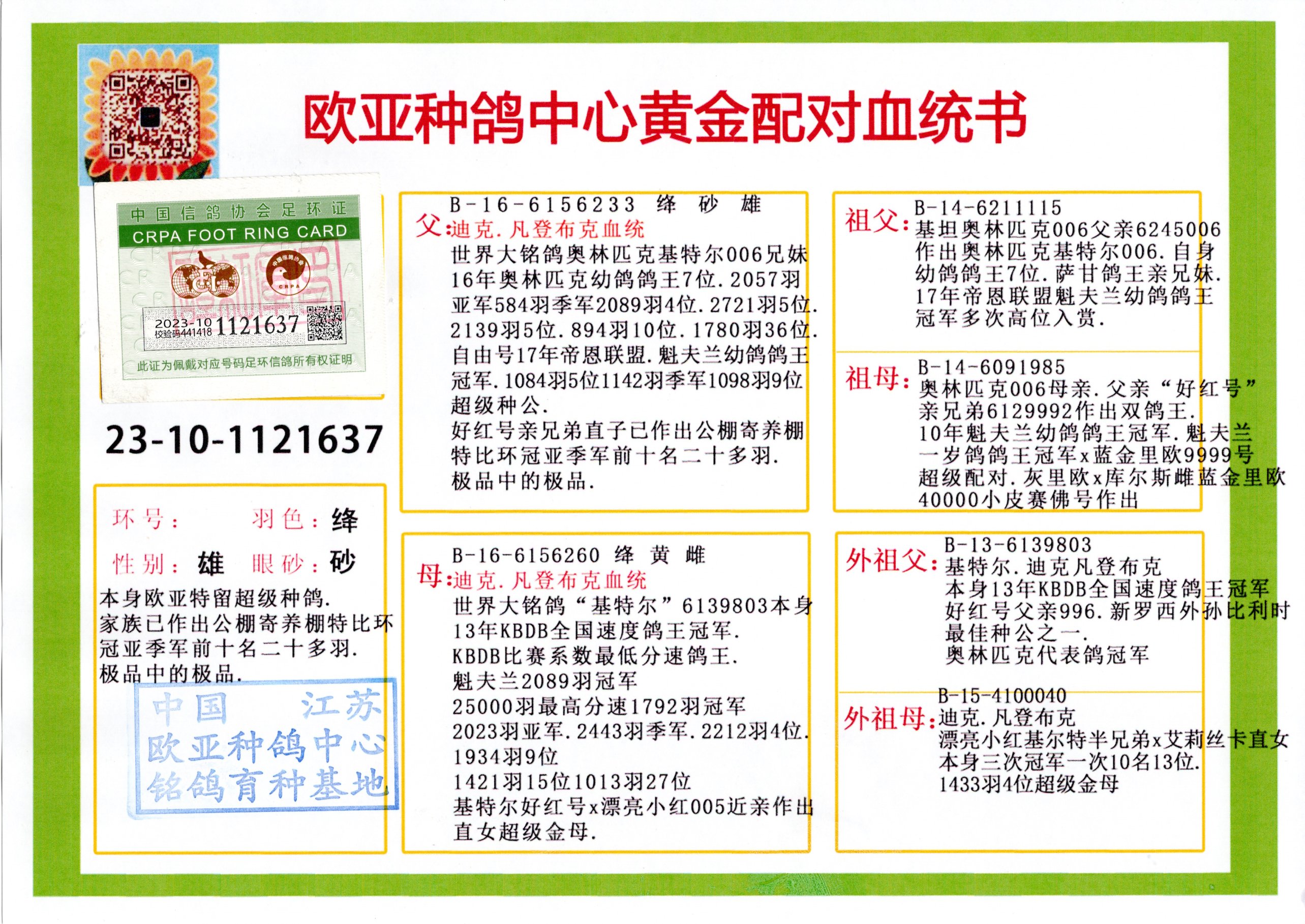 24年秋南京特比环欧亚荣获大团体冠军.小团体冠军551公里大特比13名.14名.16名.19名.20名.21名.24名.26名.27名.28名.42名.52名.54名.57名.65名.66名.68名.70名.71名.72名.74名.76名.80名.82名.83名.84名.85名.86名.90名.92名.110名.116名.121名.122名.128名.131名.158名.161名.164名.165名.166名.172名.174名.177名.182名.195名.196名.201名.205名.208名.210名.216名.253名.269名.275名.276名.294名.296名.299名,,24年秋云南天南铜都公棚决赛415名.天南铜都小棚决赛409名.云南玉活公棚决赛102名.490名.团体32名上笼二羽进二羽,天南铜都大棚506公里决赛445名。热烈祝贺河北省巨鹿县李兰生老师用欧亚泰山号血系连续十一年夺冠军,河北省国家赛冠军.全国季军等多次前十名高位,扬州王军王总用欧亚利奥24年春季获山东翔宇公棚决赛33名盖比53名。南京刘正龙刘总用欧亚盖比获得24年秋山东潍坊国际公棚决赛42名.精英赛30名.三关鸽王71名.决赛86名.加站赛16名.南京市特比环A组鸽王9名.B组鸽王5名.6名.C组鸽王5名.精英赛冠军4名.技能赛A组冠军4名.5名.秦淮区特比环荣获15名.46名.48名.87名。四川西昌徐亮徐总用欧亚利奥获得凉山州聚友决赛177名.第二关亚军双关鸽王19名.三关鸽王105名.云南豪庭公棚决赛603名。热烈祝贺24年四川重庆翔园鸽舍用欧亚泰山号荣获春季400公里冠军.秋季500公里冠军,河北王总用詹森X利奥获得千羽千翔公棚400公里冠军,广东蔡楷焕荣获24年秋爱好者 赛鸽俱乐部三关鸽王季军.一关420公里99名.二关450公里11名.三关520公里32名.单关季军.7名.12名,江西李卫兴荣获贵州红枫公棚8名.共翔俱乐部寄养棚四关综合鸽王30名.一关400公里78名.二关500公里55名.三关520公里37名.四关500公里57名.同父母获公棚18名.雷鸣获得武汉黄浦育翔中心冠军,四川陈文获得四川明鸿俱乐部300公里梦幻2名.3名.4名.9名.10名.13名.14名.15名.31名.34名.40名.41名.42名.43名.69名.71名.72名.73名.74名.94名.95名.97名.98名.99名.419公里决赛荣获总冠军7名.总共归巢9羽,四川徐亮获豪庭决赛603名,山西郑勇获得山西泰鑫公棚决赛255名詹森红狐,热烈祝贺马总获得开尔(飞跃队)决赛9名获奖金1310000万元.第一关52名,天津津福资赛180公里96名.获奖金429543万元,欧亚支持全国鸽友24年秋多人报喜 祝大家取得更好成绩,给欧亚报喜鸽友欧亚决定给每人赠送一羽超级种鸽。欧亚俱乐部特比环多关鸽王成绩:15年秋淮安特比环黑色星期一全会上笼9700多羽,当天无鸽归巢,第二天全会归巢357羽,本舍归巢158羽.前十名八羽.前一百名归巢57羽,16年春季获五关鸽王总冠军,总亚军四名.六名.七名.九名.十名.晶艺俱乐部520公里冠亚季军5名.6名.7名.9名.11名等,火车头冠军.季军6名.8名.9名.10名,16年秋晶艺俱乐部特比环520公里亚军.季军4名.6名.7名.9名,15年春南京白下特比环冠军.亚军.季军6名.7名.8名.9名.10名.指定鸽A B组获得冠军.亚军.季军4名.5名.,17年淮安特比环亚军.4名.5名.7名.8名.10名.六关鸽王总冠军.4名.6名.9名.10名,寄养棚宿迁刘总20羽特比环获冠军.季军.4名.7名.8名.9名等。18年荣获万羽特比环六关鸽王总冠军.总亚军.总季军.6名.8名.十名.单关四羽冠军.二羽亚军.四羽季军.前十名27羽。19年秋万羽特比环六关鸽王总亚军.总季军.5名.8名等,单关二羽冠军.三羽亚军.一羽季军前十名31羽。20年秋淮安市鸽会四关特比环大赛风雨无阻鸽王亚军.鸽王六名,金品俱乐部万羽特比环六关鸽王总冠军,总亚军.四名.五名.六名.七名.八名.十名.前二百名鸽王35羽,单关冠亚季军前十名四十多羽,火车头五关鸽王季军.六名.八名.前二百名鸽王十七羽。20年春荣获淮安五区一市四关鸽王总冠军.亚军.四名.八名.九名。21年秋荣获金品万羽特比环大赛六关鸽王总亚军.总季军.四名.七名.九名.十名.单关冠亚军季军前十名三十多羽。火车头协会鸽王六名.七名.十名.单关前十名十七羽。22年秋荣获鸽王总冠军.总亚军.5名.7名.8名.9名.11名.单关冠亚季军前十名三十多羽,第一关单关前二百名四十多羽,第二关前二百名三十多羽,第三关前二百名四十多羽,第四关前二百名四十多羽,第五关前一百名53羽。23年秋荣获鸽王季军.五名.八名.十名.13名.17名.20名.27名等多羽鸽王.单关前十名二十多羽。公棚.寄养棚部分成绩:16年秋宁夏黄河公棚总冠军电脑戈马力指定通炮冠军,17年送八羽参赛获得鸽王八名进奖四名,支持韩总荣获八名。支持鸽友荣获宁夏中卫公棚决赛总冠军.精英赛冠军,支持18年宁夏黄河公棚决赛冠军詹森X泰山。安徽鼎博寄养棚院内外四关鸽王总冠军.鸽王十七名.三十七名同窝,鸽王39名.42名.58名.67名。18年山东公棚预赛冠军.决赛65名.送八羽进奖五羽.指定获奔驰汽车一辆。支持鸽友获得云南蓝云公棚冠军.盖比X佛卡门。支持鸽友荣获云南银集公棚决赛冠军 詹森427X520血系 速度赛6700羽冠军。17年荣获金马俱乐部寄养棚四关鸽王总冠军.季军.六名.八名.第一关冠军.亚军.季军四名.七名.十一名.金牌教练奖。支持鸽友18年北京费翔公棚预赛九名电脑X桑杰士,支持鸽友荣获陕西威力公棚决赛11名.内蒙古临河寄养棚四关鸽王六名.詹森配泰山,支持河北王总用欧亚詹森427配胡本喜获20年秋开尔青年棚季军。云南东荣公棚16年预赛冠军.决赛77名.17年决赛12名.詹森红狐X泰山,17年平安公棚决赛4名 詹森427。欧亚获得21年金母寄养棚第一关四名.第二关5名.第三关5名.6名.7名.10名.三关鸽王总冠军,四关鸽王14名.十羽鸽王。支持河