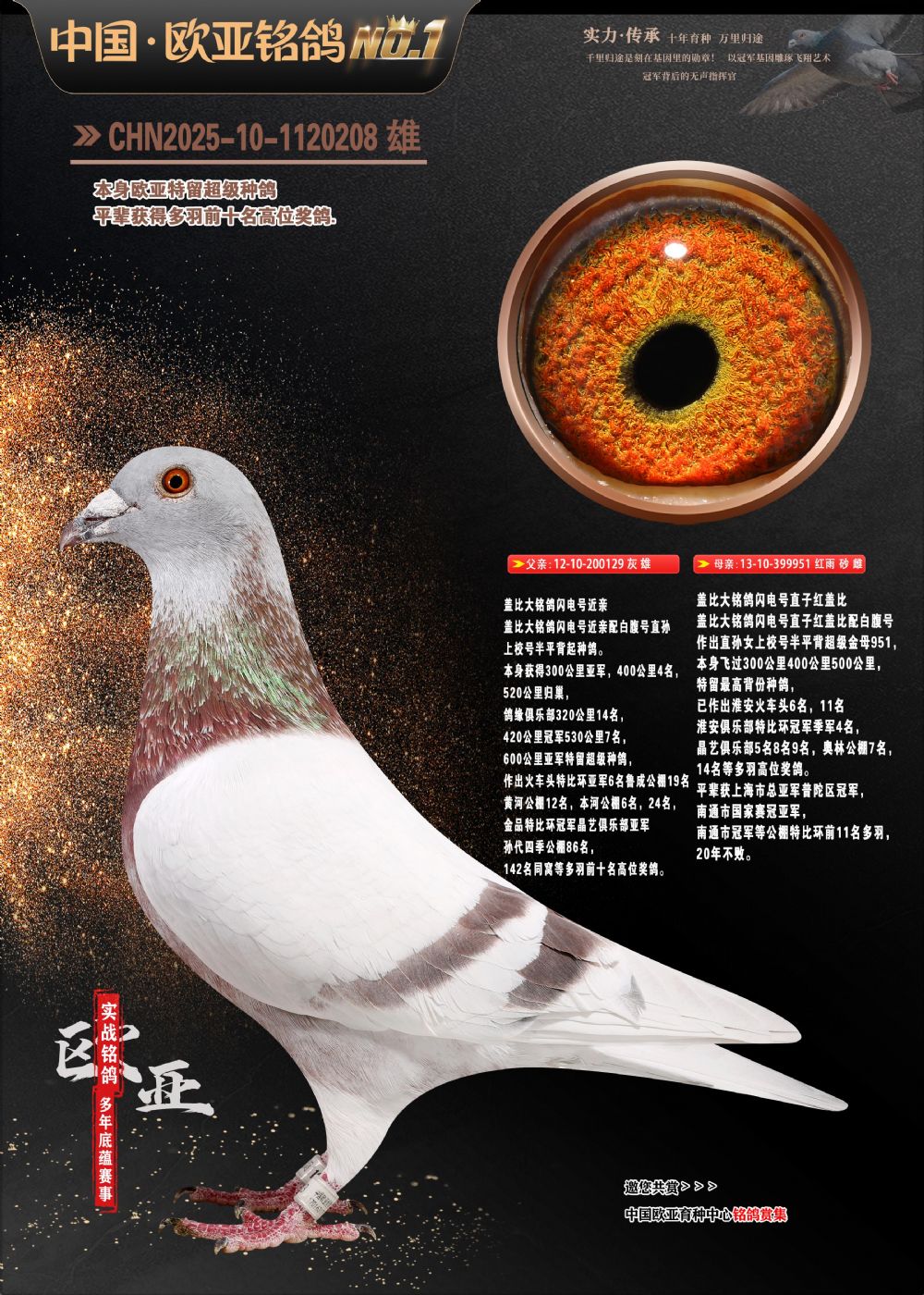 24年秋南京特比环欧亚荣获大团体冠军.小团体冠军551公里大特比13名.14名.16名.19名.20名.21名.24名.26名.27名.28名.42名.52名.54名.57名.65名.66名.68名.70名.71名.72名.74名.76名.80名.82名.83名.84名.85名.86名.90名.92名.110名.116名.121名.122名.128名.131名.158名.161名.164名.165名.166名.172名.174名.177名.182名.195名.196名.201名.205名.208名.210名.216名.253名.269名.275名.276名.294名.296名.299名,,24年秋云南天南铜都公棚决赛415名.天南铜都小棚决赛409名.云南玉活公棚决赛102名.490名.团体32名上笼二羽进二羽,天南铜都大棚506公里决赛445名。热烈祝贺河北省巨鹿县李兰生老师用欧亚泰山号血系连续十一年夺冠军,河北省国家赛冠军.全国季军等多次前十名高位,扬州王军王总用欧亚利奥24年春季获山东翔宇公棚决赛33名盖比53名。南京刘正龙刘总用欧亚盖比获得24年秋山东潍坊国际公棚决赛42名.精英赛30名.三关鸽王71名.决赛86名.加站赛16名.南京市特比环A组鸽王9名.B组鸽王5名.6名.C组鸽王5名.精英赛冠军4名.技能赛A组冠军4名.5名.秦淮区特比环荣获15名.46名.48名.87名。四川西昌徐亮徐总用欧亚利奥获得凉山州聚友决赛177名.第二关亚军双关鸽王19名.三关鸽王105名.云南豪庭公棚决赛603名。热烈祝贺24年四川重庆翔园鸽舍用欧亚泰山号荣获春季400公里冠军.秋季500公里冠军,河北王总用詹森X利奥获得千羽千翔公棚400公里冠军,广东蔡楷焕荣获24年秋爱好者 赛鸽俱乐部三关鸽王季军.一关420公里99名.二关450公里11名.三关520公里32名.单关季军.7名.12名,江西李卫兴荣获贵州红枫公棚8名.共翔俱乐部寄养棚四关综合鸽王30名.一关400公里78名.二关500公里55名.三关520公里37名.四关500公里57名.同父母获公棚18名.雷鸣获得武汉黄浦育翔中心冠军,四川陈文获得四川明鸿俱乐部300公里梦幻2名.3名.4名.9名.10名.13名.14名.15名.31名.34名.40名.41名.42名.43名.69名.71名.72名.73名.74名.94名.95名.97名.98名.99名.419公里决赛荣获总冠军7名.总共归巢9羽,四川徐亮获豪庭决赛603名,山西郑勇获得山西泰鑫公棚决赛255名詹森红狐,热烈祝贺马总获得开尔(飞跃队)决赛9名获奖金1310000万元.第一关52名,天津津福资赛180公里96名.获奖金429543万元,欧亚支持全国鸽友24年秋多人报喜 祝大家取得更好成绩,给欧亚报喜鸽友欧亚决定给每人赠送一羽超级种鸽。欧亚俱乐部特比环多关鸽王成绩:15年秋淮安特比环黑色星期一全会上笼9700多羽,当天无鸽归巢,第二天全会归巢357羽,本舍归巢158羽.前十名八羽.前一百名归巢57羽,16年春季获五关鸽王总冠军,总亚军四名.六名.七名.九名.十名.晶艺俱乐部520公里冠亚季军5名.6名.7名.9名.11名等,火车头冠军.季军6名.8名.9名.10名,16年秋晶艺俱乐部特比环520公里亚军.季军4名.6名.7名.9名,15年春南京白下特比环冠军.亚军.季军6名.7名.8名.9名.10名.指定鸽A B组获得冠军.亚军.季军4名.5名.,17年淮安特比环亚军.4名.5名.7名.8名.10名.六关鸽王总冠军.4名.6名.9名.10名,寄养棚宿迁刘总20羽特比环获冠军.季军.4名.7名.8名.9名等。18年荣获万羽特比环六关鸽王总冠军.总亚军.总季军.6名.8名.十名.单关四羽冠军.二羽亚军.四羽季军.前十名27羽。19年秋万羽特比环六关鸽王总亚军.总季军.5名.8名等,单关二羽冠军.三羽亚军.一羽季军前十名31羽。20年秋淮安市鸽会四关特比环大赛风雨无阻鸽王亚军.鸽王六名,金品俱乐部万羽特比环六关鸽王总冠军,总亚军.四名.五名.六名.七名.八名.十名.前二百名鸽王35羽,单关冠亚季军前十名四十多羽,火车头五关鸽王季军.六名.八名.前二百名鸽王十七羽。20年春荣获淮安五区一市四关鸽王总冠军.亚军.四名.八名.九名。21年秋荣获金品万羽特比环大赛六关鸽王总亚军.总季军.四名.七名.九名.十名.单关冠亚军季军前十名三十多羽。火车头协会鸽王六名.七名.十名.单关前十名十七羽。22年秋荣获鸽王总冠军.总亚军.5名.7名.8名.9名.11名.单关冠亚季军前十名三十多羽,第一关单关前二百名四十多羽,第二关前二百名三十多羽,第三关前二百名四十多羽,第四关前二百名四十多羽,第五关前一百名53羽。23年秋荣获鸽王季军.五名.八名.十名.13名.17名.20名.27名等多羽鸽王.单关前十名二十多羽。公棚.寄养棚部分成绩:16年秋宁夏黄河公棚总冠军电脑戈马力指定通炮冠军,17年送八羽参赛获得鸽王八名进奖四名,支持韩总荣获八名。支持鸽友荣获宁夏中卫公棚决赛总冠军.精英赛冠军,支持18年宁夏黄河公棚决赛冠军詹森X泰山。安徽鼎博寄养棚院内外四关鸽王总冠军.鸽王十七名.三十七名同窝,鸽王39名.42名.58名.67名。18年山东公棚预赛冠军.决赛65名.送八羽进奖五羽.指定获奔驰汽车一辆。支持鸽友获得云南蓝云公棚冠军.盖比X佛卡门。支持鸽友荣获云南银集公棚决赛冠军 詹森427X520血系 速度赛6700羽冠军。17年荣获金马俱乐部寄养棚四关鸽王总冠军.季军.六名.八名.第一关冠军.亚军.季军四名.七名.十一名.金牌教练奖。支持鸽友18年北京费翔公棚预赛九名电脑X桑杰士,支持鸽友荣获陕西威力公棚决赛11名.内蒙古临河寄养棚四关鸽王六名.詹森配泰山,支持河北王总用欧亚詹森427配胡本喜获20年秋开尔青年棚季军。云南东荣公棚16年预赛冠军.决赛77名.17年决赛12名.詹森红狐X泰山,17年平安公棚决赛4名 詹森427。欧亚获得21年金母寄养棚第一关四名.第二关5名.第三关5名.6名.7名.10名.三关鸽王总冠军,四关鸽王14名.十羽鸽王。支持河