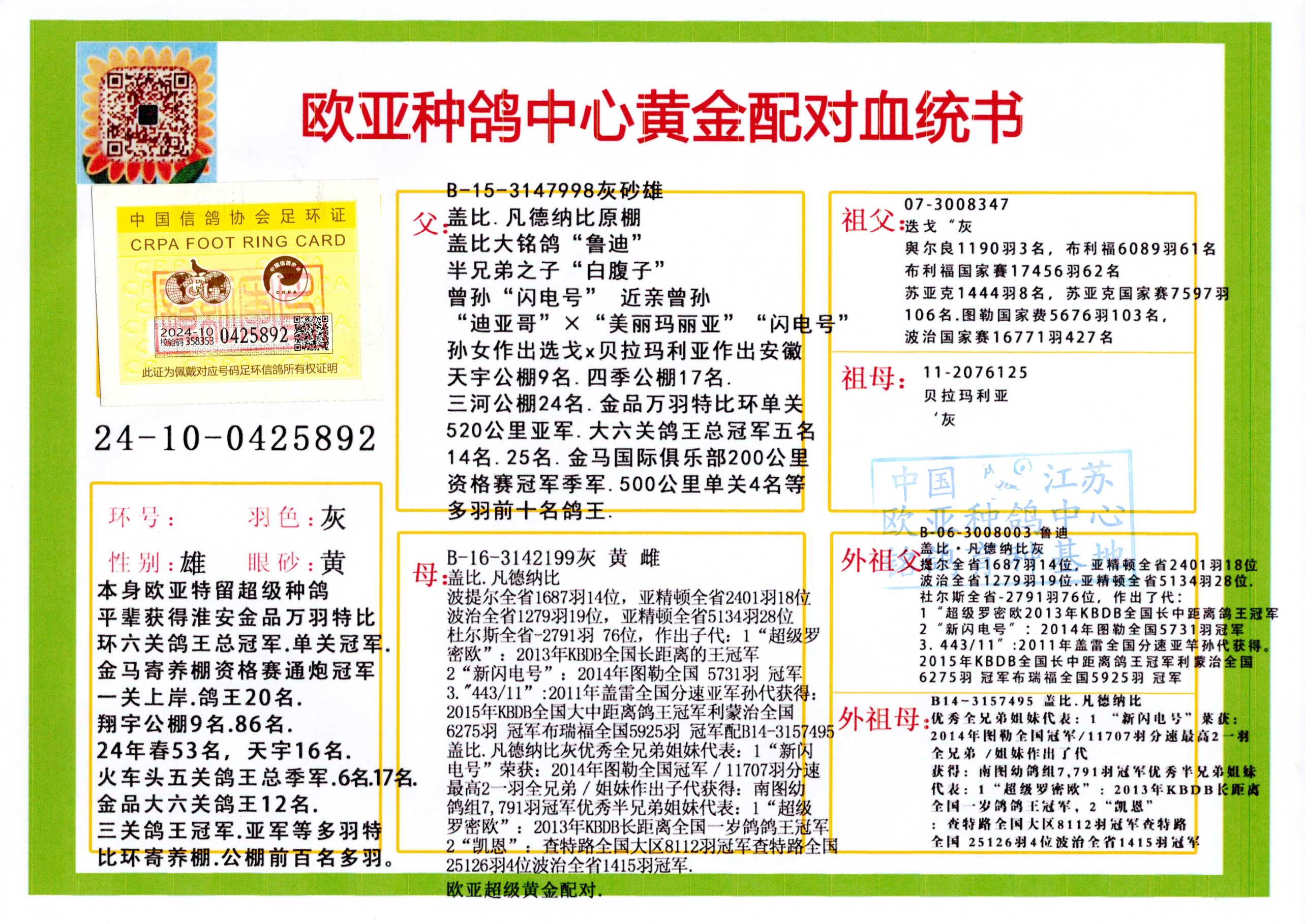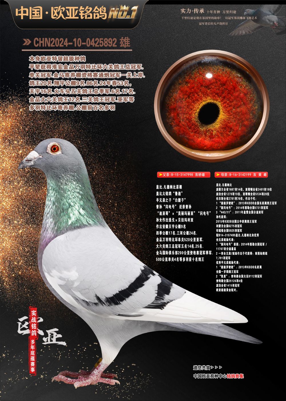 24年秋南京特比环欧亚荣获大团体冠军.小团体冠军551公里大特比13名.14名.16名.19名.20名.21名.24名.26名.27名.28名.42名.52名.54名.57名.65名.66名.68名.70名.71名.72名.74名.76名.80名.82名.83名.84名.85名.86名.90名.92名.110名.116名.121名.122名.128名.131名.158名.161名.164名.165名.166名.172名.174名.177名.182名.195名.196名.201名.205名.208名.210名.216名.253名.269名.275名.276名.294名.296名.299名,,24年秋云南天南铜都公棚决赛415名.天南铜都小棚决赛409名.云南玉活公棚决赛102名.490名.团体32名上笼二羽进二羽,天南铜都大棚506公里决赛445名。热烈祝贺河北省巨鹿县李兰生老师用欧亚泰山号血系连续十一年夺冠军,河北省国家赛冠军.全国季军等多次前十名高位,扬州王军王总用欧亚利奥24年春季获山东翔宇公棚决赛33名盖比53名。南京刘正龙刘总用欧亚盖比获得24年秋山东潍坊国际公棚决赛42名.精英赛30名.三关鸽王71名.决赛86名.加站赛16名.南京市特比环A组鸽王9名.B组鸽王5名.6名.C组鸽王5名.精英赛冠军4名.技能赛A组冠军4名.5名.秦淮区特比环荣获15名.46名.48名.87名。四川西昌徐亮徐总用欧亚利奥获得凉山州聚友决赛177名.第二关亚军双关鸽王19名.三关鸽王105名.云南豪庭公棚决赛603名。热烈祝贺24年四川重庆翔园鸽舍用欧亚泰山号荣获春季400公里冠军.秋季500公里冠军,河北王总用詹森X利奥获得千羽千翔公棚400公里冠军,广东蔡楷焕荣获24年秋爱好者 赛鸽俱乐部三关鸽王季军.一关420公里99名.二关450公里11名.三关520公里32名.单关季军.7名.12名,江西李卫兴荣获贵州红枫公棚8名.共翔俱乐部寄养棚四关综合鸽王30名.一关400公里78名.二关500公里55名.三关520公里37名.四关500公里57名.同父母获公棚18名.雷鸣获得武汉黄浦育翔中心冠军,四川陈文获得四川明鸿俱乐部300公里梦幻2名.3名.4名.9名.10名.13名.14名.15名.31名.34名.40名.41名.42名.43名.69名.71名.72名.73名.74名.94名.95名.97名.98名.99名.419公里决赛荣获总冠军7名.总共归巢9羽,四川徐亮获豪庭决赛603名,山西郑勇获得山西泰鑫公棚决赛255名詹森红狐,热烈祝贺马总获得开尔(飞跃队)决赛9名获奖金1310000万元.第一关52名,天津津福资赛180公里96名.获奖金429543万元,欧亚支持全国鸽友24年秋多人报喜 祝大家取得更好成绩,给欧亚报喜鸽友欧亚决定给每人赠送一羽超级种鸽。欧亚俱乐部特比环多关鸽王成绩:15年秋淮安特比环黑色星期一全会上笼9700多羽,当天无鸽归巢,第二天全会归巢357羽,本舍归巢158羽.前十名八羽.前一百名归巢57羽,16年春季获五关鸽王总冠军,总亚军四名.六名.七名.九名.十名.晶艺俱乐部520公里冠亚季军5名.6名.7名.9名.11名等,火车头冠军.季军6名.8名.9名.10名,16年秋晶艺俱乐部特比环520公里亚军.季军4名.6名.7名.9名,15年春南京白下特比环冠军.亚军.季军6名.7名.8名.9名.10名.指定鸽A B组获得冠军.亚军.季军4名.5名.,17年淮安特比环亚军.4名.5名.7名.8名.10名.六关鸽王总冠军.4名.6名.9名.10名,寄养棚宿迁刘总20羽特比环获冠军.季军.4名.7名.8名.9名等。18年荣获万羽特比环六关鸽王总冠军.总亚军.总季军.6名.8名.十名.单关四羽冠军.二羽亚军.四羽季军.前十名27羽。19年秋万羽特比环六关鸽王总亚军.总季军.5名.8名等,单关二羽冠军.三羽亚军.一羽季军前十名31羽。20年秋淮安市鸽会四关特比环大赛风雨无阻鸽王亚军.鸽王六名,金品俱乐部万羽特比环六关鸽王总冠军,总亚军.四名.五名.六名.七名.八名.十名.前二百名鸽王35羽,单关冠亚季军前十名四十多羽,火车头五关鸽王季军.六名.八名.前二百名鸽王十七羽。20年春荣获淮安五区一市四关鸽王总冠军.亚军.四名.八名.九名。21年秋荣获金品万羽特比环大赛六关鸽王总亚军.总季军.四名.七名.九名.十名.单关冠亚军季军前十名三十多羽。火车头协会鸽王六名.七名.十名.单关前十名十七羽。22年秋荣获鸽王总冠军.总亚军.5名.7名.8名.9名.11名.单关冠亚季军前十名三十多羽,第一关单关前二百名四十多羽,第二关前二百名三十多羽,第三关前二百名四十多羽,第四关前二百名四十多羽,第五关前一百名53羽。23年秋荣获鸽王季军.五名.八名.十名.13名.17名.20名.27名等多羽鸽王.单关前十名二十多羽。公棚.寄养棚部分成绩:16年秋宁夏黄河公棚总冠军电脑戈马力指定通炮冠军,17年送八羽参赛获得鸽王八名进奖四名,支持韩总荣获八名。支持鸽友荣获宁夏中卫公棚决赛总冠军.精英赛冠军,支持18年宁夏黄河公棚决赛冠军詹森X泰山。安徽鼎博寄养棚院内外四关鸽王总冠军.鸽王十七名.三十七名同窝,鸽王39名.42名.58名.67名。18年山东公棚预赛冠军.决赛65名.送八羽进奖五羽.指定获奔驰汽车一辆。支持鸽友获得云南蓝云公棚冠军.盖比X佛卡门。支持鸽友荣获云南银集公棚决赛冠军 詹森427X520血系 速度赛6700羽冠军。17年荣获金马俱乐部寄养棚四关鸽王总冠军.季军.六名.八名.第一关冠军.亚军.季军四名.七名.十一名.金牌教练奖。支持鸽友18年北京费翔公棚预赛九名电脑X桑杰士,支持鸽友荣获陕西威力公棚决赛11名.内蒙古临河寄养棚四关鸽王六名.詹森配泰山,支持河北王总用欧亚詹森427配胡本喜获20年秋开尔青年棚季军。云南东荣公棚16年预赛冠军.决赛77名.17年决赛12名.詹森红狐X泰山,17年平安公棚决赛4名 詹森427。欧亚获得21年金母寄养棚第一关四名.第二关5名.第三关5名.6名.7名.10名.三关鸽王总冠军,四关鸽王14名.十羽鸽王。支持河
