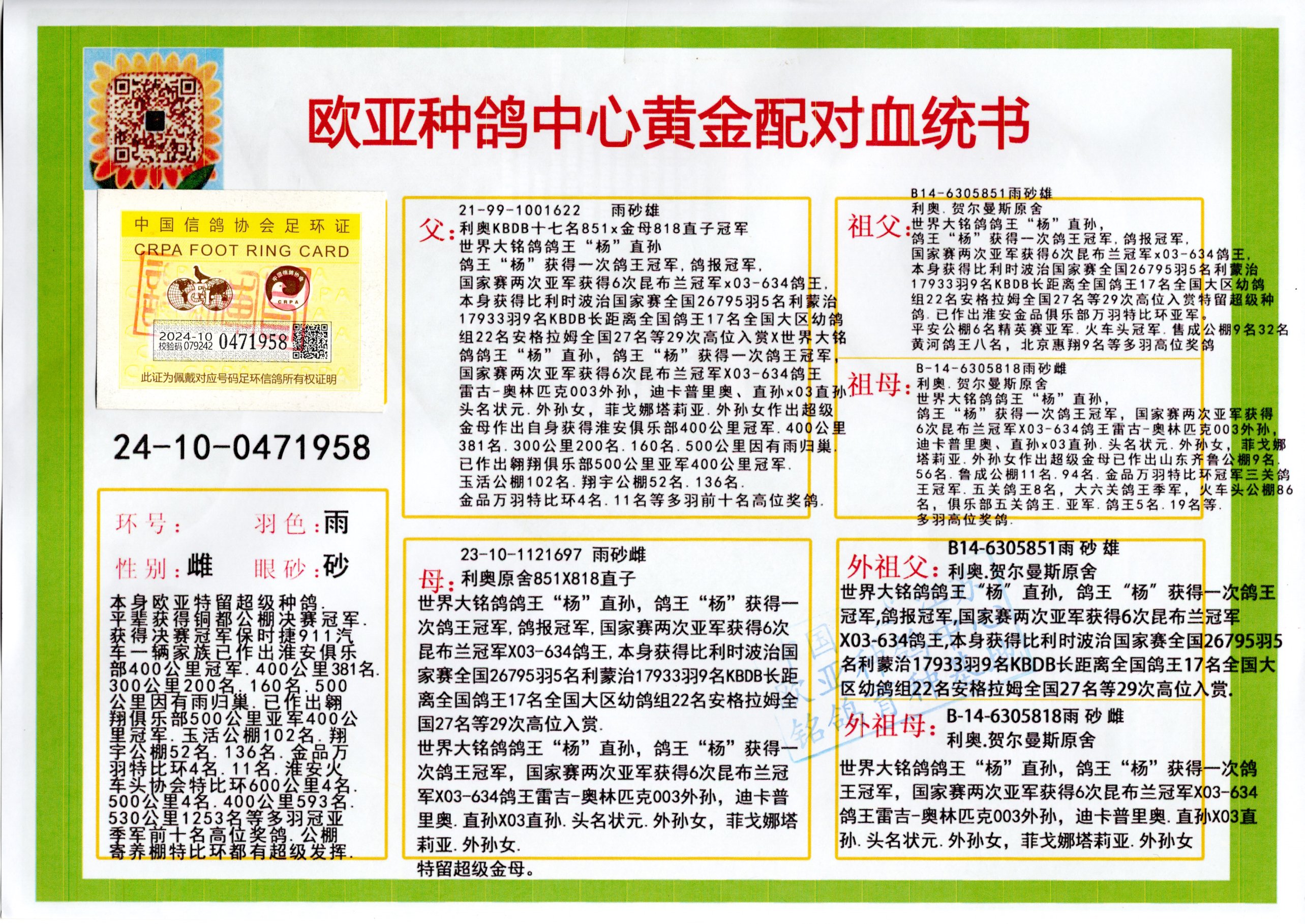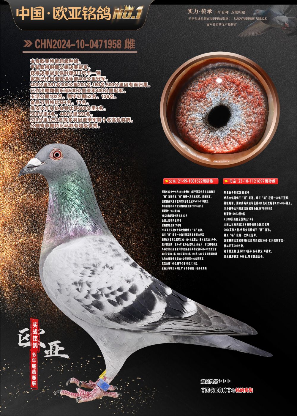 24年秋南京特比环欧亚荣获大团体冠军.小团体冠军551公里大特比13名.14名.16名.19名.20名.21名.24名.26名.27名.28名.42名.52名.54名.57名.65名.66名.68名.70名.71名.72名.74名.76名.80名.82名.83名.84名.85名.86名.90名.92名.110名.116名.121名.122名.128名.131名.158名.161名.164名.165名.166名.172名.174名.177名.182名.195名.196名.201名.205名.208名.210名.216名.253名.269名.275名.276名.294名.296名.299名,,24年秋云南天南铜都公棚决赛415名.天南铜都小棚决赛409名.云南玉活公棚决赛102名.490名.团体32名上笼二羽进二羽,天南铜都大棚506公里决赛445名。热烈祝贺河北省巨鹿县李兰生老师用欧亚泰山号血系连续十一年夺冠军,河北省国家赛冠军.全国季军等多次前十名高位,扬州王军王总用欧亚利奥24年春季获山东翔宇公棚决赛33名盖比53名。南京刘正龙刘总用欧亚盖比获得24年秋山东潍坊国际公棚决赛42名.精英赛30名.三关鸽王71名.决赛86名.加站赛16名.南京市特比环A组鸽王9名.B组鸽王5名.6名.C组鸽王5名.精英赛冠军4名.技能赛A组冠军4名.5名.秦淮区特比环荣获15名.46名.48名.87名。四川西昌徐亮徐总用欧亚利奥获得凉山州聚友决赛177名.第二关亚军双关鸽王19名.三关鸽王105名.云南豪庭公棚决赛603名。热烈祝贺24年四川重庆翔园鸽舍用欧亚泰山号荣获春季400公里冠军.秋季500公里冠军,河北王总用詹森X利奥获得千羽千翔公棚400公里冠军,广东蔡楷焕荣获24年秋爱好者 赛鸽俱乐部三关鸽王季军.一关420公里99名.二关450公里11名.三关520公里32名.单关季军.7名.12名,江西李卫兴荣获贵州红枫公棚8名.共翔俱乐部寄养棚四关综合鸽王30名.一关400公里78名.二关500公里55名.三关520公里37名.四关500公里57名.同父母获公棚18名.雷鸣获得武汉黄浦育翔中心冠军,四川陈文获得四川明鸿俱乐部300公里梦幻2名.3名.4名.9名.10名.13名.14名.15名.31名.34名.40名.41名.42名.43名.69名.71名.72名.73名.74名.94名.95名.97名.98名.99名.419公里决赛荣获总冠军7名.总共归巢9羽,四川徐亮获豪庭决赛603名,山西郑勇获得山西泰鑫公棚决赛255名詹森红狐,热烈祝贺马总获得开尔(飞跃队)决赛9名获奖金1310000万元.第一关52名,天津津福资赛180公里96名.获奖金429543万元,欧亚支持全国鸽友24年秋多人报喜 祝大家取得更好成绩,给欧亚报喜鸽友欧亚决定给每人赠送一羽超级种鸽。欧亚俱乐部特比环多关鸽王成绩:15年秋淮安特比环黑色星期一全会上笼9700多羽,当天无鸽归巢,第二天全会归巢357羽,本舍归巢158羽.前十名八羽.前一百名归巢57羽,16年春季获五关鸽王总冠军,总亚军四名.六名.七名.九名.十名.晶艺俱乐部520公里冠亚季军5名.6名.7名.9名.11名等,火车头冠军.季军6名.8名.9名.10名,16年秋晶艺俱乐部特比环520公里亚军.季军4名.6名.7名.9名,15年春南京白下特比环冠军.亚军.季军6名.7名.8名.9名.10名.指定鸽A B组获得冠军.亚军.季军4名.5名.,17年淮安特比环亚军.4名.5名.7名.8名.10名.六关鸽王总冠军.4名.6名.9名.10名,寄养棚宿迁刘总20羽特比环获冠军.季军.4名.7名.8名.9名等。18年荣获万羽特比环六关鸽王总冠军.总亚军.总季军.6名.8名.十名.单关四羽冠军.二羽亚军.四羽季军.前十名27羽。19年秋万羽特比环六关鸽王总亚军.总季军.5名.8名等,单关二羽冠军.三羽亚军.一羽季军前十名31羽。20年秋淮安市鸽会四关特比环大赛风雨无阻鸽王亚军.鸽王六名,金品俱乐部万羽特比环六关鸽王总冠军,总亚军.四名.五名.六名.七名.八名.十名.前二百名鸽王35羽,单关冠亚季军前十名四十多羽,火车头五关鸽王季军.六名.八名.前二百名鸽王十七羽。20年春荣获淮安五区一市四关鸽王总冠军.亚军.四名.八名.九名。21年秋荣获金品万羽特比环大赛六关鸽王总亚军.总季军.四名.七名.九名.十名.单关冠亚军季军前十名三十多羽。火车头协会鸽王六名.七名.十名.单关前十名十七羽。22年秋荣获鸽王总冠军.总亚军.5名.7名.8名.9名.11名.单关冠亚季军前十名三十多羽,第一关单关前二百名四十多羽,第二关前二百名三十多羽,第三关前二百名四十多羽,第四关前二百名四十多羽,第五关前一百名53羽。23年秋荣获鸽王季军.五名.八名.十名.13名.17名.20名.27名等多羽鸽王.单关前十名二十多羽。公棚.寄养棚部分成绩:16年秋宁夏黄河公棚总冠军电脑戈马力指定通炮冠军,17年送八羽参赛获得鸽王八名进奖四名,支持韩总荣获八名。支持鸽友荣获宁夏中卫公棚决赛总冠军.精英赛冠军,支持18年宁夏黄河公棚决赛冠军詹森X泰山。安徽鼎博寄养棚院内外四关鸽王总冠军.鸽王十七名.三十七名同窝,鸽王39名.42名.58名.67名。18年山东公棚预赛冠军.决赛65名.送八羽进奖五羽.指定获奔驰汽车一辆。支持鸽友获得云南蓝云公棚冠军.盖比X佛卡门。支持鸽友荣获云南银集公棚决赛冠军 詹森427X520血系 速度赛6700羽冠军。17年荣获金马俱乐部寄养棚四关鸽王总冠军.季军.六名.八名.第一关冠军.亚军.季军四名.七名.十一名.金牌教练奖。支持鸽友18年北京费翔公棚预赛九名电脑X桑杰士,支持鸽友荣获陕西威力公棚决赛11名.内蒙古临河寄养棚四关鸽王六名.詹森配泰山,支持河北王总用欧亚詹森427配胡本喜获20年秋开尔青年棚季军。云南东荣公棚16年预赛冠军.决赛77名.17年决赛12名.詹森红狐X泰山,17年平安公棚决赛4名 詹森427。欧亚获得21年金母寄养棚第一关四名.第二关5名.第三关5名.6名.7名.10名.三关鸽王总冠军,四关鸽王14名.十羽鸽王。支持河