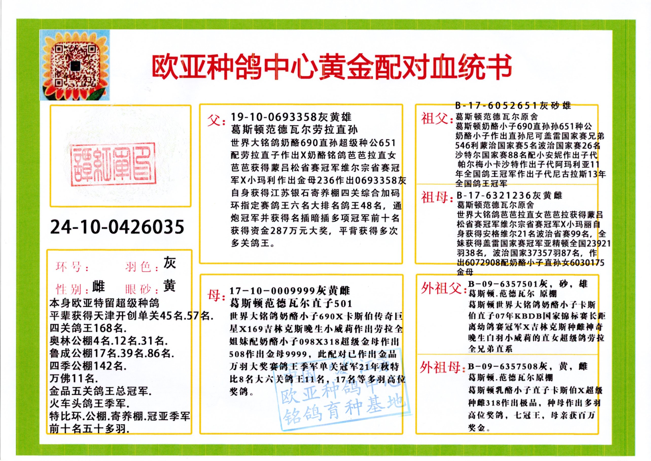 24年秋南京特比环欧亚荣获大团体冠军.小团体冠军551公里大特比13名.14名.16名.19名.20名.21名.24名.26名.27名.28名.42名.52名.54名.57名.65名.66名.68名.70名.71名.72名.74名.76名.80名.82名.83名.84名.85名.86名.90名.92名.110名.116名.121名.122名.128名.131名.158名.161名.164名.165名.166名.172名.174名.177名.182名.195名.196名.201名.205名.208名.210名.216名.253名.269名.275名.276名.294名.296名.299名,,24年秋云南天南铜都公棚决赛415名.天南铜都小棚决赛409名.云南玉活公棚决赛102名.490名.团体32名上笼二羽进二羽,天南铜都大棚506公里决赛445名。热烈祝贺河北省巨鹿县李兰生老师用欧亚泰山号血系连续十一年夺冠军,河北省国家赛冠军.全国季军等多次前十名高位,扬州王军王总用欧亚利奥24年春季获山东翔宇公棚决赛33名盖比53名。南京刘正龙刘总用欧亚盖比获得24年秋山东潍坊国际公棚决赛42名.精英赛30名.三关鸽王71名.决赛86名.加站赛16名.南京市特比环A组鸽王9名.B组鸽王5名.6名.C组鸽王5名.精英赛冠军4名.技能赛A组冠军4名.5名.秦淮区特比环荣获15名.46名.48名.87名。四川西昌徐亮徐总用欧亚利奥获得凉山州聚友决赛177名.第二关亚军双关鸽王19名.三关鸽王105名.云南豪庭公棚决赛603名。热烈祝贺24年四川重庆翔园鸽舍用欧亚泰山号荣获春季400公里冠军.秋季500公里冠军,河北王总用詹森X利奥获得千羽千翔公棚400公里冠军,广东蔡楷焕荣获24年秋爱好者 赛鸽俱乐部三关鸽王季军.一关420公里99名.二关450公里11名.三关520公里32名.单关季军.7名.12名,江西李卫兴荣获贵州红枫公棚8名.共翔俱乐部寄养棚四关综合鸽王30名.一关400公里78名.二关500公里55名.三关520公里37名.四关500公里57名.同父母获公棚18名.雷鸣获得武汉黄浦育翔中心冠军,四川陈文获得四川明鸿俱乐部300公里梦幻2名.3名.4名.9名.10名.13名.14名.15名.31名.34名.40名.41名.42名.43名.69名.71名.72名.73名.74名.94名.95名.97名.98名.99名.419公里决赛荣获总冠军7名.总共归巢9羽,四川徐亮获豪庭决赛603名,山西郑勇获得山西泰鑫公棚决赛255名詹森红狐,热烈祝贺马总获得开尔(飞跃队)决赛9名获奖金1310000万元.第一关52名,天津津福资赛180公里96名.获奖金429543万元,欧亚支持全国鸽友24年秋多人报喜 祝大家取得更好成绩,给欧亚报喜鸽友欧亚决定给每人赠送一羽超级种鸽。欧亚俱乐部特比环多关鸽王成绩:15年秋淮安特比环黑色星期一全会上笼9700多羽,当天无鸽归巢,第二天全会归巢357羽,本舍归巢158羽.前十名八羽.前一百名归巢57羽,16年春季获五关鸽王总冠军,总亚军四名.六名.七名.九名.十名.晶艺俱乐部520公里冠亚季军5名.6名.7名.9名.11名等,火车头冠军.季军6名.8名.9名.10名,16年秋晶艺俱乐部特比环520公里亚军.季军4名.6名.7名.9名,15年春南京白下特比环冠军.亚军.季军6名.7名.8名.9名.10名.指定鸽A B组获得冠军.亚军.季军4名.5名.,17年淮安特比环亚军.4名.5名.7名.8名.10名.六关鸽王总冠军.4名.6名.9名.10名,寄养棚宿迁刘总20羽特比环获冠军.季军.4名.7名.8名.9名等。18年荣获万羽特比环六关鸽王总冠军.总亚军.总季军.6名.8名.十名.单关四羽冠军.二羽亚军.四羽季军.前十名27羽。19年秋万羽特比环六关鸽王总亚军.总季军.5名.8名等,单关二羽冠军.三羽亚军.一羽季军前十名31羽。20年秋淮安市鸽会四关特比环大赛风雨无阻鸽王亚军.鸽王六名,金品俱乐部万羽特比环六关鸽王总冠军,总亚军.四名.五名.六名.七名.八名.十名.前二百名鸽王35羽,单关冠亚季军前十名四十多羽,火车头五关鸽王季军.六名.八名.前二百名鸽王十七羽。20年春荣获淮安五区一市四关鸽王总冠军.亚军.四名.八名.九名。21年秋荣获金品万羽特比环大赛六关鸽王总亚军.总季军.四名.七名.九名.十名.单关冠亚军季军前十名三十多羽。火车头协会鸽王六名.七名.十名.单关前十名十七羽。22年秋荣获鸽王总冠军.总亚军.5名.7名.8名.9名.11名.单关冠亚季军前十名三十多羽,第一关单关前二百名四十多羽,第二关前二百名三十多羽,第三关前二百名四十多羽,第四关前二百名四十多羽,第五关前一百名53羽。23年秋荣获鸽王季军.五名.八名.十名.13名.17名.20名.27名等多羽鸽王.单关前十名二十多羽。公棚.寄养棚部分成绩:16年秋宁夏黄河公棚总冠军电脑戈马力指定通炮冠军,17年送八羽参赛获得鸽王八名进奖四名,支持韩总荣获八名。支持鸽友荣获宁夏中卫公棚决赛总冠军.精英赛冠军,支持18年宁夏黄河公棚决赛冠军詹森X泰山。安徽鼎博寄养棚院内外四关鸽王总冠军.鸽王十七名.三十七名同窝,鸽王39名.42名.58名.67名。18年山东公棚预赛冠军.决赛65名.送八羽进奖五羽.指定获奔驰汽车一辆。支持鸽友获得云南蓝云公棚冠军.盖比X佛卡门。支持鸽友荣获云南银集公棚决赛冠军 詹森427X520血系 速度赛6700羽冠军。17年荣获金马俱乐部寄养棚四关鸽王总冠军.季军.六名.八名.第一关冠军.亚军.季军四名.七名.十一名.金牌教练奖。支持鸽友18年北京费翔公棚预赛九名电脑X桑杰士,支持鸽友荣获陕西威力公棚决赛11名.内蒙古临河寄养棚四关鸽王六名.詹森配泰山,支持河北王总用欧亚詹森427配胡本喜获20年秋开尔青年棚季军。云南东荣公棚16年预赛冠军.决赛77名.17年决赛12名.詹森红狐X泰山,17年平安公棚决赛4名 詹森427。欧亚获得21年金母寄养棚第一关四名.第二关5名.第三关5名.6名.7名.10名.三关鸽王总冠军,四关鸽王14名.十羽鸽王。支持河