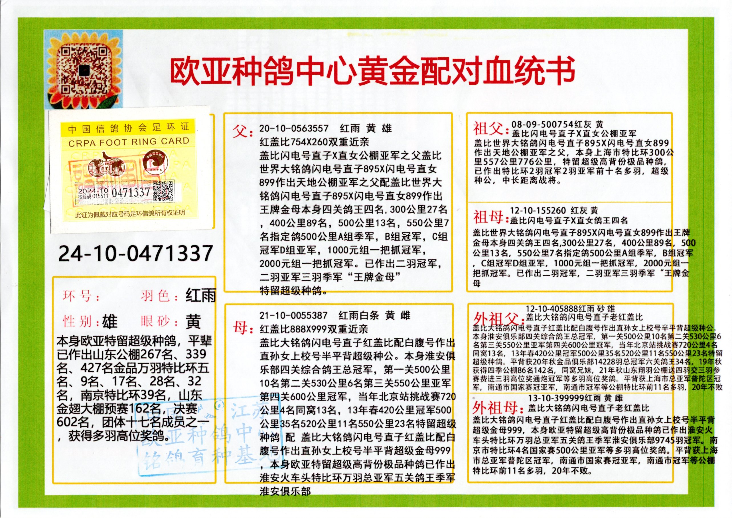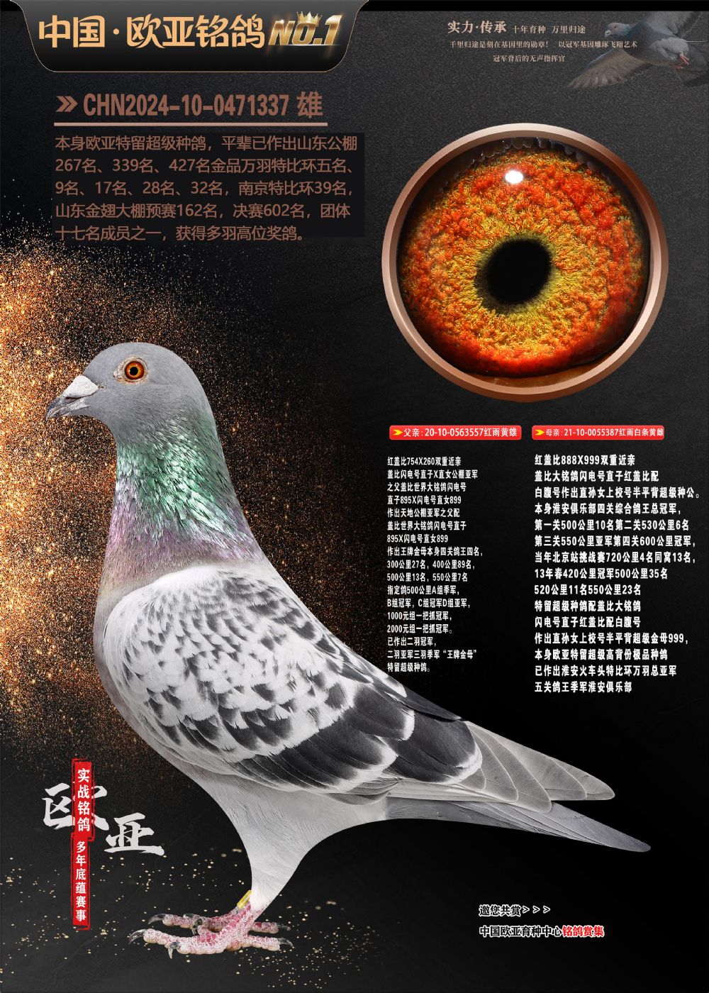 24年秋南京特比环欧亚荣获大团体冠军.小团体冠军551公里大特比13名.14名.16名.19名.20名.21名.24名.26名.27名.28名.42名.52名.54名.57名.65名.66名.68名.70名.71名.72名.74名.76名.80名.82名.83名.84名.85名.86名.90名.92名.110名.116名.121名.122名.128名.131名.158名.161名.164名.165名.166名.172名.174名.177名.182名.195名.196名.201名.205名.208名.210名.216名.253名.269名.275名.276名.294名.296名.299名,,24年秋云南天南铜都公棚决赛415名.天南铜都小棚决赛409名.云南玉活公棚决赛102名.490名.团体32名上笼二羽进二羽,天南铜都大棚506公里决赛445名。热烈祝贺河北省巨鹿县李兰生老师用欧亚泰山号血系连续十一年夺冠军,河北省国家赛冠军.全国季军等多次前十名高位,扬州王军王总用欧亚利奥24年春季获山东翔宇公棚决赛33名盖比53名。南京刘正龙刘总用欧亚盖比获得24年秋山东潍坊国际公棚决赛42名.精英赛30名.三关鸽王71名.决赛86名.加站赛16名.南京市特比环A组鸽王9名.B组鸽王5名.6名.C组鸽王5名.精英赛冠军4名.技能赛A组冠军4名.5名.秦淮区特比环荣获15名.46名.48名.87名。四川西昌徐亮徐总用欧亚利奥获得凉山州聚友决赛177名.第二关亚军双关鸽王19名.三关鸽王105名.云南豪庭公棚决赛603名。热烈祝贺24年四川重庆翔园鸽舍用欧亚泰山号荣获春季400公里冠军.秋季500公里冠军,河北王总用詹森X利奥获得千羽千翔公棚400公里冠军,广东蔡楷焕荣获24年秋爱好者 赛鸽俱乐部三关鸽王季军.一关420公里99名.二关450公里11名.三关520公里32名.单关季军.7名.12名,江西李卫兴荣获贵州红枫公棚8名.共翔俱乐部寄养棚四关综合鸽王30名.一关400公里78名.二关500公里55名.三关520公里37名.四关500公里57名.同父母获公棚18名.雷鸣获得武汉黄浦育翔中心冠军,四川陈文获得四川明鸿俱乐部300公里梦幻2名.3名.4名.9名.10名.13名.14名.15名.31名.34名.40名.41名.42名.43名.69名.71名.72名.73名.74名.94名.95名.97名.98名.99名.419公里决赛荣获总冠军7名.总共归巢9羽,四川徐亮获豪庭决赛603名,山西郑勇获得山西泰鑫公棚决赛255名詹森红狐,热烈祝贺马总获得开尔(飞跃队)决赛9名获奖金1310000万元.第一关52名,天津津福资赛180公里96名.获奖金429543万元,欧亚支持全国鸽友24年秋多人报喜 祝大家取得更好成绩,给欧亚报喜鸽友欧亚决定给每人赠送一羽超级种鸽。欧亚俱乐部特比环多关鸽王成绩:15年秋淮安特比环黑色星期一全会上笼9700多羽,当天无鸽归巢,第二天全会归巢357羽,本舍归巢158羽.前十名八羽.前一百名归巢57羽,16年春季获五关鸽王总冠军,总亚军四名.六名.七名.九名.十名.晶艺俱乐部520公里冠亚季军5名.6名.7名.9名.11名等,火车头冠军.季军6名.8名.9名.10名,16年秋晶艺俱乐部特比环520公里亚军.季军4名.6名.7名.9名,15年春南京白下特比环冠军.亚军.季军6名.7名.8名.9名.10名.指定鸽A B组获得冠军.亚军.季军4名.5名.,17年淮安特比环亚军.4名.5名.7名.8名.10名.六关鸽王总冠军.4名.6名.9名.10名,寄养棚宿迁刘总20羽特比环获冠军.季军.4名.7名.8名.9名等。18年荣获万羽特比环六关鸽王总冠军.总亚军.总季军.6名.8名.十名.单关四羽冠军.二羽亚军.四羽季军.前十名27羽。19年秋万羽特比环六关鸽王总亚军.总季军.5名.8名等,单关二羽冠军.三羽亚军.一羽季军前十名31羽。20年秋淮安市鸽会四关特比环大赛风雨无阻鸽王亚军.鸽王六名,金品俱乐部万羽特比环六关鸽王总冠军,总亚军.四名.五名.六名.七名.八名.十名.前二百名鸽王35羽,单关冠亚季军前十名四十多羽,火车头五关鸽王季军.六名.八名.前二百名鸽王十七羽。20年春荣获淮安五区一市四关鸽王总冠军.亚军.四名.八名.九名。21年秋荣获金品万羽特比环大赛六关鸽王总亚军.总季军.四名.七名.九名.十名.单关冠亚军季军前十名三十多羽。火车头协会鸽王六名.七名.十名.单关前十名十七羽。22年秋荣获鸽王总冠军.总亚军.5名.7名.8名.9名.11名.单关冠亚季军前十名三十多羽,第一关单关前二百名四十多羽,第二关前二百名三十多羽,第三关前二百名四十多羽,第四关前二百名四十多羽,第五关前一百名53羽。23年秋荣获鸽王季军.五名.八名.十名.13名.17名.20名.27名等多羽鸽王.单关前十名二十多羽。公棚.寄养棚部分成绩:16年秋宁夏黄河公棚总冠军电脑戈马力指定通炮冠军,17年送八羽参赛获得鸽王八名进奖四名,支持韩总荣获八名。支持鸽友荣获宁夏中卫公棚决赛总冠军.精英赛冠军,支持18年宁夏黄河公棚决赛冠军詹森X泰山。安徽鼎博寄养棚院内外四关鸽王总冠军.鸽王十七名.三十七名同窝,鸽王39名.42名.58名.67名。18年山东公棚预赛冠军.决赛65名.送八羽进奖五羽.指定获奔驰汽车一辆。支持鸽友获得云南蓝云公棚冠军.盖比X佛卡门。支持鸽友荣获云南银集公棚决赛冠军 詹森427X520血系 速度赛6700羽冠军。17年荣获金马俱乐部寄养棚四关鸽王总冠军.季军.六名.八名.第一关冠军.亚军.季军四名.七名.十一名.金牌教练奖。支持鸽友18年北京费翔公棚预赛九名电脑X桑杰士,支持鸽友荣获陕西威力公棚决赛11名.内蒙古临河寄养棚四关鸽王六名.詹森配泰山,支持河北王总用欧亚詹森427配胡本喜获20年秋开尔青年棚季军。云南东荣公棚16年预赛冠军.决赛77名.17年决赛12名.詹森红狐X泰山,17年平安公棚决赛4名 詹森427。欧亚获得21年金母寄养棚第一关四名.第二关5名.第三关5名.6名.7名.10名.三关鸽王总冠军,四关鸽王14名.十羽鸽王。支持河