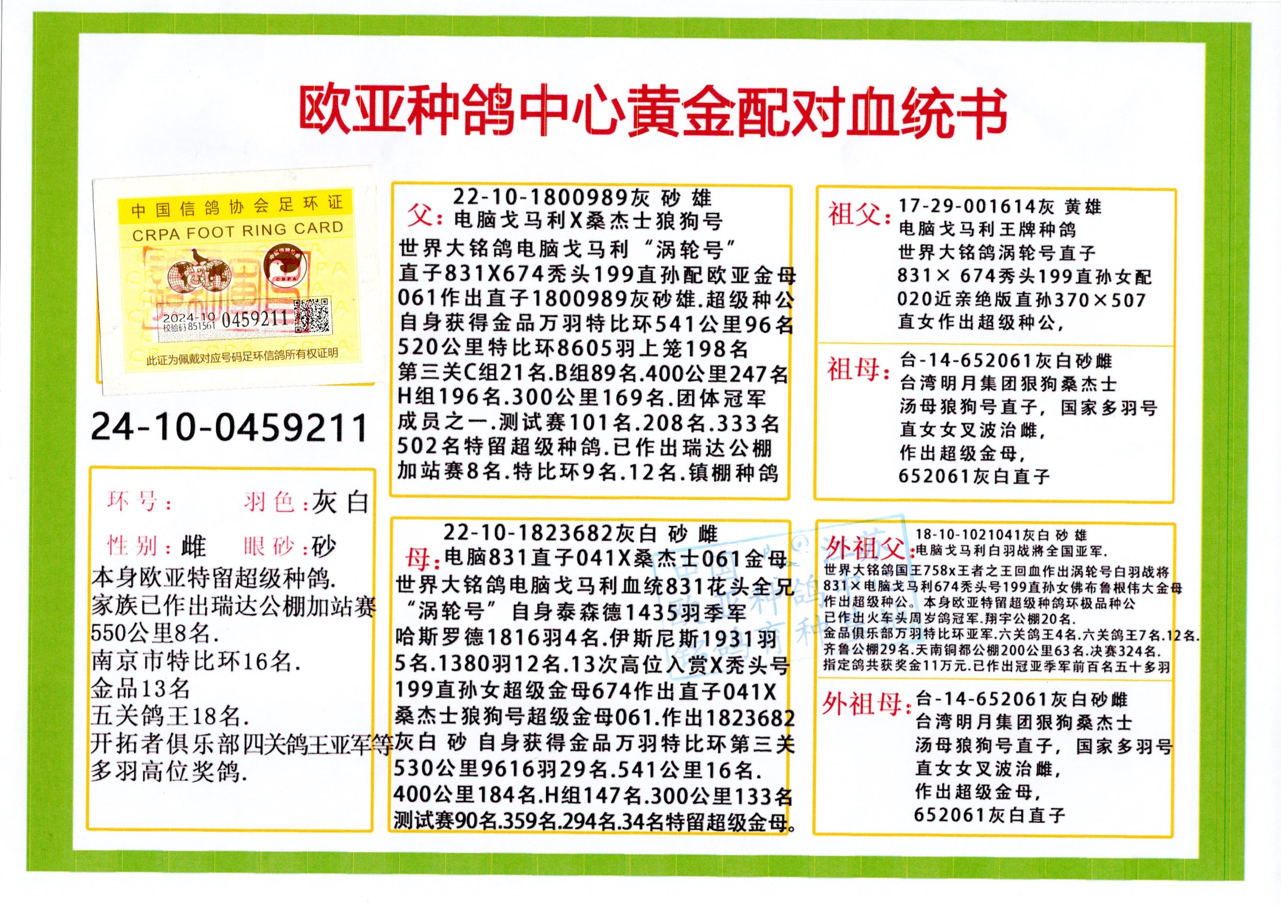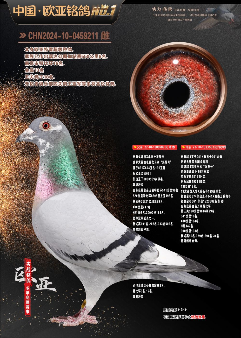 24年秋南京特比环欧亚荣获大团体冠军.小团体冠军551公里大特比13名.14名.16名.19名.20名.21名.24名.26名.27名.28名.42名.52名.54名.57名.65名.66名.68名.70名.71名.72名.74名.76名.80名.82名.83名.84名.85名.86名.90名.92名.110名.116名.121名.122名.128名.131名.158名.161名.164名.165名.166名.172名.174名.177名.182名.195名.196名.201名.205名.208名.210名.216名.253名.269名.275名.276名.294名.296名.299名,,24年秋云南天南铜都公棚决赛415名.天南铜都小棚决赛409名.云南玉活公棚决赛102名.490名.团体32名上笼二羽进二羽,天南铜都大棚506公里决赛445名。热烈祝贺河北省巨鹿县李兰生老师用欧亚泰山号血系连续十一年夺冠军,河北省国家赛冠军.全国季军等多次前十名高位,扬州王军王总用欧亚利奥24年春季获山东翔宇公棚决赛33名盖比53名。南京刘正龙刘总用欧亚盖比获得24年秋山东潍坊国际公棚决赛42名.精英赛30名.三关鸽王71名.决赛86名.加站赛16名.南京市特比环A组鸽王9名.B组鸽王5名.6名.C组鸽王5名.精英赛冠军4名.技能赛A组冠军4名.5名.秦淮区特比环荣获15名.46名.48名.87名。四川西昌徐亮徐总用欧亚利奥获得凉山州聚友决赛177名.第二关亚军双关鸽王19名.三关鸽王105名.云南豪庭公棚决赛603名。热烈祝贺24年四川重庆翔园鸽舍用欧亚泰山号荣获春季400公里冠军.秋季500公里冠军,河北王总用詹森X利奥获得千羽千翔公棚400公里冠军,广东蔡楷焕荣获24年秋爱好者 赛鸽俱乐部三关鸽王季军.一关420公里99名.二关450公里11名.三关520公里32名.单关季军.7名.12名,江西李卫兴荣获贵州红枫公棚8名.共翔俱乐部寄养棚四关综合鸽王30名.一关400公里78名.二关500公里55名.三关520公里37名.四关500公里57名.同父母获公棚18名.雷鸣获得武汉黄浦育翔中心冠军,四川陈文获得四川明鸿俱乐部300公里梦幻2名.3名.4名.9名.10名.13名.14名.15名.31名.34名.40名.41名.42名.43名.69名.71名.72名.73名.74名.94名.95名.97名.98名.99名.419公里决赛荣获总冠军7名.总共归巢9羽,四川徐亮获豪庭决赛603名,山西郑勇获得山西泰鑫公棚决赛255名詹森红狐,热烈祝贺马总获得开尔(飞跃队)决赛9名获奖金1310000万元.第一关52名,天津津福资赛180公里96名.获奖金429543万元,欧亚支持全国鸽友24年秋多人报喜 祝大家取得更好成绩,给欧亚报喜鸽友欧亚决定给每人赠送一羽超级种鸽。欧亚俱乐部特比环多关鸽王成绩:15年秋淮安特比环黑色星期一全会上笼9700多羽,当天无鸽归巢,第二天全会归巢357羽,本舍归巢158羽.前十名八羽.前一百名归巢57羽,16年春季获五关鸽王总冠军,总亚军四名.六名.七名.九名.十名.晶艺俱乐部520公里冠亚季军5名.6名.7名.9名.11名等,火车头冠军.季军6名.8名.9名.10名,16年秋晶艺俱乐部特比环520公里亚军.季军4名.6名.7名.9名,15年春南京白下特比环冠军.亚军.季军6名.7名.8名.9名.10名.指定鸽A B组获得冠军.亚军.季军4名.5名.,17年淮安特比环亚军.4名.5名.7名.8名.10名.六关鸽王总冠军.4名.6名.9名.10名,寄养棚宿迁刘总20羽特比环获冠军.季军.4名.7名.8名.9名等。18年荣获万羽特比环六关鸽王总冠军.总亚军.总季军.6名.8名.十名.单关四羽冠军.二羽亚军.四羽季军.前十名27羽。19年秋万羽特比环六关鸽王总亚军.总季军.5名.8名等,单关二羽冠军.三羽亚军.一羽季军前十名31羽。20年秋淮安市鸽会四关特比环大赛风雨无阻鸽王亚军.鸽王六名,金品俱乐部万羽特比环六关鸽王总冠军,总亚军.四名.五名.六名.七名.八名.十名.前二百名鸽王35羽,单关冠亚季军前十名四十多羽,火车头五关鸽王季军.六名.八名.前二百名鸽王十七羽。20年春荣获淮安五区一市四关鸽王总冠军.亚军.四名.八名.九名。21年秋荣获金品万羽特比环大赛六关鸽王总亚军.总季军.四名.七名.九名.十名.单关冠亚军季军前十名三十多羽。火车头协会鸽王六名.七名.十名.单关前十名十七羽。22年秋荣获鸽王总冠军.总亚军.5名.7名.8名.9名.11名.单关冠亚季军前十名三十多羽,第一关单关前二百名四十多羽,第二关前二百名三十多羽,第三关前二百名四十多羽,第四关前二百名四十多羽,第五关前一百名53羽。23年秋荣获鸽王季军.五名.八名.十名.13名.17名.20名.27名等多羽鸽王.单关前十名二十多羽。公棚.寄养棚部分成绩:16年秋宁夏黄河公棚总冠军电脑戈马力指定通炮冠军,17年送八羽参赛获得鸽王八名进奖四名,支持韩总荣获八名。支持鸽友荣获宁夏中卫公棚决赛总冠军.精英赛冠军,支持18年宁夏黄河公棚决赛冠军詹森X泰山。安徽鼎博寄养棚院内外四关鸽王总冠军.鸽王十七名.三十七名同窝,鸽王39名.42名.58名.67名。18年山东公棚预赛冠军.决赛65名.送八羽进奖五羽.指定获奔驰汽车一辆。支持鸽友获得云南蓝云公棚冠军.盖比X佛卡门。支持鸽友荣获云南银集公棚决赛冠军 詹森427X520血系 速度赛6700羽冠军。17年荣获金马俱乐部寄养棚四关鸽王总冠军.季军.六名.八名.第一关冠军.亚军.季军四名.七名.十一名.金牌教练奖。支持鸽友18年北京费翔公棚预赛九名电脑X桑杰士,支持鸽友荣获陕西威力公棚决赛11名.内蒙古临河寄养棚四关鸽王六名.詹森配泰山,支持河北王总用欧亚詹森427配胡本喜获20年秋开尔青年棚季军。云南东荣公棚16年预赛冠军.决赛77名.17年决赛12名.詹森红狐X泰山,17年平安公棚决赛4名 詹森427。欧亚获得21年金母寄养棚第一关四名.第二关5名.第三关5名.6名.7名.10名.三关鸽王总冠军,四关鸽王14名.十羽鸽王。支持河
