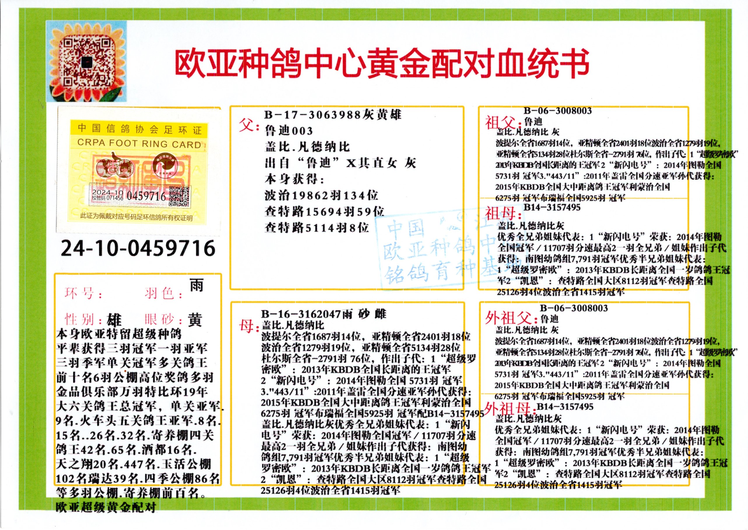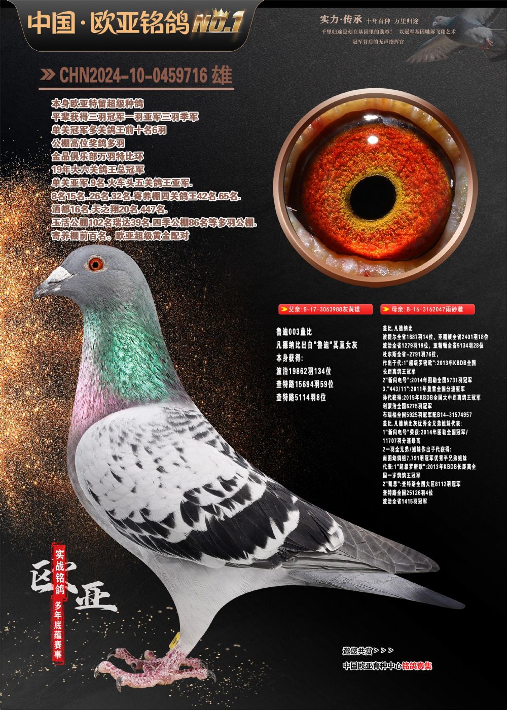 24年秋南京特比环欧亚荣获大团体冠军.小团体冠军551公里大特比13名.14名.16名.19名.20名.21名.24名.26名.27名.28名.42名.52名.54名.57名.65名.66名.68名.70名.71名.72名.74名.76名.80名.82名.83名.84名.85名.86名.90名.92名.110名.116名.121名.122名.128名.131名.158名.161名.164名.165名.166名.172名.174名.177名.182名.195名.196名.201名.205名.208名.210名.216名.253名.269名.275名.276名.294名.296名.299名,,24年秋云南天南铜都公棚决赛415名.天南铜都小棚决赛409名.云南玉活公棚决赛102名.490名.团体32名上笼二羽进二羽,天南铜都大棚506公里决赛445名。热烈祝贺河北省巨鹿县李兰生老师用欧亚泰山号血系连续十一年夺冠军,河北省国家赛冠军.全国季军等多次前十名高位,扬州王军王总用欧亚利奥24年春季获山东翔宇公棚决赛33名盖比53名。南京刘正龙刘总用欧亚盖比获得24年秋山东潍坊国际公棚决赛42名.精英赛30名.三关鸽王71名.决赛86名.加站赛16名.南京市特比环A组鸽王9名.B组鸽王5名.6名.C组鸽王5名.精英赛冠军4名.技能赛A组冠军4名.5名.秦淮区特比环荣获15名.46名.48名.87名。四川西昌徐亮徐总用欧亚利奥获得凉山州聚友决赛177名.第二关亚军双关鸽王19名.三关鸽王105名.云南豪庭公棚决赛603名。热烈祝贺24年四川重庆翔园鸽舍用欧亚泰山号荣获春季400公里冠军.秋季500公里冠军,河北王总用詹森X利奥获得千羽千翔公棚400公里冠军,广东蔡楷焕荣获24年秋爱好者 赛鸽俱乐部三关鸽王季军.一关420公里99名.二关450公里11名.三关520公里32名.单关季军.7名.12名,江西李卫兴荣获贵州红枫公棚8名.共翔俱乐部寄养棚四关综合鸽王30名.一关400公里78名.二关500公里55名.三关520公里37名.四关500公里57名.同父母获公棚18名.雷鸣获得武汉黄浦育翔中心冠军,四川陈文获得四川明鸿俱乐部300公里梦幻2名.3名.4名.9名.10名.13名.14名.15名.31名.34名.40名.41名.42名.43名.69名.71名.72名.73名.74名.94名.95名.97名.98名.99名.419公里决赛荣获总冠军7名.总共归巢9羽,四川徐亮获豪庭决赛603名,山西郑勇获得山西泰鑫公棚决赛255名詹森红狐,热烈祝贺马总获得开尔(飞跃队)决赛9名获奖金1310000万元.第一关52名,天津津福资赛180公里96名.获奖金429543万元,欧亚支持全国鸽友24年秋多人报喜 祝大家取得更好成绩,给欧亚报喜鸽友欧亚决定给每人赠送一羽超级种鸽。欧亚俱乐部特比环多关鸽王成绩:15年秋淮安特比环黑色星期一全会上笼9700多羽,当天无鸽归巢,第二天全会归巢357羽,本舍归巢158羽.前十名八羽.前一百名归巢57羽,16年春季获五关鸽王总冠军,总亚军四名.六名.七名.九名.十名.晶艺俱乐部520公里冠亚季军5名.6名.7名.9名.11名等,火车头冠军.季军6名.8名.9名.10名,16年秋晶艺俱乐部特比环520公里亚军.季军4名.6名.7名.9名,15年春南京白下特比环冠军.亚军.季军6名.7名.8名.9名.10名.指定鸽A B组获得冠军.亚军.季军4名.5名.,17年淮安特比环亚军.4名.5名.7名.8名.10名.六关鸽王总冠军.4名.6名.9名.10名,寄养棚宿迁刘总20羽特比环获冠军.季军.4名.7名.8名.9名等。18年荣获万羽特比环六关鸽王总冠军.总亚军.总季军.6名.8名.十名.单关四羽冠军.二羽亚军.四羽季军.前十名27羽。19年秋万羽特比环六关鸽王总亚军.总季军.5名.8名等,单关二羽冠军.三羽亚军.一羽季军前十名31羽。20年秋淮安市鸽会四关特比环大赛风雨无阻鸽王亚军.鸽王六名,金品俱乐部万羽特比环六关鸽王总冠军,总亚军.四名.五名.六名.七名.八名.十名.前二百名鸽王35羽,单关冠亚季军前十名四十多羽,火车头五关鸽王季军.六名.八名.前二百名鸽王十七羽。20年春荣获淮安五区一市四关鸽王总冠军.亚军.四名.八名.九名。21年秋荣获金品万羽特比环大赛六关鸽王总亚军.总季军.四名.七名.九名.十名.单关冠亚军季军前十名三十多羽。火车头协会鸽王六名.七名.十名.单关前十名十七羽。22年秋荣获鸽王总冠军.总亚军.5名.7名.8名.9名.11名.单关冠亚季军前十名三十多羽,第一关单关前二百名四十多羽,第二关前二百名三十多羽,第三关前二百名四十多羽,第四关前二百名四十多羽,第五关前一百名53羽。23年秋荣获鸽王季军.五名.八名.十名.13名.17名.20名.27名等多羽鸽王.单关前十名二十多羽。公棚.寄养棚部分成绩:16年秋宁夏黄河公棚总冠军电脑戈马力指定通炮冠军,17年送八羽参赛获得鸽王八名进奖四名,支持韩总荣获八名。支持鸽友荣获宁夏中卫公棚决赛总冠军.精英赛冠军,支持18年宁夏黄河公棚决赛冠军詹森X泰山。安徽鼎博寄养棚院内外四关鸽王总冠军.鸽王十七名.三十七名同窝,鸽王39名.42名.58名.67名。18年山东公棚预赛冠军.决赛65名.送八羽进奖五羽.指定获奔驰汽车一辆。支持鸽友获得云南蓝云公棚冠军.盖比X佛卡门。支持鸽友荣获云南银集公棚决赛冠军 詹森427X520血系 速度赛6700羽冠军。17年荣获金马俱乐部寄养棚四关鸽王总冠军.季军.六名.八名.第一关冠军.亚军.季军四名.七名.十一名.金牌教练奖。支持鸽友18年北京费翔公棚预赛九名电脑X桑杰士,支持鸽友荣获陕西威力公棚决赛11名.内蒙古临河寄养棚四关鸽王六名.詹森配泰山,支持河北王总用欧亚詹森427配胡本喜获20年秋开尔青年棚季军。云南东荣公棚16年预赛冠军.决赛77名.17年决赛12名.詹森红狐X泰山,17年平安公棚决赛4名 詹森427。欧亚获得21年金母寄养棚第一关四名.第二关5名.第三关5名.6名.7名.10名.三关鸽王总冠军,四关鸽王14名.十羽鸽王。支持河