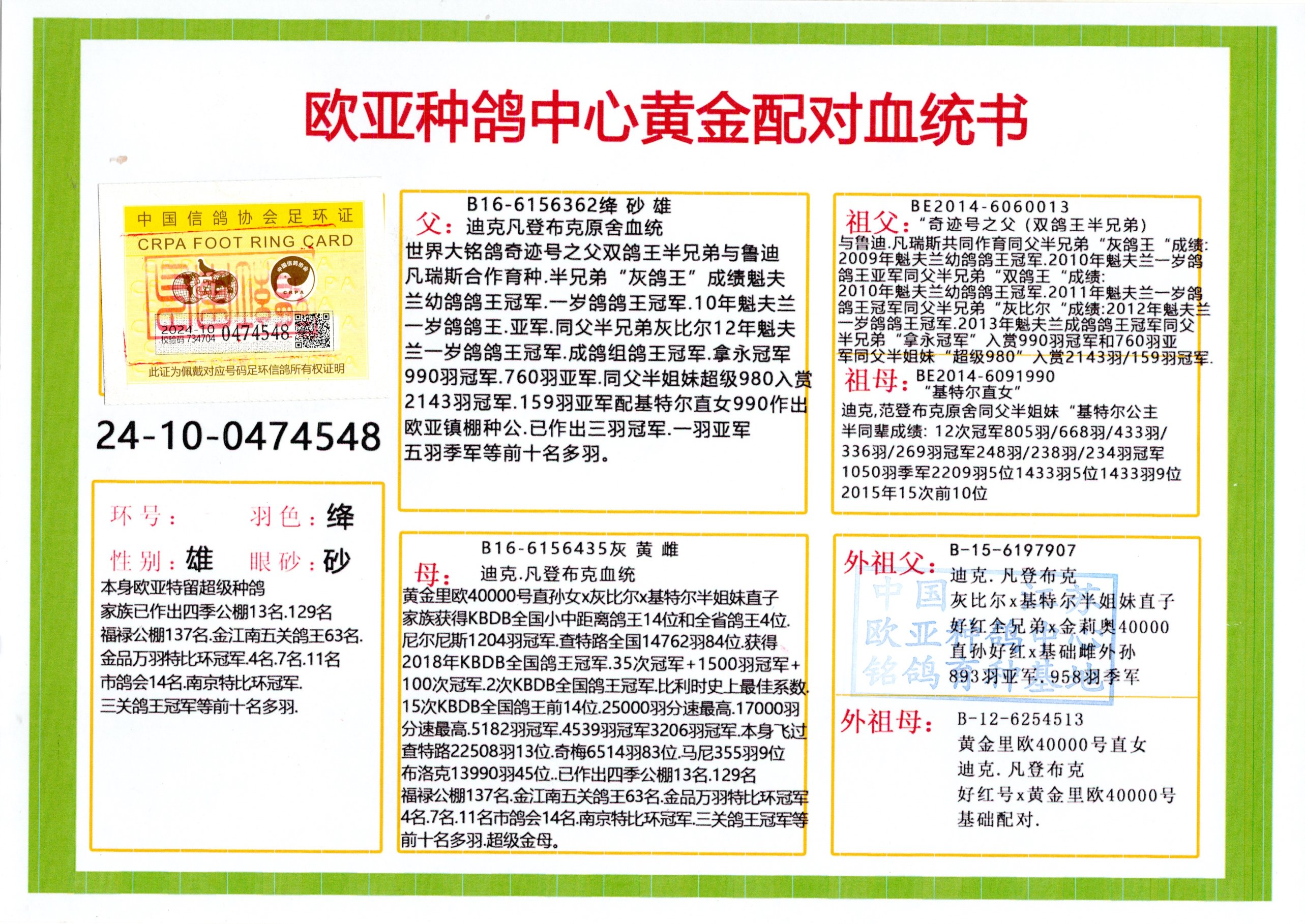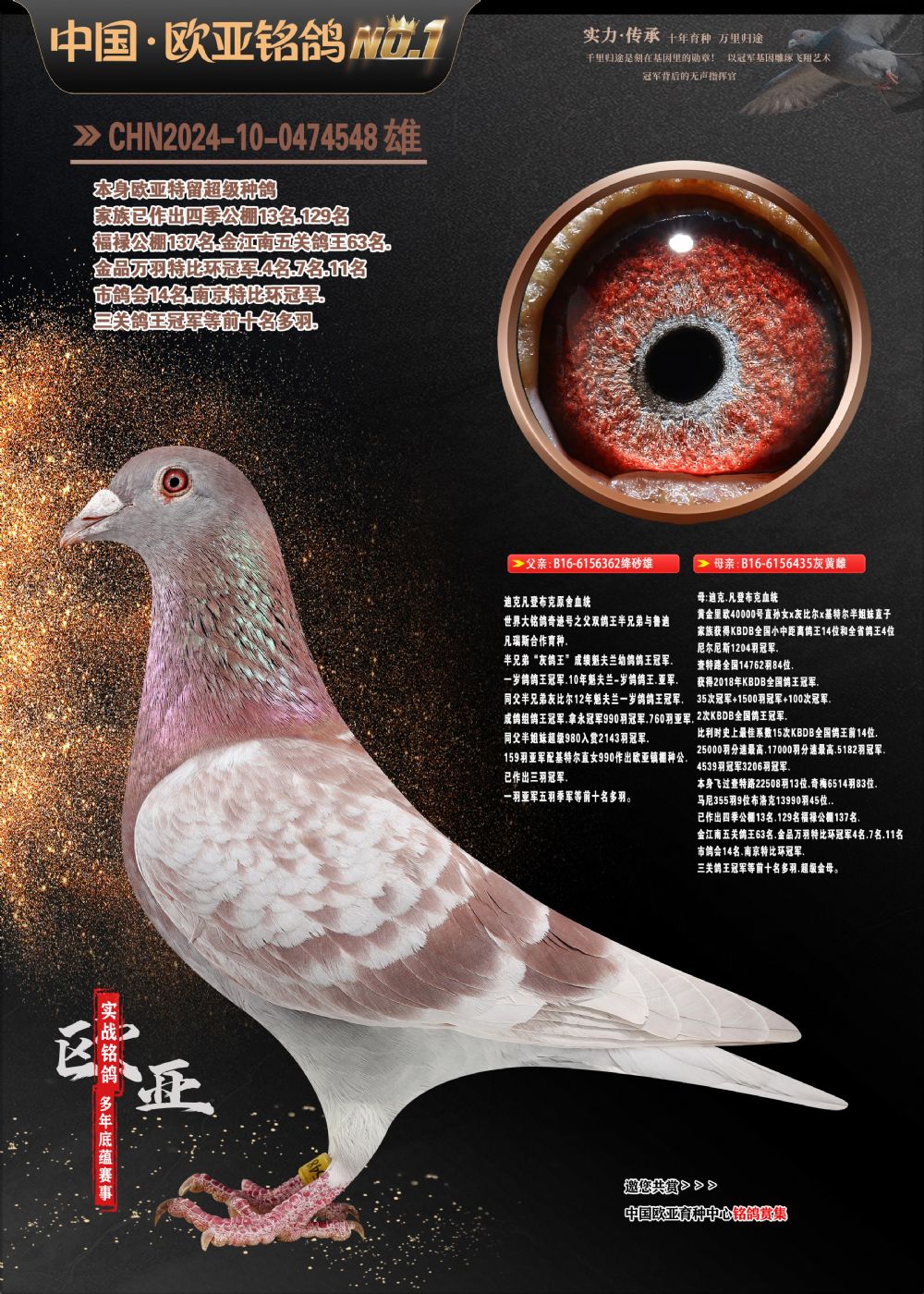 24年秋南京特比环欧亚荣获大团体冠军.小团体冠军551公里大特比13名.14名.16名.19名.20名.21名.24名.26名.27名.28名.42名.52名.54名.57名.65名.66名.68名.70名.71名.72名.74名.76名.80名.82名.83名.84名.85名.86名.90名.92名.110名.116名.121名.122名.128名.131名.158名.161名.164名.165名.166名.172名.174名.177名.182名.195名.196名.201名.205名.208名.210名.216名.253名.269名.275名.276名.294名.296名.299名,,24年秋云南天南铜都公棚决赛415名.天南铜都小棚决赛409名.云南玉活公棚决赛102名.490名.团体32名上笼二羽进二羽,天南铜都大棚506公里决赛445名。热烈祝贺河北省巨鹿县李兰生老师用欧亚泰山号血系连续十一年夺冠军,河北省国家赛冠军.全国季军等多次前十名高位,扬州王军王总用欧亚利奥24年春季获山东翔宇公棚决赛33名盖比53名。南京刘正龙刘总用欧亚盖比获得24年秋山东潍坊国际公棚决赛42名.精英赛30名.三关鸽王71名.决赛86名.加站赛16名.南京市特比环A组鸽王9名.B组鸽王5名.6名.C组鸽王5名.精英赛冠军4名.技能赛A组冠军4名.5名.秦淮区特比环荣获15名.46名.48名.87名。四川西昌徐亮徐总用欧亚利奥获得凉山州聚友决赛177名.第二关亚军双关鸽王19名.三关鸽王105名.云南豪庭公棚决赛603名。热烈祝贺24年四川重庆翔园鸽舍用欧亚泰山号荣获春季400公里冠军.秋季500公里冠军,河北王总用詹森X利奥获得千羽千翔公棚400公里冠军,广东蔡楷焕荣获24年秋爱好者 赛鸽俱乐部三关鸽王季军.一关420公里99名.二关450公里11名.三关520公里32名.单关季军.7名.12名,江西李卫兴荣获贵州红枫公棚8名.共翔俱乐部寄养棚四关综合鸽王30名.一关400公里78名.二关500公里55名.三关520公里37名.四关500公里57名.同父母获公棚18名.雷鸣获得武汉黄浦育翔中心冠军,四川陈文获得四川明鸿俱乐部300公里梦幻2名.3名.4名.9名.10名.13名.14名.15名.31名.34名.40名.41名.42名.43名.69名.71名.72名.73名.74名.94名.95名.97名.98名.99名.419公里决赛荣获总冠军7名.总共归巢9羽,四川徐亮获豪庭决赛603名,山西郑勇获得山西泰鑫公棚决赛255名詹森红狐,热烈祝贺马总获得开尔(飞跃队)决赛9名获奖金1310000万元.第一关52名,天津津福资赛180公里96名.获奖金429543万元,欧亚支持全国鸽友24年秋多人报喜 祝大家取得更好成绩,给欧亚报喜鸽友欧亚决定给每人赠送一羽超级种鸽。欧亚俱乐部特比环多关鸽王成绩:15年秋淮安特比环黑色星期一全会上笼9700多羽,当天无鸽归巢,第二天全会归巢357羽,本舍归巢158羽.前十名八羽.前一百名归巢57羽,16年春季获五关鸽王总冠军,总亚军四名.六名.七名.九名.十名.晶艺俱乐部520公里冠亚季军5名.6名.7名.9名.11名等,火车头冠军.季军6名.8名.9名.10名,16年秋晶艺俱乐部特比环520公里亚军.季军4名.6名.7名.9名,15年春南京白下特比环冠军.亚军.季军6名.7名.8名.9名.10名.指定鸽A B组获得冠军.亚军.季军4名.5名.,17年淮安特比环亚军.4名.5名.7名.8名.10名.六关鸽王总冠军.4名.6名.9名.10名,寄养棚宿迁刘总20羽特比环获冠军.季军.4名.7名.8名.9名等。18年荣获万羽特比环六关鸽王总冠军.总亚军.总季军.6名.8名.十名.单关四羽冠军.二羽亚军.四羽季军.前十名27羽。19年秋万羽特比环六关鸽王总亚军.总季军.5名.8名等,单关二羽冠军.三羽亚军.一羽季军前十名31羽。20年秋淮安市鸽会四关特比环大赛风雨无阻鸽王亚军.鸽王六名,金品俱乐部万羽特比环六关鸽王总冠军,总亚军.四名.五名.六名.七名.八名.十名.前二百名鸽王35羽,单关冠亚季军前十名四十多羽,火车头五关鸽王季军.六名.八名.前二百名鸽王十七羽。20年春荣获淮安五区一市四关鸽王总冠军.亚军.四名.八名.九名。21年秋荣获金品万羽特比环大赛六关鸽王总亚军.总季军.四名.七名.九名.十名.单关冠亚军季军前十名三十多羽。火车头协会鸽王六名.七名.十名.单关前十名十七羽。22年秋荣获鸽王总冠军.总亚军.5名.7名.8名.9名.11名.单关冠亚季军前十名三十多羽,第一关单关前二百名四十多羽,第二关前二百名三十多羽,第三关前二百名四十多羽,第四关前二百名四十多羽,第五关前一百名53羽。23年秋荣获鸽王季军.五名.八名.十名.13名.17名.20名.27名等多羽鸽王.单关前十名二十多羽。公棚.寄养棚部分成绩:16年秋宁夏黄河公棚总冠军电脑戈马力指定通炮冠军,17年送八羽参赛获得鸽王八名进奖四名,支持韩总荣获八名。支持鸽友荣获宁夏中卫公棚决赛总冠军.精英赛冠军,支持18年宁夏黄河公棚决赛冠军詹森X泰山。安徽鼎博寄养棚院内外四关鸽王总冠军.鸽王十七名.三十七名同窝,鸽王39名.42名.58名.67名。18年山东公棚预赛冠军.决赛65名.送八羽进奖五羽.指定获奔驰汽车一辆。支持鸽友获得云南蓝云公棚冠军.盖比X佛卡门。支持鸽友荣获云南银集公棚决赛冠军 詹森427X520血系 速度赛6700羽冠军。17年荣获金马俱乐部寄养棚四关鸽王总冠军.季军.六名.八名.第一关冠军.亚军.季军四名.七名.十一名.金牌教练奖。支持鸽友18年北京费翔公棚预赛九名电脑X桑杰士,支持鸽友荣获陕西威力公棚决赛11名.内蒙古临河寄养棚四关鸽王六名.詹森配泰山,支持河北王总用欧亚詹森427配胡本喜获20年秋开尔青年棚季军。云南东荣公棚16年预赛冠军.决赛77名.17年决赛12名.詹森红狐X泰山,17年平安公棚决赛4名 詹森427。欧亚获得21年金母寄养棚第一关四名.第二关5名.第三关5名.6名.7名.10名.三关鸽王总冠军,四关鸽王14名.十羽鸽王。支持河
