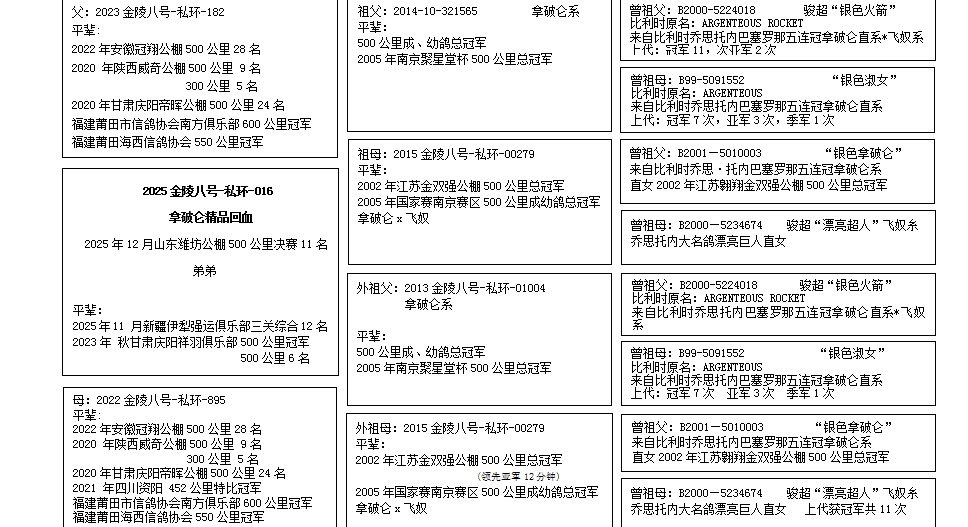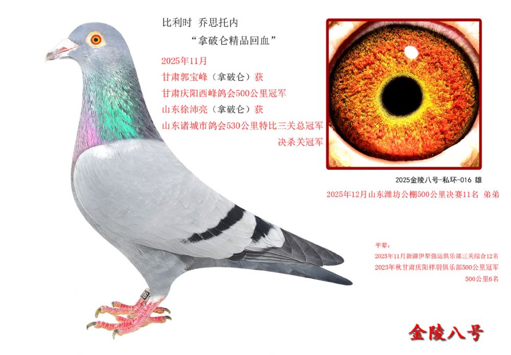 金陵八号2025年12月获山东潍坊国际公棚500公里决赛11名(拿破仑)