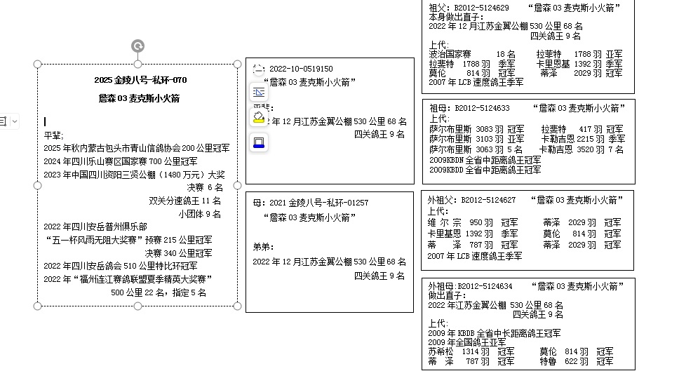 三关鸽王冠军,四关鸽王亚军,二关鸽王亚军,精英赛6名,500公里决赛9名,560公里加站赛3名,560公里排名赛6名(乔 花 飞奴)