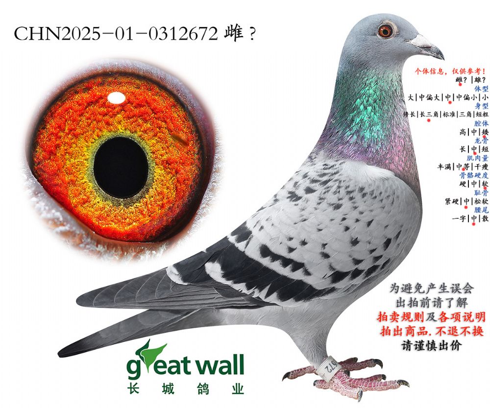 因拍卖鸽均是未做育过的种鸽或幼鸽,图内所标雌雄仅供参考,实际性别已实物为准。不做退换理由。