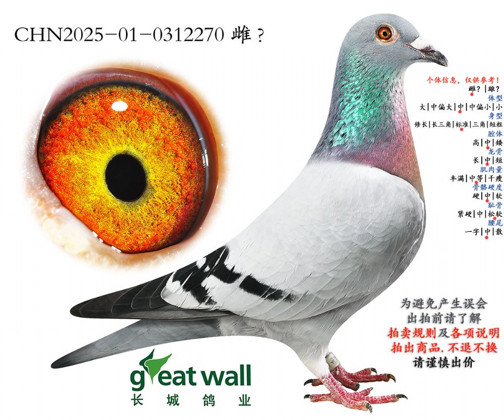 因拍卖鸽均是未做育过的种鸽或幼鸽,图内所标雌雄仅供参考,实际性别已实物为准。不做退换理由。