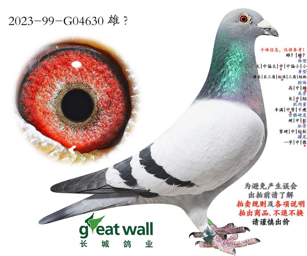 因拍卖鸽均是未做育过的种鸽或幼鸽,图内所标雌雄仅供参考,实际性别已实物为准。不做退换理由。