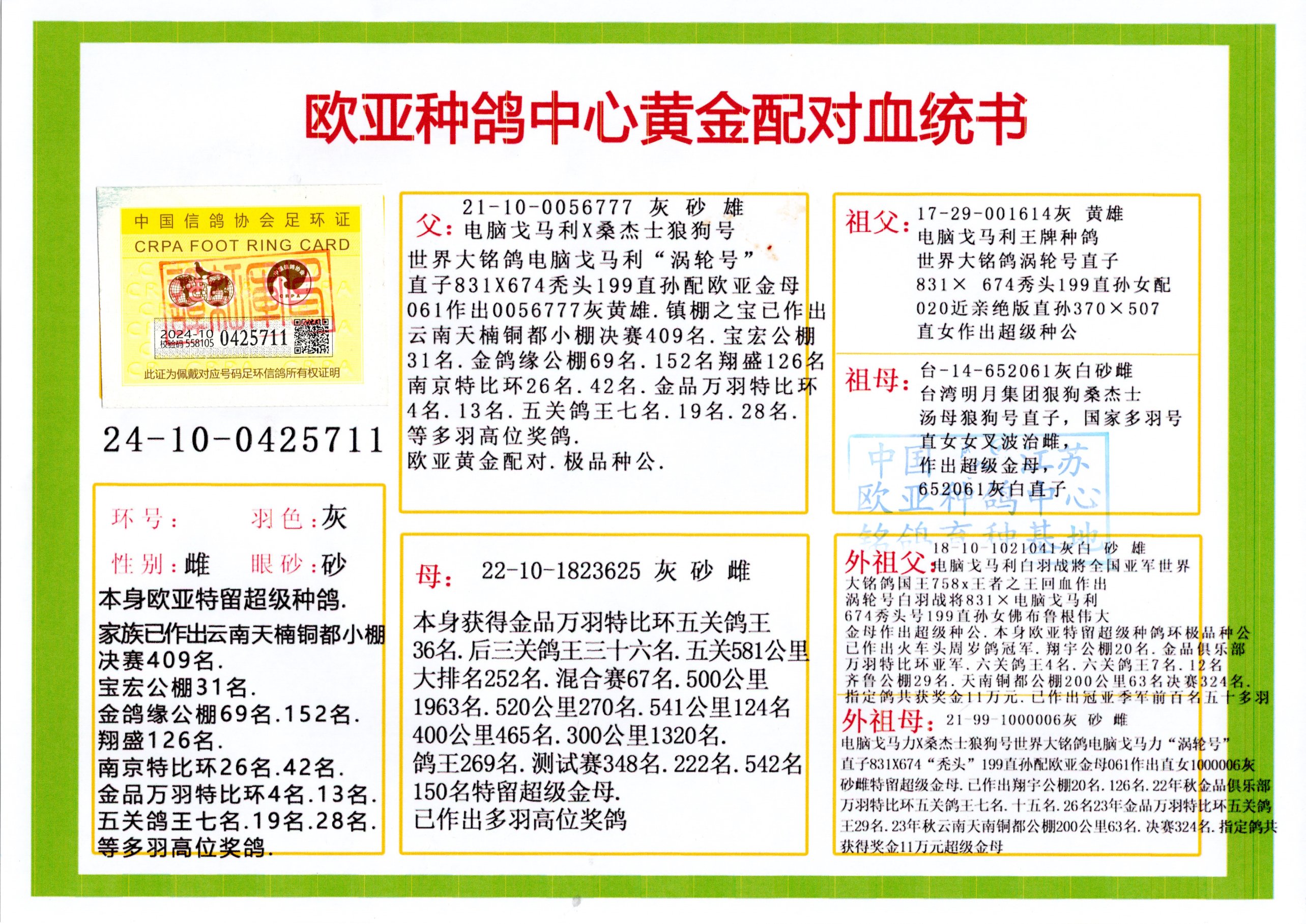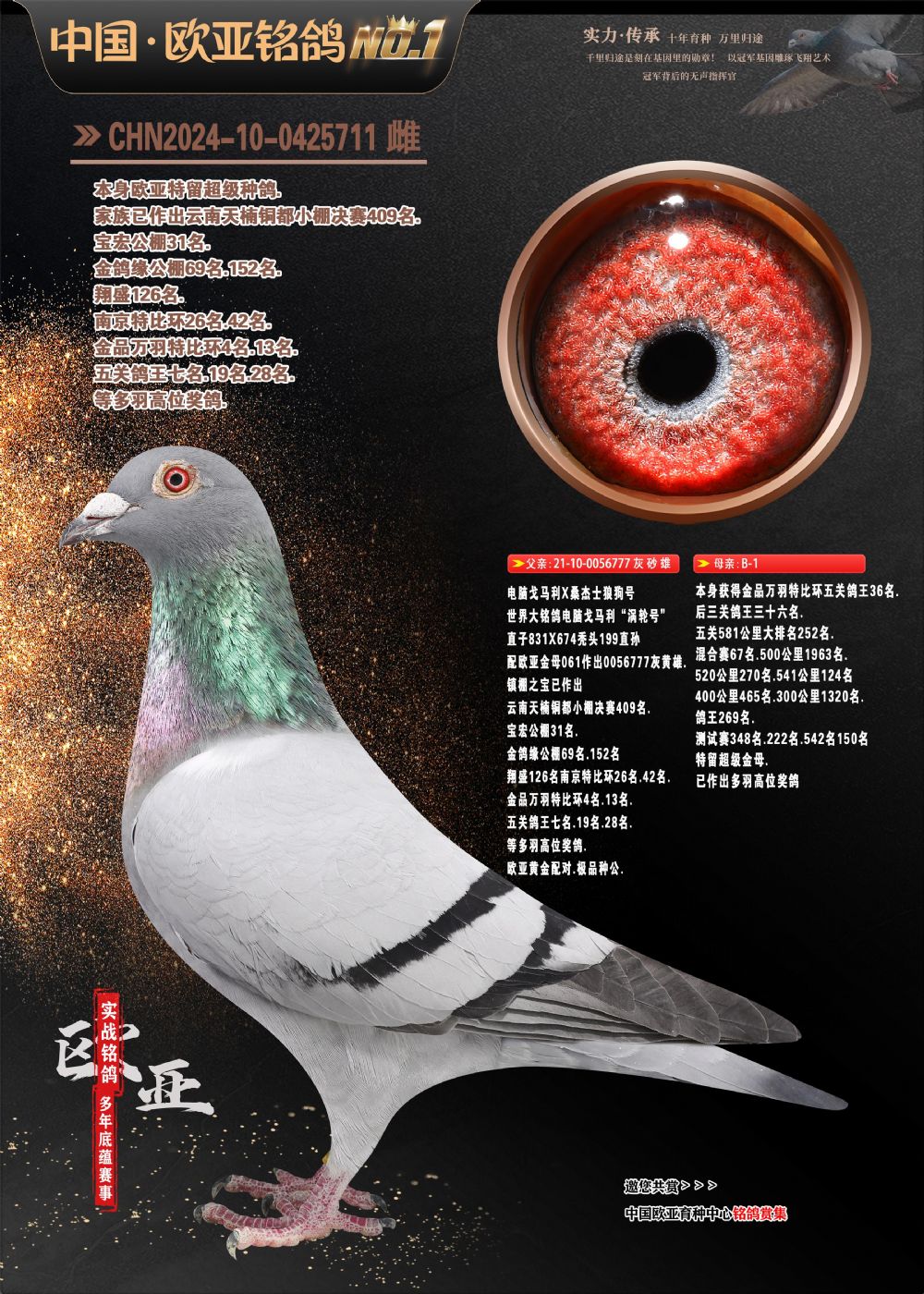 24年秋南京特比环欧亚荣获大团体冠军.小团体冠军551公里大特比13名.14名.16名.19名.20名.21名.24名.26名.27名.28名.42名.52名.54名.57名.65名.66名.68名.70名.71名.72名.74名.76名.80名.82名.83名.84名.85名.86名.90名.92名.110名.116名.121名.122名.128名.131名.158名.161名.164名.165名.166名.172名.174名.177名.182名.195名.196名.201名.205名.208名.210名.216名.253名.269名.275名.276名.294名.296名.299名,,24年秋云南天南铜都公棚决赛415名.天南铜都小棚决赛409名.云南玉活公棚决赛102名.490名.团体32名上笼二羽进二羽,天南铜都大棚506公里决赛445名。热烈祝贺河北省巨鹿县李兰生老师用欧亚泰山号血系连续十一年夺冠军,河北省国家赛冠军.全国季军等多次前十名高位,扬州王军王总用欧亚利奥24年春季获山东翔宇公棚决赛33名盖比53名。南京刘正龙刘总用欧亚盖比获得24年秋山东潍坊国际公棚决赛42名.精英赛30名.三关鸽王71名.决赛86名.加站赛16名.南京市特比环A组鸽王9名.B组鸽王5名.6名.C组鸽王5名.精英赛冠军4名.技能赛A组冠军4名.5名.秦淮区特比环荣获15名.46名.48名.87名。四川西昌徐亮徐总用欧亚利奥获得凉山州聚友决赛177名.第二关亚军双关鸽王19名.三关鸽王105名.云南豪庭公棚决赛603名。热烈祝贺24年四川重庆翔园鸽舍用欧亚泰山号荣获春季400公里冠军.秋季500公里冠军,河北王总用詹森X利奥获得千羽千翔公棚400公里冠军,广东蔡楷焕荣获24年秋爱好者 赛鸽俱乐部三关鸽王季军.一关420公里99名.二关450公里11名.三关520公里32名.单关季军.7名.12名,江西李卫兴荣获贵州红枫公棚8名.共翔俱乐部寄养棚四关综合鸽王30名.一关400公里78名.二关500公里55名.三关520公里37名.四关500公里57名.同父母获公棚18名.雷鸣获得武汉黄浦育翔中心冠军,四川陈文获得四川明鸿俱乐部300公里梦幻2名.3名.4名.9名.10名.13名.14名.15名.31名.34名.40名.41名.42名.43名.69名.71名.72名.73名.74名.94名.95名.97名.98名.99名.419公里决赛荣获总冠军7名.总共归巢9羽,四川徐亮获豪庭决赛603名,山西郑勇获得山西泰鑫公棚决赛255名詹森红狐,热烈祝贺马总获得开尔(飞跃队)决赛9名获奖金1310000万元.第一关52名,天津津福资赛180公里96名.获奖金429543万元,欧亚支持全国鸽友24年秋多人报喜 祝大家取得更好成绩,给欧亚报喜鸽友欧亚决定给每人赠送一羽超级种鸽。欧亚俱乐部特比环多关鸽王成绩:15年秋淮安特比环黑色星期一全会上笼9700多羽,当天无鸽归巢,第二天全会归巢357羽,本舍归巢158羽.前十名八羽.前一百名归巢57羽,16年春季获五关鸽王总冠军,总亚军四名.六名.七名.九名.十名.晶艺俱乐部520公里冠亚季军5名.6名.7名.9名.11名等,火车头冠军.季军6名.8名.9名.10名,16年秋晶艺俱乐部特比环520公里亚军.季军4名.6名.7名.9名,15年春南京白下特比环冠军.亚军.季军6名.7名.8名.9名.10名.指定鸽A B组获得冠军.亚军.季军4名.5名.,17年淮安特比环亚军.4名.5名.7名.8名.10名.六关鸽王总冠军.4名.6名.9名.10名,寄养棚宿迁刘总20羽特比环获冠军.季军.4名.7名.8名.9名等。18年荣获万羽特比环六关鸽王总冠军.总亚军.总季军.6名.8名.十名.单关四羽冠军.二羽亚军.四羽季军.前十名27羽。19年秋万羽特比环六关鸽王总亚军.总季军.5名.8名等,单关二羽冠军.三羽亚军.一羽季军前十名31羽。20年秋淮安市鸽会四关特比环大赛风雨无阻鸽王亚军.鸽王六名,金品俱乐部万羽特比环六关鸽王总冠军,总亚军.四名.五名.六名.七名.八名.十名.前二百名鸽王35羽,单关冠亚季军前十名四十多羽,火车头五关鸽王季军.六名.八名.前二百名鸽王十七羽。20年春荣获淮安五区一市四关鸽王总冠军.亚军.四名.八名.九名。21年秋荣获金品万羽特比环大赛六关鸽王总亚军.总季军.四名.七名.九名.十名.单关冠亚军季军前十名三十多羽。火车头协会鸽王六名.七名.十名.单关前十名十七羽。22年秋荣获鸽王总冠军.总亚军.5名.7名.8名.9名.11名.单关冠亚季军前十名三十多羽,第一关单关前二百名四十多羽,第二关前二百名三十多羽,第三关前二百名四十多羽,第四关前二百名四十多羽,第五关前一百名53羽。23年秋荣获鸽王季军.五名.八名.十名.13名.17名.20名.27名等多羽鸽王.单关前十名二十多羽。公棚.寄养棚部分成绩:16年秋宁夏黄河公棚总冠军电脑戈马力指定通炮冠军,17年送八羽参赛获得鸽王八名进奖四名,支持韩总荣获八名。支持鸽友荣获宁夏中卫公棚决赛总冠军.精英赛冠军,支持18年宁夏黄河公棚决赛冠军詹森X泰山。安徽鼎博寄养棚院内外四关鸽王总冠军.鸽王十七名.三十七名同窝,鸽王39名.42名.58名.67名。18年山东公棚预赛冠军.决赛65名.送八羽进奖五羽.指定获奔驰汽车一辆。支持鸽友获得云南蓝云公棚冠军.盖比X佛卡门。支持鸽友荣获云南银集公棚决赛冠军 詹森427X520血系 速度赛6700羽冠军。17年荣获金马俱乐部寄养棚四关鸽王总冠军.季军.六名.八名.第一关冠军.亚军.季军四名.七名.十一名.金牌教练奖。支持鸽友18年北京费翔公棚预赛九名电脑X桑杰士,支持鸽友荣获陕西威力公棚决赛11名.内蒙古临河寄养棚四关鸽王六名.詹森配泰山,支持河北王总用欧亚詹森427配胡本喜获20年秋开尔青年棚季军。云南东荣公棚16年预赛冠军.决赛77名.17年决赛12名.詹森红狐X泰山,17年平安公棚决赛4名 詹森427。欧亚获得21年金母寄养棚第一关四名.第二关5名.第三关5名.6名.7名.10名.三关鸽王总冠军,四关鸽王14名.十羽鸽王。支持河