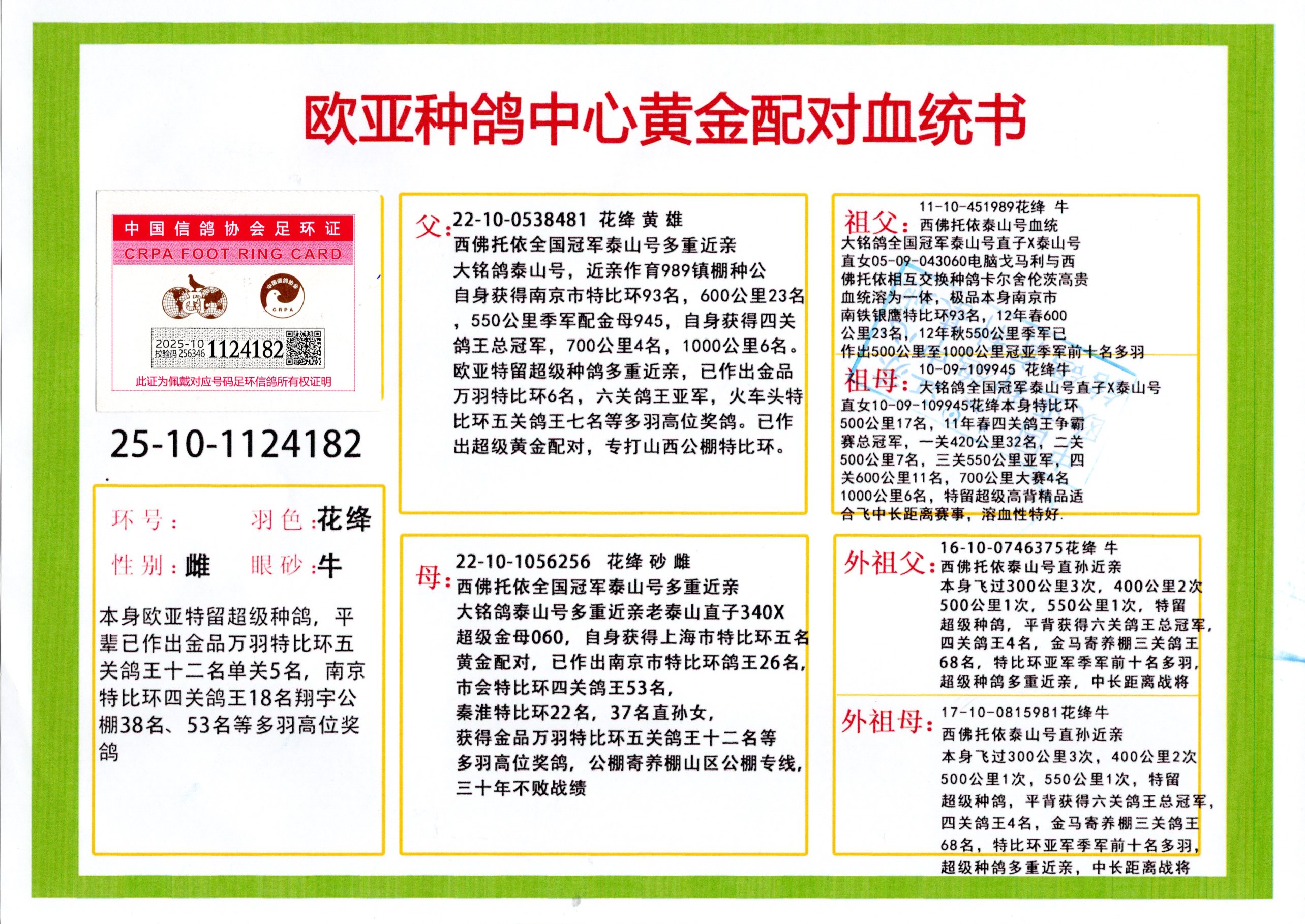 24年秋南京特比环欧亚荣获大团体冠军.小团体冠军551公里大特比13名.14名.16名.19名.20名.21名.24名.26名.27名.28名.42名.52名.54名.57名.65名.66名.68名.70名.71名.72名.74名.76名.80名.82名.83名.84名.85名.86名.90名.92名.110名.116名.121名.122名.128名.131名.158名.161名.164名.165名.166名.172名.174名.177名.182名.195名.196名.201名.205名.208名.210名.216名.253名.269名.275名.276名.294名.296名.299名,,24年秋云南天南铜都公棚决赛415名.天南铜都小棚决赛409名.云南玉活公棚决赛102名.490名.团体32名上笼二羽进二羽,天南铜都大棚506公里决赛445名。热烈祝贺河北省巨鹿县李兰生老师用欧亚泰山号血系连续十一年夺冠军,河北省国家赛冠军.全国季军等多次前十名高位,扬州王军王总用欧亚利奥24年春季获山东翔宇公棚决赛33名盖比53名。南京刘正龙刘总用欧亚盖比获得24年秋山东潍坊国际公棚决赛42名.精英赛30名.三关鸽王71名.决赛86名.加站赛16名.南京市特比环A组鸽王9名.B组鸽王5名.6名.C组鸽王5名.精英赛冠军4名.技能赛A组冠军4名.5名.秦淮区特比环荣获15名.46名.48名.87名。四川西昌徐亮徐总用欧亚利奥获得凉山州聚友决赛177名.第二关亚军双关鸽王19名.三关鸽王105名.云南豪庭公棚决赛603名。热烈祝贺24年四川重庆翔园鸽舍用欧亚泰山号荣获春季400公里冠军.秋季500公里冠军,河北王总用詹森X利奥获得千羽千翔公棚400公里冠军,广东蔡楷焕荣获24年秋爱好者 赛鸽俱乐部三关鸽王季军.一关420公里99名.二关450公里11名.三关520公里32名.单关季军.7名.12名,江西李卫兴荣获贵州红枫公棚8名.共翔俱乐部寄养棚四关综合鸽王30名.一关400公里78名.二关500公里55名.三关520公里37名.四关500公里57名.同父母获公棚18名.雷鸣获得武汉黄浦育翔中心冠军,四川陈文获得四川明鸿俱乐部300公里梦幻2名.3名.4名.9名.10名.13名.14名.15名.31名.34名.40名.41名.42名.43名.69名.71名.72名.73名.74名.94名.95名.97名.98名.99名.419公里决赛荣获总冠军7名.总共归巢9羽,四川徐亮获豪庭决赛603名,山西郑勇获得山西泰鑫公棚决赛255名詹森红狐,热烈祝贺马总获得开尔(飞跃队)决赛9名获奖金1310000万元.第一关52名,天津津福资赛180公里96名.获奖金429543万元,欧亚支持全国鸽友24年秋多人报喜 祝大家取得更好成绩,给欧亚报喜鸽友欧亚决定给每人赠送一羽超级种鸽。欧亚俱乐部特比环多关鸽王成绩:15年秋淮安特比环黑色星期一全会上笼9700多羽,当天无鸽归巢,第二天全会归巢357羽,本舍归巢158羽.前十名八羽.前一百名归巢57羽,16年春季获五关鸽王总冠军,总亚军四名.六名.七名.九名.十名.晶艺俱乐部520公里冠亚季军5名.6名.7名.9名.11名等,火车头冠军.季军6名.8名.9名.10名,16年秋晶艺俱乐部特比环520公里亚军.季军4名.6名.7名.9名,15年春南京白下特比环冠军.亚军.季军6名.7名.8名.9名.10名.指定鸽A B组获得冠军.亚军.季军4名.5名.,17年淮安特比环亚军.4名.5名.7名.8名.10名.六关鸽王总冠军.4名.6名.9名.10名,寄养棚宿迁刘总20羽特比环获冠军.季军.4名.7名.8名.9名等。18年荣获万羽特比环六关鸽王总冠军.总亚军.总季军.6名.8名.十名.单关四羽冠军.二羽亚军.四羽季军.前十名27羽。19年秋万羽特比环六关鸽王总亚军.总季军.5名.8名等,单关二羽冠军.三羽亚军.一羽季军前十名31羽。20年秋淮安市鸽会四关特比环大赛风雨无阻鸽王亚军.鸽王六名,金品俱乐部万羽特比环六关鸽王总冠军,总亚军.四名.五名.六名.七名.八名.十名.前二百名鸽王35羽,单关冠亚季军前十名四十多羽,火车头五关鸽王季军.六名.八名.前二百名鸽王十七羽。20年春荣获淮安五区一市四关鸽王总冠军.亚军.四名.八名.九名。21年秋荣获金品万羽特比环大赛六关鸽王总亚军.总季军.四名.七名.九名.十名.单关冠亚军季军前十名三十多羽。火车头协会鸽王六名.七名.十名.单关前十名十七羽。22年秋荣获鸽王总冠军.总亚军.5名.7名.8名.9名.11名.单关冠亚季军前十名三十多羽,第一关单关前二百名四十多羽,第二关前二百名三十多羽,第三关前二百名四十多羽,第四关前二百名四十多羽,第五关前一百名53羽。23年秋荣获鸽王季军.五名.八名.十名.13名.17名.20名.27名等多羽鸽王.单关前十名二十多羽。公棚.寄养棚部分成绩:16年秋宁夏黄河公棚总冠军电脑戈马力指定通炮冠军,17年送八羽参赛获得鸽王八名进奖四名,支持韩总荣获八名。支持鸽友荣获宁夏中卫公棚决赛总冠军.精英赛冠军,支持18年宁夏黄河公棚决赛冠军詹森X泰山。安徽鼎博寄养棚院内外四关鸽王总冠军.鸽王十七名.三十七名同窝,鸽王39名.42名.58名.67名。18年山东公棚预赛冠军.决赛65名.送八羽进奖五羽.指定获奔驰汽车一辆。支持鸽友获得云南蓝云公棚冠军.盖比X佛卡门。支持鸽友荣获云南银集公棚决赛冠军 詹森427X520血系 速度赛6700羽冠军。17年荣获金马俱乐部寄养棚四关鸽王总冠军.季军.六名.八名.第一关冠军.亚军.季军四名.七名.十一名.金牌教练奖。支持鸽友18年北京费翔公棚预赛九名电脑X桑杰士,支持鸽友荣获陕西威力公棚决赛11名.内蒙古临河寄养棚四关鸽王六名.詹森配泰山,支持河北王总用欧亚詹森427配胡本喜获20年秋开尔青年棚季军。云南东荣公棚16年预赛冠军.决赛77名.17年决赛12名.詹森红狐X泰山,17年平安公棚决赛4名 詹森427。欧亚获得21年金母寄养棚第一关四名.第二关5名.第三关5名.6名.7名.10名.三关鸽王总冠军,四关鸽王14名.十羽鸽王。支持河