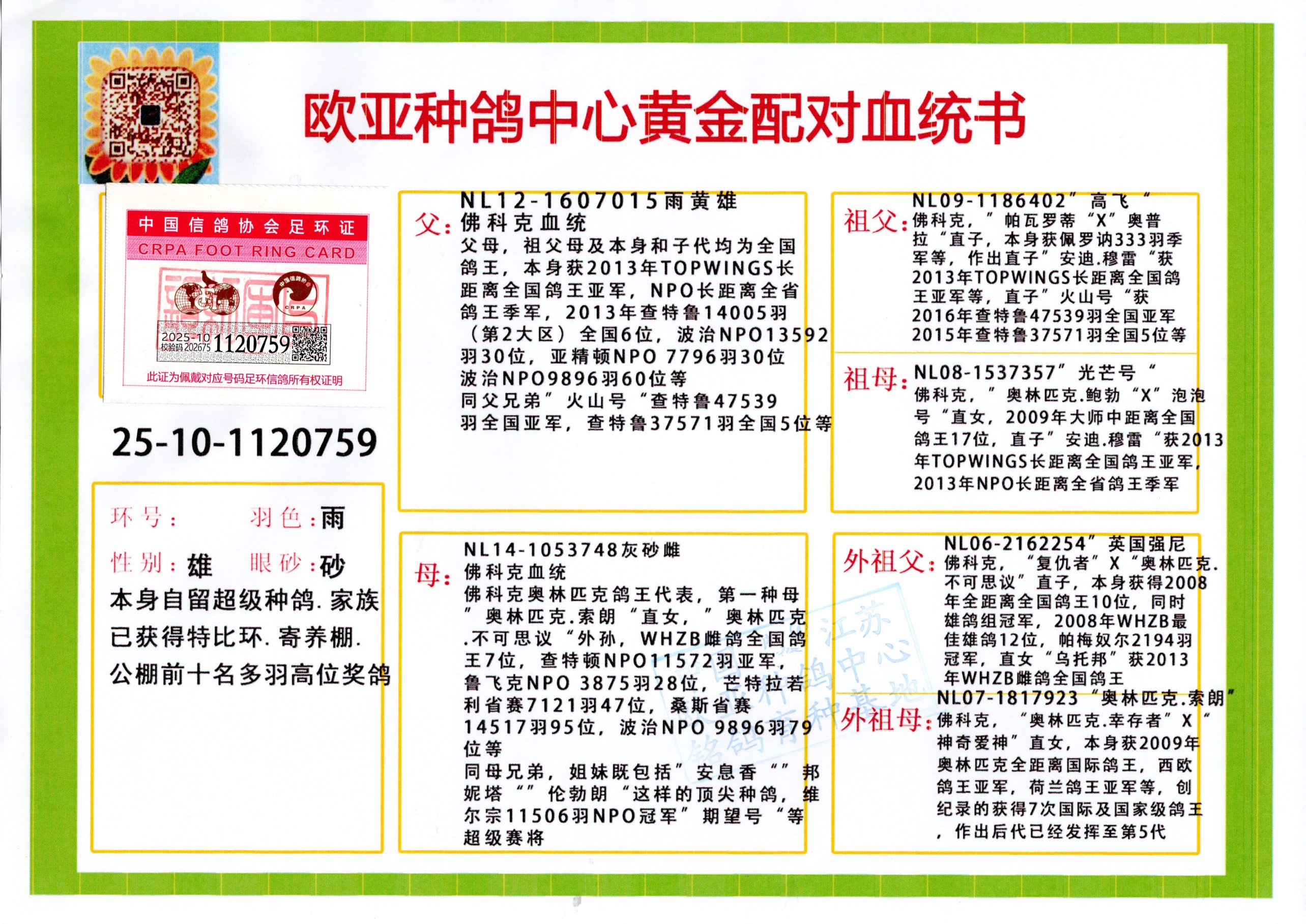 24年秋南京特比环欧亚荣获大团体冠军.小团体冠军551公里大特比13名.14名.16名.19名.20名.21名.24名.26名.27名.28名.42名.52名.54名.57名.65名.66名.68名.70名.71名.72名.74名.76名.80名.82名.83名.84名.85名.86名.90名.92名.110名.116名.121名.122名.128名.131名.158名.161名.164名.165名.166名.172名.174名.177名.182名.195名.196名.201名.205名.208名.210名.216名.253名.269名.275名.276名.294名.296名.299名,,24年秋云南天南铜都公棚决赛415名.天南铜都小棚决赛409名.云南玉活公棚决赛102名.490名.团体32名上笼二羽进二羽,天南铜都大棚506公里决赛445名。热烈祝贺河北省巨鹿县李兰生老师用欧亚泰山号血系连续十一年夺冠军,河北省国家赛冠军.全国季军等多次前十名高位,扬州王军王总用欧亚利奥24年春季获山东翔宇公棚决赛33名盖比53名。南京刘正龙刘总用欧亚盖比获得24年秋山东潍坊国际公棚决赛42名.精英赛30名.三关鸽王71名.决赛86名.加站赛16名.南京市特比环A组鸽王9名.B组鸽王5名.6名.C组鸽王5名.精英赛冠军4名.技能赛A组冠军4名.5名.秦淮区特比环荣获15名.46名.48名.87名。四川西昌徐亮徐总用欧亚利奥获得凉山州聚友决赛177名.第二关亚军双关鸽王19名.三关鸽王105名.云南豪庭公棚决赛603名。热烈祝贺24年四川重庆翔园鸽舍用欧亚泰山号荣获春季400公里冠军.秋季500公里冠军,河北王总用詹森X利奥获得千羽千翔公棚400公里冠军,广东蔡楷焕荣获24年秋爱好者 赛鸽俱乐部三关鸽王季军.一关420公里99名.二关450公里11名.三关520公里32名.单关季军.7名.12名,江西李卫兴荣获贵州红枫公棚8名.共翔俱乐部寄养棚四关综合鸽王30名.一关400公里78名.二关500公里55名.三关520公里37名.四关500公里57名.同父母获公棚18名.雷鸣获得武汉黄浦育翔中心冠军,四川陈文获得四川明鸿俱乐部300公里梦幻2名.3名.4名.9名.10名.13名.14名.15名.31名.34名.40名.41名.42名.43名.69名.71名.72名.73名.74名.94名.95名.97名.98名.99名.419公里决赛荣获总冠军7名.总共归巢9羽,四川徐亮获豪庭决赛603名,山西郑勇获得山西泰鑫公棚决赛255名詹森红狐,热烈祝贺马总获得开尔(飞跃队)决赛9名获奖金1310000万元.第一关52名,天津津福资赛180公里96名.获奖金429543万元,欧亚支持全国鸽友24年秋多人报喜 祝大家取得更好成绩,给欧亚报喜鸽友欧亚决定给每人赠送一羽超级种鸽。欧亚俱乐部特比环多关鸽王成绩:15年秋淮安特比环黑色星期一全会上笼9700多羽,当天无鸽归巢,第二天全会归巢357羽,本舍归巢158羽.前十名八羽.前一百名归巢57羽,16年春季获五关鸽王总冠军,总亚军四名.六名.七名.九名.十名.晶艺俱乐部520公里冠亚季军5名.6名.7名.9名.11名等,火车头冠军.季军6名.8名.9名.10名,16年秋晶艺俱乐部特比环520公里亚军.季军4名.6名.7名.9名,15年春南京白下特比环冠军.亚军.季军6名.7名.8名.9名.10名.指定鸽A B组获得冠军.亚军.季军4名.5名.,17年淮安特比环亚军.4名.5名.7名.8名.10名.六关鸽王总冠军.4名.6名.9名.10名,寄养棚宿迁刘总20羽特比环获冠军.季军.4名.7名.8名.9名等。18年荣获万羽特比环六关鸽王总冠军.总亚军.总季军.6名.8名.十名.单关四羽冠军.二羽亚军.四羽季军.前十名27羽。19年秋万羽特比环六关鸽王总亚军.总季军.5名.8名等,单关二羽冠军.三羽亚军.一羽季军前十名31羽。20年秋淮安市鸽会四关特比环大赛风雨无阻鸽王亚军.鸽王六名,金品俱乐部万羽特比环六关鸽王总冠军,总亚军.四名.五名.六名.七名.八名.十名.前二百名鸽王35羽,单关冠亚季军前十名四十多羽,火车头五关鸽王季军.六名.八名.前二百名鸽王十七羽。20年春荣获淮安五区一市四关鸽王总冠军.亚军.四名.八名.九名。21年秋荣获金品万羽特比环大赛六关鸽王总亚军.总季军.四名.七名.九名.十名.单关冠亚军季军前十名三十多羽。火车头协会鸽王六名.七名.十名.单关前十名十七羽。22年秋荣获鸽王总冠军.总亚军.5名.7名.8名.9名.11名.单关冠亚季军前十名三十多羽,第一关单关前二百名四十多羽,第二关前二百名三十多羽,第三关前二百名四十多羽,第四关前二百名四十多羽,第五关前一百名53羽。23年秋荣获鸽王季军.五名.八名.十名.13名.17名.20名.27名等多羽鸽王.单关前十名二十多羽。公棚.寄养棚部分成绩:16年秋宁夏黄河公棚总冠军电脑戈马力指定通炮冠军,17年送八羽参赛获得鸽王八名进奖四名,支持韩总荣获八名。支持鸽友荣获宁夏中卫公棚决赛总冠军.精英赛冠军,支持18年宁夏黄河公棚决赛冠军詹森X泰山。安徽鼎博寄养棚院内外四关鸽王总冠军.鸽王十七名.三十七名同窝,鸽王39名.42名.58名.67名。18年山东公棚预赛冠军.决赛65名.送八羽进奖五羽.指定获奔驰汽车一辆。支持鸽友获得云南蓝云公棚冠军.盖比X佛卡门。支持鸽友荣获云南银集公棚决赛冠军 詹森427X520血系 速度赛6700羽冠军。17年荣获金马俱乐部寄养棚四关鸽王总冠军.季军.六名.八名.第一关冠军.亚军.季军四名.七名.十一名.金牌教练奖。支持鸽友18年北京费翔公棚预赛九名电脑X桑杰士,支持鸽友荣获陕西威力公棚决赛11名.内蒙古临河寄养棚四关鸽王六名.詹森配泰山,支持河北王总用欧亚詹森427配胡本喜获20年秋开尔青年棚季军。云南东荣公棚16年预赛冠军.决赛77名.17年决赛12名.詹森红狐X泰山,17年平安公棚决赛4名 詹森427。欧亚获得21年金母寄养棚第一关四名.第二关5名.第三关5名.6名.7名.10名.三关鸽王总冠军,四关鸽王14名.十羽鸽王。支持河