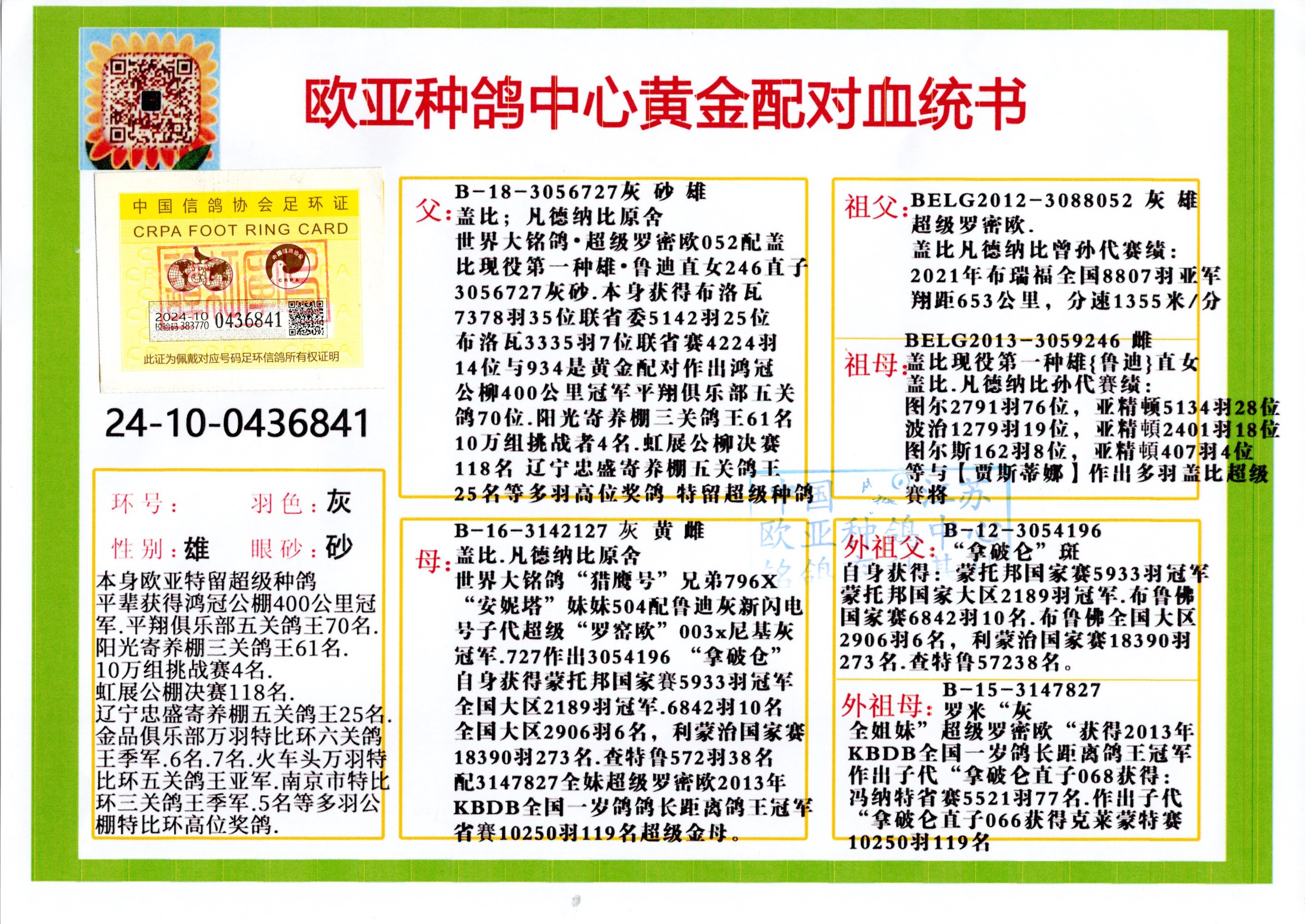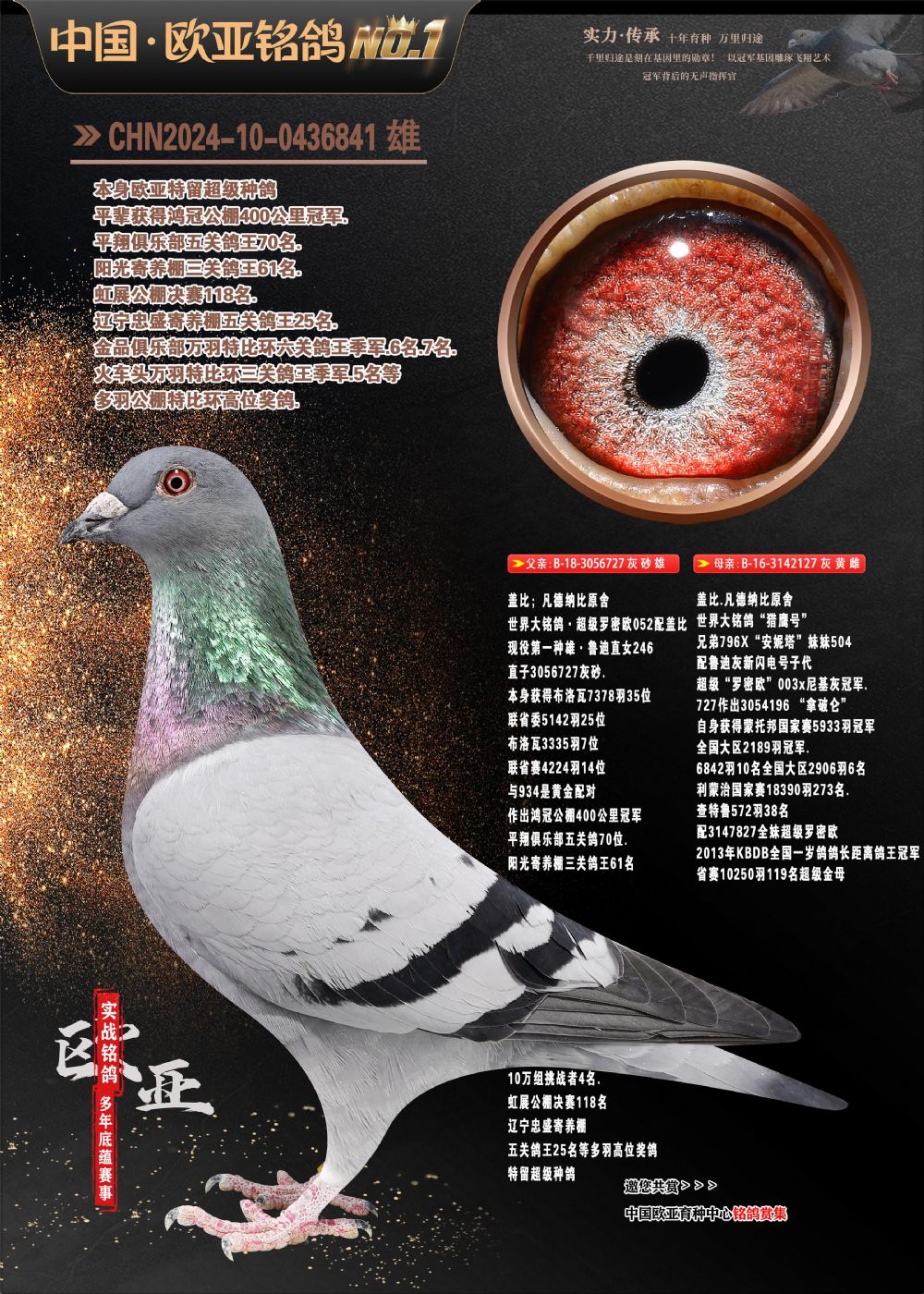 24年秋南京特比环欧亚荣获大团体冠军.小团体冠军551公里大特比13名.14名.16名.19名.20名.21名.24名.26名.27名.28名.42名.52名.54名.57名.65名.66名.68名.70名.71名.72名.74名.76名.80名.82名.83名.84名.85名.86名.90名.92名.110名.116名.121名.122名.128名.131名.158名.161名.164名.165名.166名.172名.174名.177名.182名.195名.196名.201名.205名.208名.210名.216名.253名.269名.275名.276名.294名.296名.299名,,24年秋云南天南铜都公棚决赛415名.天南铜都小棚决赛409名.云南玉活公棚决赛102名.490名.团体32名上笼二羽进二羽,天南铜都大棚506公里决赛445名。热烈祝贺河北省巨鹿县李兰生老师用欧亚泰山号血系连续十一年夺冠军,河北省国家赛冠军.全国季军等多次前十名高位,扬州王军王总用欧亚利奥24年春季获山东翔宇公棚决赛33名盖比53名。南京刘正龙刘总用欧亚盖比获得24年秋山东潍坊国际公棚决赛42名.精英赛30名.三关鸽王71名.决赛86名.加站赛16名.南京市特比环A组鸽王9名.B组鸽王5名.6名.C组鸽王5名.精英赛冠军4名.技能赛A组冠军4名.5名.秦淮区特比环荣获15名.46名.48名.87名。四川西昌徐亮徐总用欧亚利奥获得凉山州聚友决赛177名.第二关亚军双关鸽王19名.三关鸽王105名.云南豪庭公棚决赛603名。热烈祝贺24年四川重庆翔园鸽舍用欧亚泰山号荣获春季400公里冠军.秋季500公里冠军,河北王总用詹森X利奥获得千羽千翔公棚400公里冠军,广东蔡楷焕荣获24年秋爱好者 赛鸽俱乐部三关鸽王季军.一关420公里99名.二关450公里11名.三关520公里32名.单关季军.7名.12名,江西李卫兴荣获贵州红枫公棚8名.共翔俱乐部寄养棚四关综合鸽王30名.一关400公里78名.二关500公里55名.三关520公里37名.四关500公里57名.同父母获公棚18名.雷鸣获得武汉黄浦育翔中心冠军,四川陈文获得四川明鸿俱乐部300公里梦幻2名.3名.4名.9名.10名.13名.14名.15名.31名.34名.40名.41名.42名.43名.69名.71名.72名.73名.74名.94名.95名.97名.98名.99名.419公里决赛荣获总冠军7名.总共归巢9羽,四川徐亮获豪庭决赛603名,山西郑勇获得山西泰鑫公棚决赛255名詹森红狐,热烈祝贺马总获得开尔(飞跃队)决赛9名获奖金1310000万元.第一关52名,天津津福资赛180公里96名.获奖金429543万元,欧亚支持全国鸽友24年秋多人报喜 祝大家取得更好成绩,给欧亚报喜鸽友欧亚决定给每人赠送一羽超级种鸽。欧亚俱乐部特比环多关鸽王成绩:15年秋淮安特比环黑色星期一全会上笼9700多羽,当天无鸽归巢,第二天全会归巢357羽,本舍归巢158羽.前十名八羽.前一百名归巢57羽,16年春季获五关鸽王总冠军,总亚军四名.六名.七名.九名.十名.晶艺俱乐部520公里冠亚季军5名.6名.7名.9名.11名等,火车头冠军.季军6名.8名.9名.10名,16年秋晶艺俱乐部特比环520公里亚军.季军4名.6名.7名.9名,15年春南京白下特比环冠军.亚军.季军6名.7名.8名.9名.10名.指定鸽A B组获得冠军.亚军.季军4名.5名.,17年淮安特比环亚军.4名.5名.7名.8名.10名.六关鸽王总冠军.4名.6名.9名.10名,寄养棚宿迁刘总20羽特比环获冠军.季军.4名.7名.8名.9名等。18年荣获万羽特比环六关鸽王总冠军.总亚军.总季军.6名.8名.十名.单关四羽冠军.二羽亚军.四羽季军.前十名27羽。19年秋万羽特比环六关鸽王总亚军.总季军.5名.8名等,单关二羽冠军.三羽亚军.一羽季军前十名31羽。20年秋淮安市鸽会四关特比环大赛风雨无阻鸽王亚军.鸽王六名,金品俱乐部万羽特比环六关鸽王总冠军,总亚军.四名.五名.六名.七名.八名.十名.前二百名鸽王35羽,单关冠亚季军前十名四十多羽,火车头五关鸽王季军.六名.八名.前二百名鸽王十七羽。20年春荣获淮安五区一市四关鸽王总冠军.亚军.四名.八名.九名。21年秋荣获金品万羽特比环大赛六关鸽王总亚军.总季军.四名.七名.九名.十名.单关冠亚军季军前十名三十多羽。火车头协会鸽王六名.七名.十名.单关前十名十七羽。22年秋荣获鸽王总冠军.总亚军.5名.7名.8名.9名.11名.单关冠亚季军前十名三十多羽,第一关单关前二百名四十多羽,第二关前二百名三十多羽,第三关前二百名四十多羽,第四关前二百名四十多羽,第五关前一百名53羽。23年秋荣获鸽王季军.五名.八名.十名.13名.17名.20名.27名等多羽鸽王.单关前十名二十多羽。公棚.寄养棚部分成绩:16年秋宁夏黄河公棚总冠军电脑戈马力指定通炮冠军,17年送八羽参赛获得鸽王八名进奖四名,支持韩总荣获八名。支持鸽友荣获宁夏中卫公棚决赛总冠军.精英赛冠军,支持18年宁夏黄河公棚决赛冠军詹森X泰山。安徽鼎博寄养棚院内外四关鸽王总冠军.鸽王十七名.三十七名同窝,鸽王39名.42名.58名.67名。18年山东公棚预赛冠军.决赛65名.送八羽进奖五羽.指定获奔驰汽车一辆。支持鸽友获得云南蓝云公棚冠军.盖比X佛卡门。支持鸽友荣获云南银集公棚决赛冠军 詹森427X520血系 速度赛6700羽冠军。17年荣获金马俱乐部寄养棚四关鸽王总冠军.季军.六名.八名.第一关冠军.亚军.季军四名.七名.十一名.金牌教练奖。支持鸽友18年北京费翔公棚预赛九名电脑X桑杰士,支持鸽友荣获陕西威力公棚决赛11名.内蒙古临河寄养棚四关鸽王六名.詹森配泰山,支持河北王总用欧亚詹森427配胡本喜获20年秋开尔青年棚季军。云南东荣公棚16年预赛冠军.决赛77名.17年决赛12名.詹森红狐X泰山,17年平安公棚决赛4名 詹森427。欧亚获得21年金母寄养棚第一关四名.第二关5名.第三关5名.6名.7名.10名.三关鸽王总冠军,四关鸽王14名.十羽鸽王。支持河