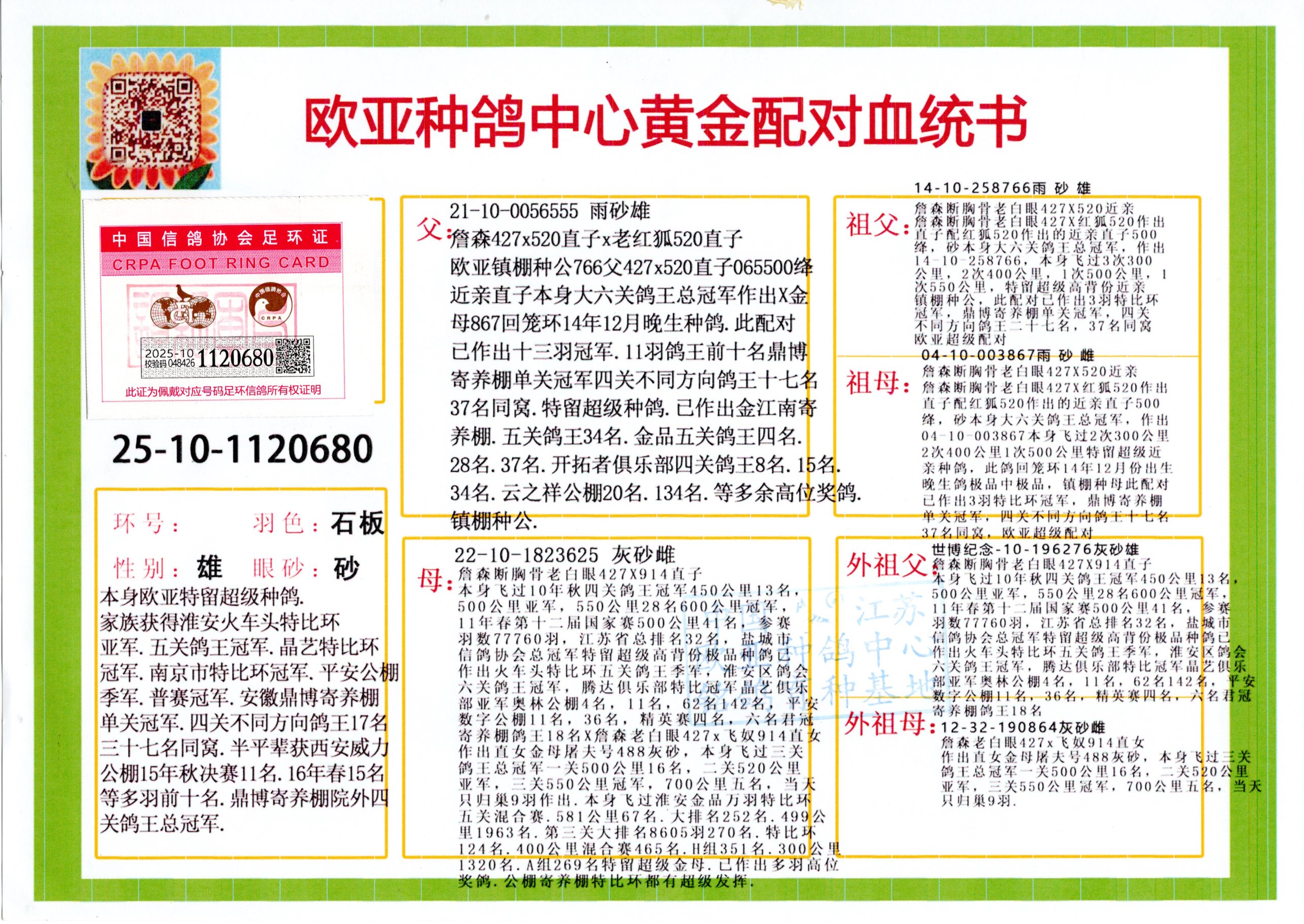 24年秋南京特比环欧亚荣获大团体冠军.小团体冠军551公里大特比13名.14名.16名.19名.20名.21名.24名.26名.27名.28名.42名.52名.54名.57名.65名.66名.68名.70名.71名.72名.74名.76名.80名.82名.83名.84名.85名.86名.90名.92名.110名.116名.121名.122名.128名.131名.158名.161名.164名.165名.166名.172名.174名.177名.182名.195名.196名.201名.205名.208名.210名.216名.253名.269名.275名.276名.294名.296名.299名,,24年秋云南天南铜都公棚决赛415名.天南铜都小棚决赛409名.云南玉活公棚决赛102名.490名.团体32名上笼二羽进二羽,天南铜都大棚506公里决赛445名。热烈祝贺河北省巨鹿县李兰生老师用欧亚泰山号血系连续十一年夺冠军,河北省国家赛冠军.全国季军等多次前十名高位,扬州王军王总用欧亚利奥24年春季获山东翔宇公棚决赛33名盖比53名。南京刘正龙刘总用欧亚盖比获得24年秋山东潍坊国际公棚决赛42名.精英赛30名.三关鸽王71名.决赛86名.加站赛16名.南京市特比环A组鸽王9名.B组鸽王5名.6名.C组鸽王5名.精英赛冠军4名.技能赛A组冠军4名.5名.秦淮区特比环荣获15名.46名.48名.87名。四川西昌徐亮徐总用欧亚利奥获得凉山州聚友决赛177名.第二关亚军双关鸽王19名.三关鸽王105名.云南豪庭公棚决赛603名。热烈祝贺24年四川重庆翔园鸽舍用欧亚泰山号荣获春季400公里冠军.秋季500公里冠军,河北王总用詹森X利奥获得千羽千翔公棚400公里冠军,广东蔡楷焕荣获24年秋爱好者 赛鸽俱乐部三关鸽王季军.一关420公里99名.二关450公里11名.三关520公里32名.单关季军.7名.12名,江西李卫兴荣获贵州红枫公棚8名.共翔俱乐部寄养棚四关综合鸽王30名.一关400公里78名.二关500公里55名.三关520公里37名.四关500公里57名.同父母获公棚18名.雷鸣获得武汉黄浦育翔中心冠军,四川陈文获得四川明鸿俱乐部300公里梦幻2名.3名.4名.9名.10名.13名.14名.15名.31名.34名.40名.41名.42名.43名.69名.71名.72名.73名.74名.94名.95名.97名.98名.99名.419公里决赛荣获总冠军7名.总共归巢9羽,四川徐亮获豪庭决赛603名,山西郑勇获得山西泰鑫公棚决赛255名詹森红狐,热烈祝贺马总获得开尔(飞跃队)决赛9名获奖金1310000万元.第一关52名,天津津福资赛180公里96名.获奖金429543万元,欧亚支持全国鸽友24年秋多人报喜 祝大家取得更好成绩,给欧亚报喜鸽友欧亚决定给每人赠送一羽超级种鸽。欧亚俱乐部特比环多关鸽王成绩:15年秋淮安特比环黑色星期一全会上笼9700多羽,当天无鸽归巢,第二天全会归巢357羽,本舍归巢158羽.前十名八羽.前一百名归巢57羽,16年春季获五关鸽王总冠军,总亚军四名.六名.七名.九名.十名.晶艺俱乐部520公里冠亚季军5名.6名.7名.9名.11名等,火车头冠军.季军6名.8名.9名.10名,16年秋晶艺俱乐部特比环520公里亚军.季军4名.6名.7名.9名,15年春南京白下特比环冠军.亚军.季军6名.7名.8名.9名.10名.指定鸽A B组获得冠军.亚军.季军4名.5名.,17年淮安特比环亚军.4名.5名.7名.8名.10名.六关鸽王总冠军.4名.6名.9名.10名,寄养棚宿迁刘总20羽特比环获冠军.季军.4名.7名.8名.9名等。18年荣获万羽特比环六关鸽王总冠军.总亚军.总季军.6名.8名.十名.单关四羽冠军.二羽亚军.四羽季军.前十名27羽。19年秋万羽特比环六关鸽王总亚军.总季军.5名.8名等,单关二羽冠军.三羽亚军.一羽季军前十名31羽。20年秋淮安市鸽会四关特比环大赛风雨无阻鸽王亚军.鸽王六名,金品俱乐部万羽特比环六关鸽王总冠军,总亚军.四名.五名.六名.七名.八名.十名.前二百名鸽王35羽,单关冠亚季军前十名四十多羽,火车头五关鸽王季军.六名.八名.前二百名鸽王十七羽。20年春荣获淮安五区一市四关鸽王总冠军.亚军.四名.八名.九名。21年秋荣获金品万羽特比环大赛六关鸽王总亚军.总季军.四名.七名.九名.十名.单关冠亚军季军前十名三十多羽。火车头协会鸽王六名.七名.十名.单关前十名十七羽。22年秋荣获鸽王总冠军.总亚军.5名.7名.8名.9名.11名.单关冠亚季军前十名三十多羽,第一关单关前二百名四十多羽,第二关前二百名三十多羽,第三关前二百名四十多羽,第四关前二百名四十多羽,第五关前一百名53羽。23年秋荣获鸽王季军.五名.八名.十名.13名.17名.20名.27名等多羽鸽王.单关前十名二十多羽。公棚.寄养棚部分成绩:16年秋宁夏黄河公棚总冠军电脑戈马力指定通炮冠军,17年送八羽参赛获得鸽王八名进奖四名,支持韩总荣获八名。支持鸽友荣获宁夏中卫公棚决赛总冠军.精英赛冠军,支持18年宁夏黄河公棚决赛冠军詹森X泰山。安徽鼎博寄养棚院内外四关鸽王总冠军.鸽王十七名.三十七名同窝,鸽王39名.42名.58名.67名。18年山东公棚预赛冠军.决赛65名.送八羽进奖五羽.指定获奔驰汽车一辆。支持鸽友获得云南蓝云公棚冠军.盖比X佛卡门。支持鸽友荣获云南银集公棚决赛冠军 詹森427X520血系 速度赛6700羽冠军。17年荣获金马俱乐部寄养棚四关鸽王总冠军.季军.六名.八名.第一关冠军.亚军.季军四名.七名.十一名.金牌教练奖。支持鸽友18年北京费翔公棚预赛九名电脑X桑杰士,支持鸽友荣获陕西威力公棚决赛11名.内蒙古临河寄养棚四关鸽王六名.詹森配泰山,支持河北王总用欧亚詹森427配胡本喜获20年秋开尔青年棚季军。云南东荣公棚16年预赛冠军.决赛77名.17年决赛12名.詹森红狐X泰山,17年平安公棚决赛4名 詹森427。欧亚获得21年金母寄养棚第一关四名.第二关5名.第三关5名.6名.7名.10名.三关鸽王总冠军,四关鸽王14名.十羽鸽王。支持河