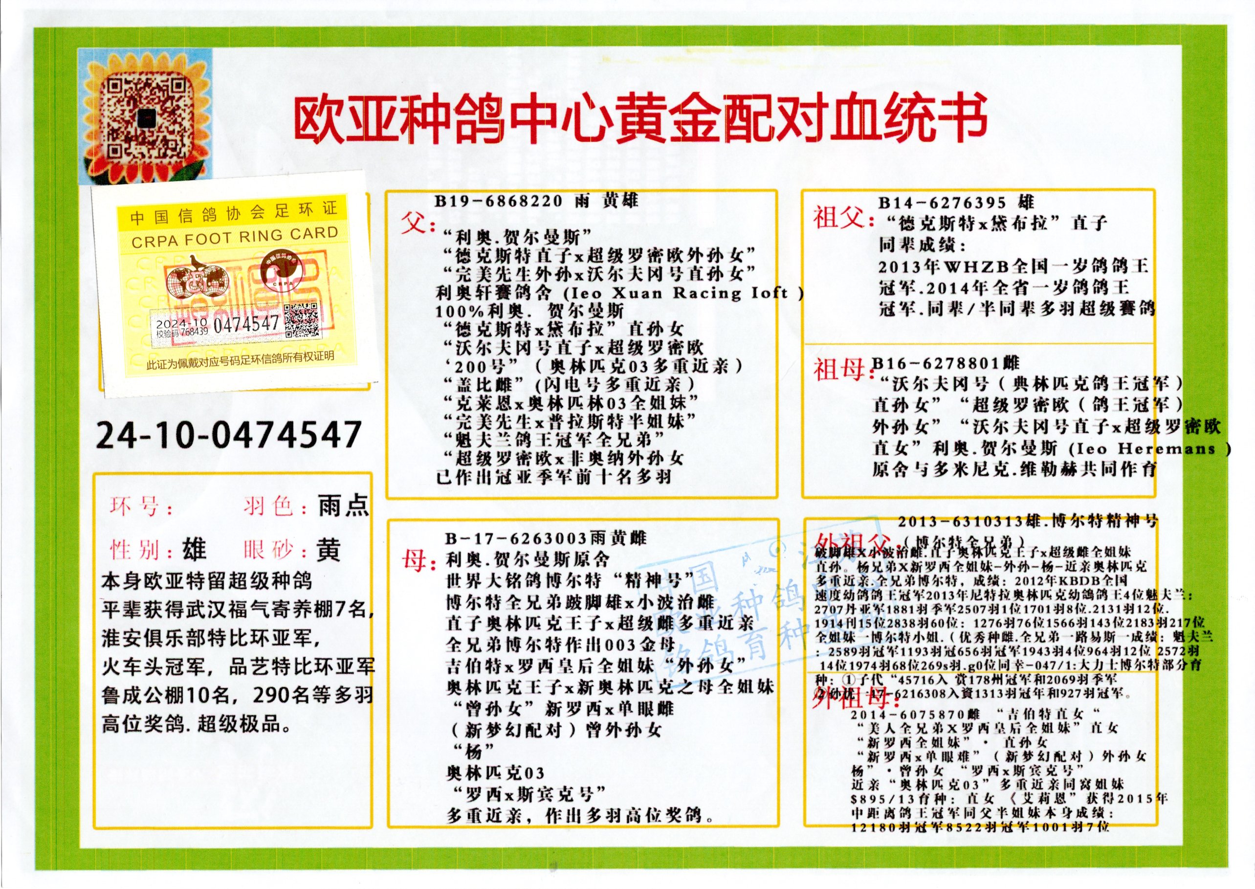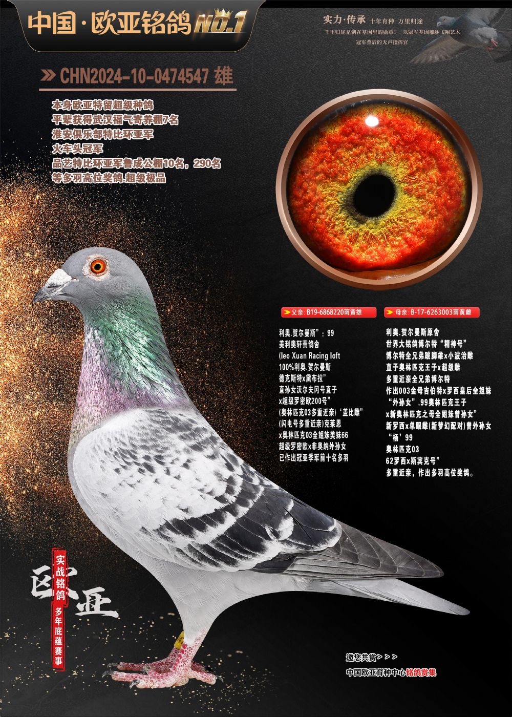 24年秋南京特比环欧亚荣获大团体冠军.小团体冠军551公里大特比13名.14名.16名.19名.20名.21名.24名.26名.27名.28名.42名.52名.54名.57名.65名.66名.68名.70名.71名.72名.74名.76名.80名.82名.83名.84名.85名.86名.90名.92名.110名.116名.121名.122名.128名.131名.158名.161名.164名.165名.166名.172名.174名.177名.182名.195名.196名.201名.205名.208名.210名.216名.253名.269名.275名.276名.294名.296名.299名,,24年秋云南天南铜都公棚决赛415名.天南铜都小棚决赛409名.云南玉活公棚决赛102名.490名.团体32名上笼二羽进二羽,天南铜都大棚506公里决赛445名。热烈祝贺河北省巨鹿县李兰生老师用欧亚泰山号血系连续十一年夺冠军,河北省国家赛冠军.全国季军等多次前十名高位,扬州王军王总用欧亚利奥24年春季获山东翔宇公棚决赛33名盖比53名。南京刘正龙刘总用欧亚盖比获得24年秋山东潍坊国际公棚决赛42名.精英赛30名.三关鸽王71名.决赛86名.加站赛16名.南京市特比环A组鸽王9名.B组鸽王5名.6名.C组鸽王5名.精英赛冠军4名.技能赛A组冠军4名.5名.秦淮区特比环荣获15名.46名.48名.87名。四川西昌徐亮徐总用欧亚利奥获得凉山州聚友决赛177名.第二关亚军双关鸽王19名.三关鸽王105名.云南豪庭公棚决赛603名。热烈祝贺24年四川重庆翔园鸽舍用欧亚泰山号荣获春季400公里冠军.秋季500公里冠军,河北王总用詹森X利奥获得千羽千翔公棚400公里冠军,广东蔡楷焕荣获24年秋爱好者 赛鸽俱乐部三关鸽王季军.一关420公里99名.二关450公里11名.三关520公里32名.单关季军.7名.12名,江西李卫兴荣获贵州红枫公棚8名.共翔俱乐部寄养棚四关综合鸽王30名.一关400公里78名.二关500公里55名.三关520公里37名.四关500公里57名.同父母获公棚18名.雷鸣获得武汉黄浦育翔中心冠军,四川陈文获得四川明鸿俱乐部300公里梦幻2名.3名.4名.9名.10名.13名.14名.15名.31名.34名.40名.41名.42名.43名.69名.71名.72名.73名.74名.94名.95名.97名.98名.99名.419公里决赛荣获总冠军7名.总共归巢9羽,四川徐亮获豪庭决赛603名,山西郑勇获得山西泰鑫公棚决赛255名詹森红狐,热烈祝贺马总获得开尔(飞跃队)决赛9名获奖金1310000万元.第一关52名,天津津福资赛180公里96名.获奖金429543万元,欧亚支持全国鸽友24年秋多人报喜 祝大家取得更好成绩,给欧亚报喜鸽友欧亚决定给每人赠送一羽超级种鸽。欧亚俱乐部特比环多关鸽王成绩:15年秋淮安特比环黑色星期一全会上笼9700多羽,当天无鸽归巢,第二天全会归巢357羽,本舍归巢158羽.前十名八羽.前一百名归巢57羽,16年春季获五关鸽王总冠军,总亚军四名.六名.七名.九名.十名.晶艺俱乐部520公里冠亚季军5名.6名.7名.9名.11名等,火车头冠军.季军6名.8名.9名.10名,16年秋晶艺俱乐部特比环520公里亚军.季军4名.6名.7名.9名,15年春南京白下特比环冠军.亚军.季军6名.7名.8名.9名.10名.指定鸽A B组获得冠军.亚军.季军4名.5名.,17年淮安特比环亚军.4名.5名.7名.8名.10名.六关鸽王总冠军.4名.6名.9名.10名,寄养棚宿迁刘总20羽特比环获冠军.季军.4名.7名.8名.9名等。18年荣获万羽特比环六关鸽王总冠军.总亚军.总季军.6名.8名.十名.单关四羽冠军.二羽亚军.四羽季军.前十名27羽。19年秋万羽特比环六关鸽王总亚军.总季军.5名.8名等,单关二羽冠军.三羽亚军.一羽季军前十名31羽。20年秋淮安市鸽会四关特比环大赛风雨无阻鸽王亚军.鸽王六名,金品俱乐部万羽特比环六关鸽王总冠军,总亚军.四名.五名.六名.七名.八名.十名.前二百名鸽王35羽,单关冠亚季军前十名四十多羽,火车头五关鸽王季军.六名.八名.前二百名鸽王十七羽。20年春荣获淮安五区一市四关鸽王总冠军.亚军.四名.八名.九名。21年秋荣获金品万羽特比环大赛六关鸽王总亚军.总季军.四名.七名.九名.十名.单关冠亚军季军前十名三十多羽。火车头协会鸽王六名.七名.十名.单关前十名十七羽。22年秋荣获鸽王总冠军.总亚军.5名.7名.8名.9名.11名.单关冠亚季军前十名三十多羽,第一关单关前二百名四十多羽,第二关前二百名三十多羽,第三关前二百名四十多羽,第四关前二百名四十多羽,第五关前一百名53羽。23年秋荣获鸽王季军.五名.八名.十名.13名.17名.20名.27名等多羽鸽王.单关前十名二十多羽。公棚.寄养棚部分成绩:16年秋宁夏黄河公棚总冠军电脑戈马力指定通炮冠军,17年送八羽参赛获得鸽王八名进奖四名,支持韩总荣获八名。支持鸽友荣获宁夏中卫公棚决赛总冠军.精英赛冠军,支持18年宁夏黄河公棚决赛冠军詹森X泰山。安徽鼎博寄养棚院内外四关鸽王总冠军.鸽王十七名.三十七名同窝,鸽王39名.42名.58名.67名。18年山东公棚预赛冠军.决赛65名.送八羽进奖五羽.指定获奔驰汽车一辆。支持鸽友获得云南蓝云公棚冠军.盖比X佛卡门。支持鸽友荣获云南银集公棚决赛冠军 詹森427X520血系 速度赛6700羽冠军。17年荣获金马俱乐部寄养棚四关鸽王总冠军.季军.六名.八名.第一关冠军.亚军.季军四名.七名.十一名.金牌教练奖。支持鸽友18年北京费翔公棚预赛九名电脑X桑杰士,支持鸽友荣获陕西威力公棚决赛11名.内蒙古临河寄养棚四关鸽王六名.詹森配泰山,支持河北王总用欧亚詹森427配胡本喜获20年秋开尔青年棚季军。云南东荣公棚16年预赛冠军.决赛77名.17年决赛12名.詹森红狐X泰山,17年平安公棚决赛4名 詹森427。欧亚获得21年金母寄养棚第一关四名.第二关5名.第三关5名.6名.7名.10名.三关鸽王总冠军,四关鸽王14名.十羽鸽王。支持河