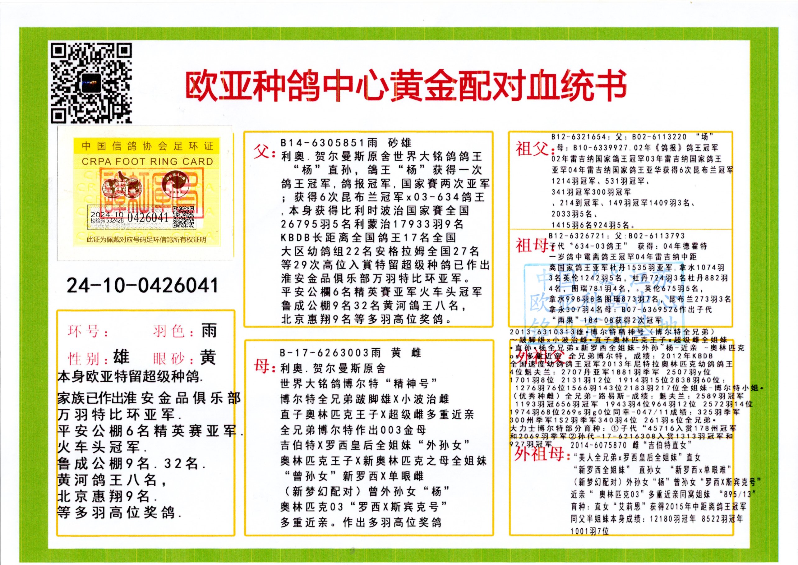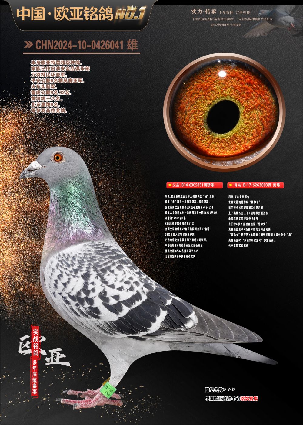 24年秋南京特比环欧亚荣获大团体冠军.小团体冠军551公里大特比13名.14名.16名.19名.20名.21名.24名.26名.27名.28名.42名.52名.54名.57名.65名.66名.68名.70名.71名.72名.74名.76名.80名.82名.83名.84名.85名.86名.90名.92名.110名.116名.121名.122名.128名.131名.158名.161名.164名.165名.166名.172名.174名.177名.182名.195名.196名.201名.205名.208名.210名.216名.253名.269名.275名.276名.294名.296名.299名,,24年秋云南天南铜都公棚决赛415名.天南铜都小棚决赛409名.云南玉活公棚决赛102名.490名.团体32名上笼二羽进二羽,天南铜都大棚506公里决赛445名。热烈祝贺河北省巨鹿县李兰生老师用欧亚泰山号血系连续十一年夺冠军,河北省国家赛冠军.全国季军等多次前十名高位,扬州王军王总用欧亚利奥24年春季获山东翔宇公棚决赛33名盖比53名。南京刘正龙刘总用欧亚盖比获得24年秋山东潍坊国际公棚决赛42名.精英赛30名.三关鸽王71名.决赛86名.加站赛16名.南京市特比环A组鸽王9名.B组鸽王5名.6名.C组鸽王5名.精英赛冠军4名.技能赛A组冠军4名.5名.秦淮区特比环荣获15名.46名.48名.87名。四川西昌徐亮徐总用欧亚利奥获得凉山州聚友决赛177名.第二关亚军双关鸽王19名.三关鸽王105名.云南豪庭公棚决赛603名。热烈祝贺24年四川重庆翔园鸽舍用欧亚泰山号荣获春季400公里冠军.秋季500公里冠军,河北王总用詹森X利奥获得千羽千翔公棚400公里冠军,广东蔡楷焕荣获24年秋爱好者 赛鸽俱乐部三关鸽王季军.一关420公里99名.二关450公里11名.三关520公里32名.单关季军.7名.12名,江西李卫兴荣获贵州红枫公棚8名.共翔俱乐部寄养棚四关综合鸽王30名.一关400公里78名.二关500公里55名.三关520公里37名.四关500公里57名.同父母获公棚18名.雷鸣获得武汉黄浦育翔中心冠军,四川陈文获得四川明鸿俱乐部300公里梦幻2名.3名.4名.9名.10名.13名.14名.15名.31名.34名.40名.41名.42名.43名.69名.71名.72名.73名.74名.94名.95名.97名.98名.99名.419公里决赛荣获总冠军7名.总共归巢9羽,四川徐亮获豪庭决赛603名,山西郑勇获得山西泰鑫公棚决赛255名詹森红狐,热烈祝贺马总获得开尔(飞跃队)决赛9名获奖金1310000万元.第一关52名,天津津福资赛180公里96名.获奖金429543万元,欧亚支持全国鸽友24年秋多人报喜 祝大家取得更好成绩,给欧亚报喜鸽友欧亚决定给每人赠送一羽超级种鸽。欧亚俱乐部特比环多关鸽王成绩:15年秋淮安特比环黑色星期一全会上笼9700多羽,当天无鸽归巢,第二天全会归巢357羽,本舍归巢158羽.前十名八羽.前一百名归巢57羽,16年春季获五关鸽王总冠军,总亚军四名.六名.七名.九名.十名.晶艺俱乐部520公里冠亚季军5名.6名.7名.9名.11名等,火车头冠军.季军6名.8名.9名.10名,16年秋晶艺俱乐部特比环520公里亚军.季军4名.6名.7名.9名,15年春南京白下特比环冠军.亚军.季军6名.7名.8名.9名.10名.指定鸽A B组获得冠军.亚军.季军4名.5名.,17年淮安特比环亚军.4名.5名.7名.8名.10名.六关鸽王总冠军.4名.6名.9名.10名,寄养棚宿迁刘总20羽特比环获冠军.季军.4名.7名.8名.9名等。18年荣获万羽特比环六关鸽王总冠军.总亚军.总季军.6名.8名.十名.单关四羽冠军.二羽亚军.四羽季军.前十名27羽。19年秋万羽特比环六关鸽王总亚军.总季军.5名.8名等,单关二羽冠军.三羽亚军.一羽季军前十名31羽。20年秋淮安市鸽会四关特比环大赛风雨无阻鸽王亚军.鸽王六名,金品俱乐部万羽特比环六关鸽王总冠军,总亚军.四名.五名.六名.七名.八名.十名.前二百名鸽王35羽,单关冠亚季军前十名四十多羽,火车头五关鸽王季军.六名.八名.前二百名鸽王十七羽。20年春荣获淮安五区一市四关鸽王总冠军.亚军.四名.八名.九名。21年秋荣获金品万羽特比环大赛六关鸽王总亚军.总季军.四名.七名.九名.十名.单关冠亚军季军前十名三十多羽。火车头协会鸽王六名.七名.十名.单关前十名十七羽。22年秋荣获鸽王总冠军.总亚军.5名.7名.8名.9名.11名.单关冠亚季军前十名三十多羽,第一关单关前二百名四十多羽,第二关前二百名三十多羽,第三关前二百名四十多羽,第四关前二百名四十多羽,第五关前一百名53羽。23年秋荣获鸽王季军.五名.八名.十名.13名.17名.20名.27名等多羽鸽王.单关前十名二十多羽。公棚.寄养棚部分成绩:16年秋宁夏黄河公棚总冠军电脑戈马力指定通炮冠军,17年送八羽参赛获得鸽王八名进奖四名,支持韩总荣获八名。支持鸽友荣获宁夏中卫公棚决赛总冠军.精英赛冠军,支持18年宁夏黄河公棚决赛冠军詹森X泰山。安徽鼎博寄养棚院内外四关鸽王总冠军.鸽王十七名.三十七名同窝,鸽王39名.42名.58名.67名。18年山东公棚预赛冠军.决赛65名.送八羽进奖五羽.指定获奔驰汽车一辆。支持鸽友获得云南蓝云公棚冠军.盖比X佛卡门。支持鸽友荣获云南银集公棚决赛冠军 詹森427X520血系 速度赛6700羽冠军。17年荣获金马俱乐部寄养棚四关鸽王总冠军.季军.六名.八名.第一关冠军.亚军.季军四名.七名.十一名.金牌教练奖。支持鸽友18年北京费翔公棚预赛九名电脑X桑杰士,支持鸽友荣获陕西威力公棚决赛11名.内蒙古临河寄养棚四关鸽王六名.詹森配泰山,支持河北王总用欧亚詹森427配胡本喜获20年秋开尔青年棚季军。云南东荣公棚16年预赛冠军.决赛77名.17年决赛12名.詹森红狐X泰山,17年平安公棚决赛4名 詹森427。欧亚获得21年金母寄养棚第一关四名.第二关5名.第三关5名.6名.7名.10名.三关鸽王总冠军,四关鸽王14名.十羽鸽王。支持河