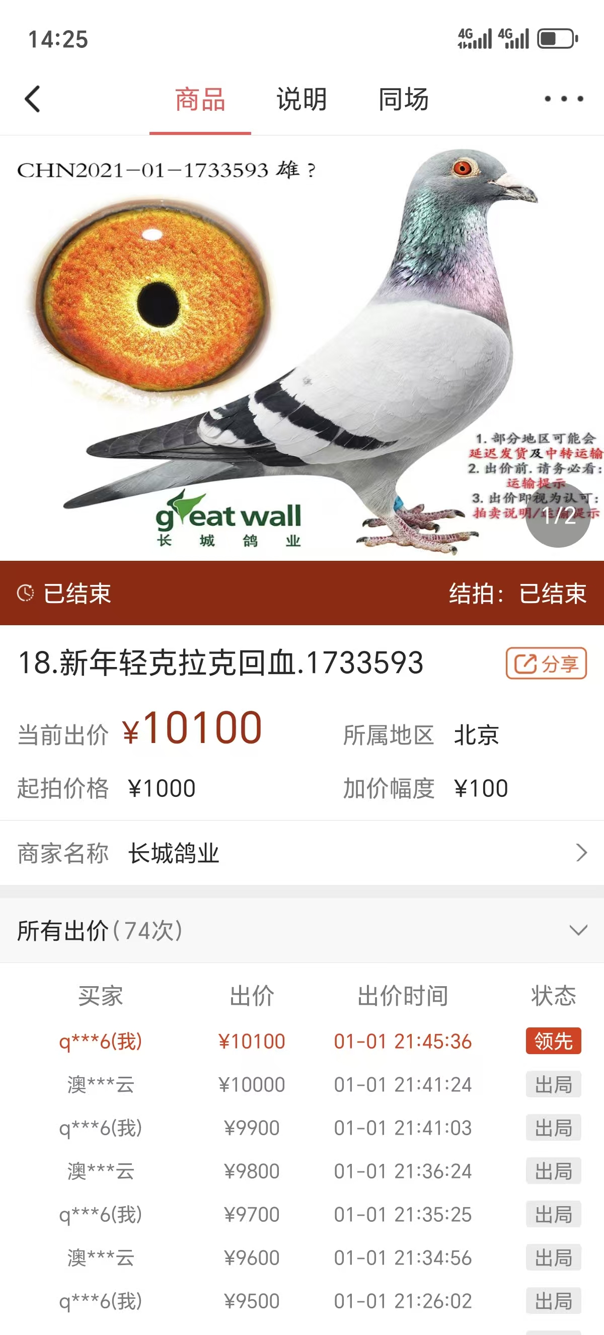 1656990 长城:开创鸽王76直子638 ¥400元 2次