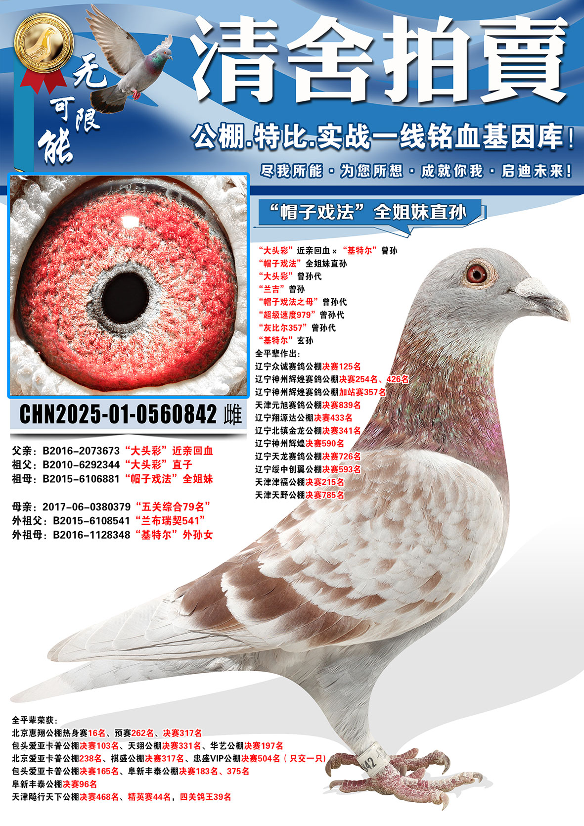 所有拍卖鸽全部血统真实!!个人鉴鸽观点不一,飞不飞天上见.血统成绩第一
