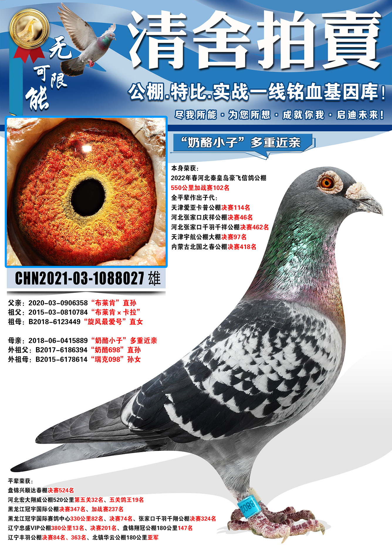 所有拍卖鸽全部血统真实!!个人鉴鸽观点不一,飞不飞天上见.血统成绩第一