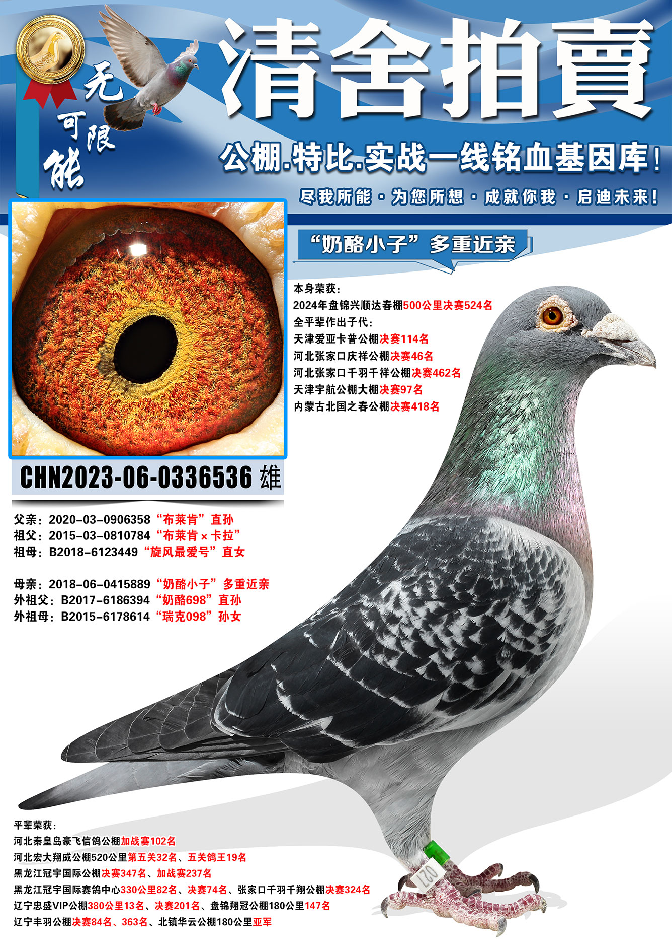 所有拍卖鸽全部血统真实!!个人鉴鸽观点不一,飞不飞天上见.血统成绩第一