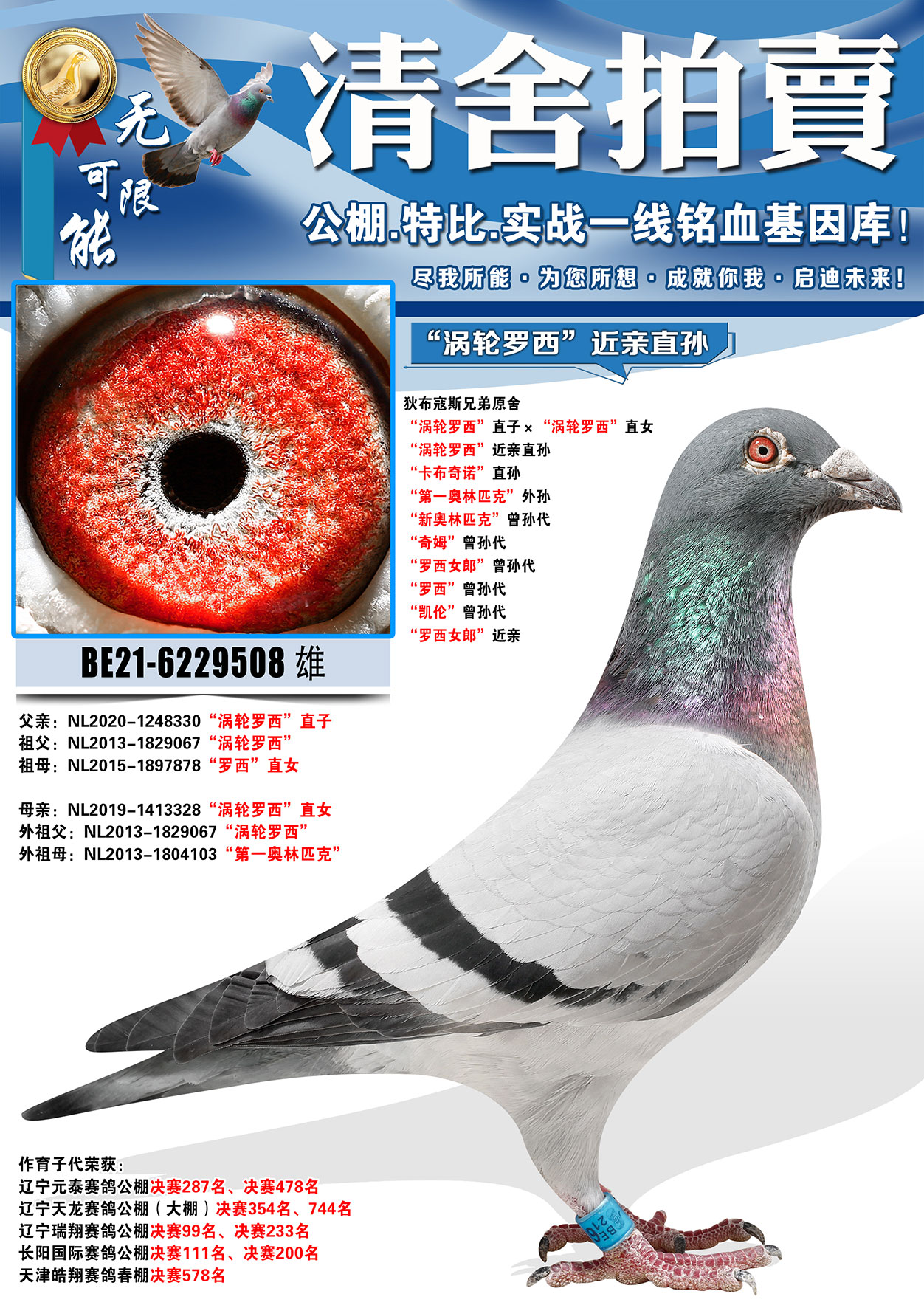 所有拍卖鸽全部血统真实!!个人鉴鸽观点不一,飞不飞天上见.血统成绩第一