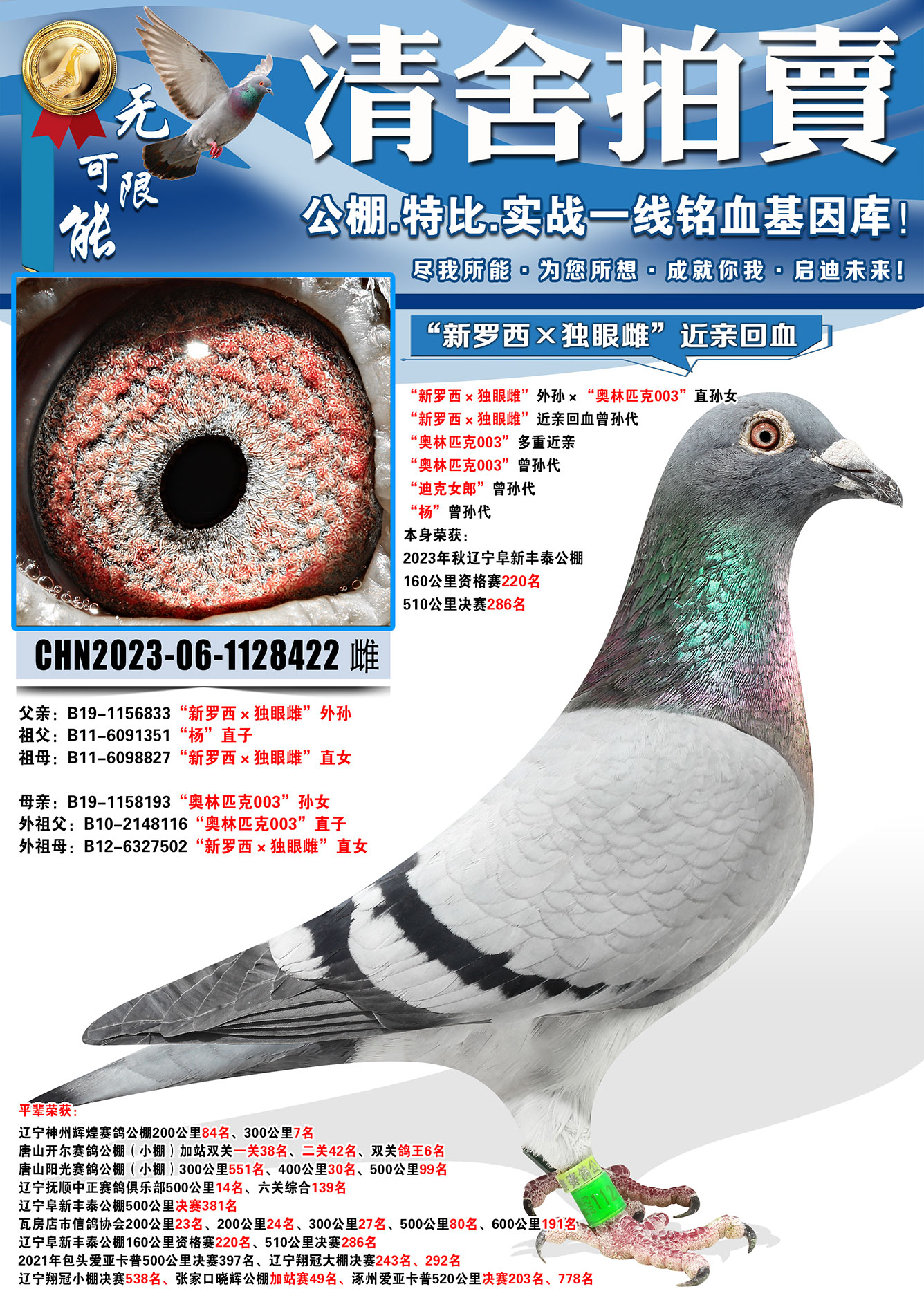 所有拍卖鸽全部血统真实!!个人鉴鸽观点不一,飞不飞天上见.血统成绩第一